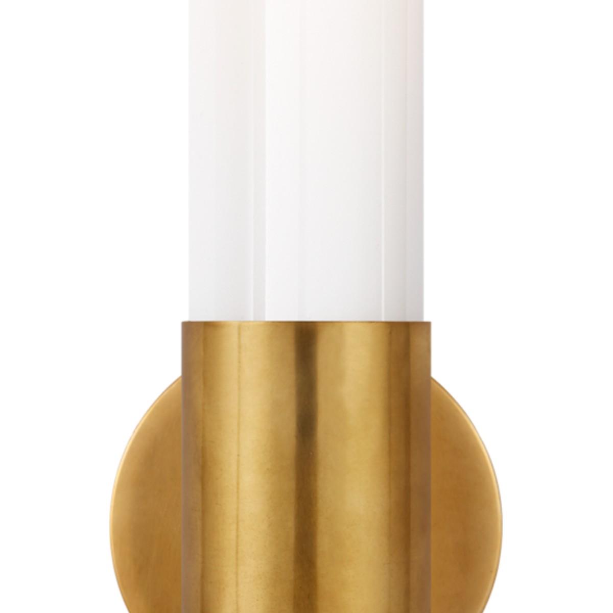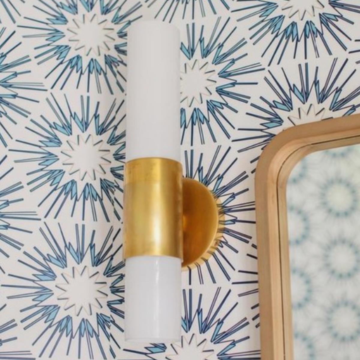 Penz is a cylindrical white glass wall light designed by AERIN. The contrasting finishes exude juxtaposing old-world glamour and European mid-century design. With a modern look, Penz suits a contemporary living room or hallway.