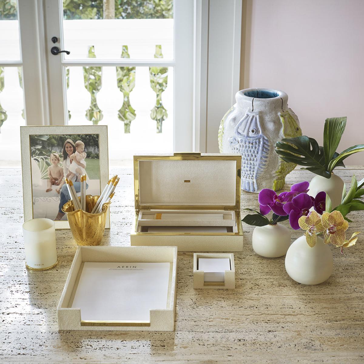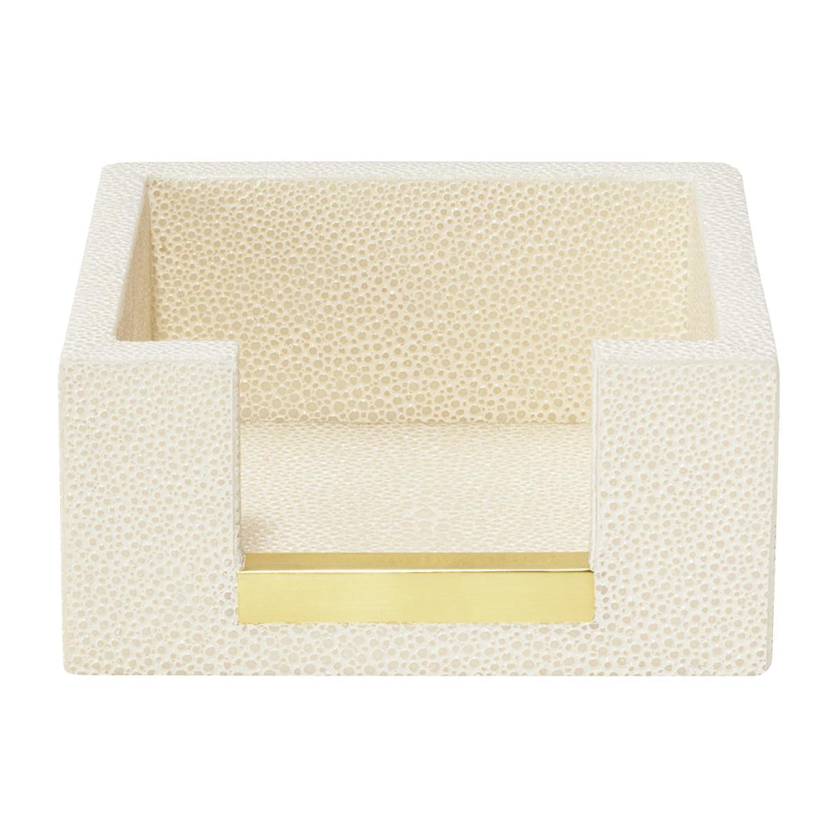 Keep your daily to-do lists and notes neatly stacked with this Shagreen memo paper holder from AERIN. An effortlessly stylish desk accessory, it features a shagreen embossed finish in a soft cream colour and makes a chic addition to your home office or study space. Key features: * Memo paper holder * Material: shagreen, brass, suede * Dimensions: H5xW10xD10cm * Shagreen embossed finish * Cream colour * Brass hardware * Suede lining * Keep out of direct sunlight to avoid fading