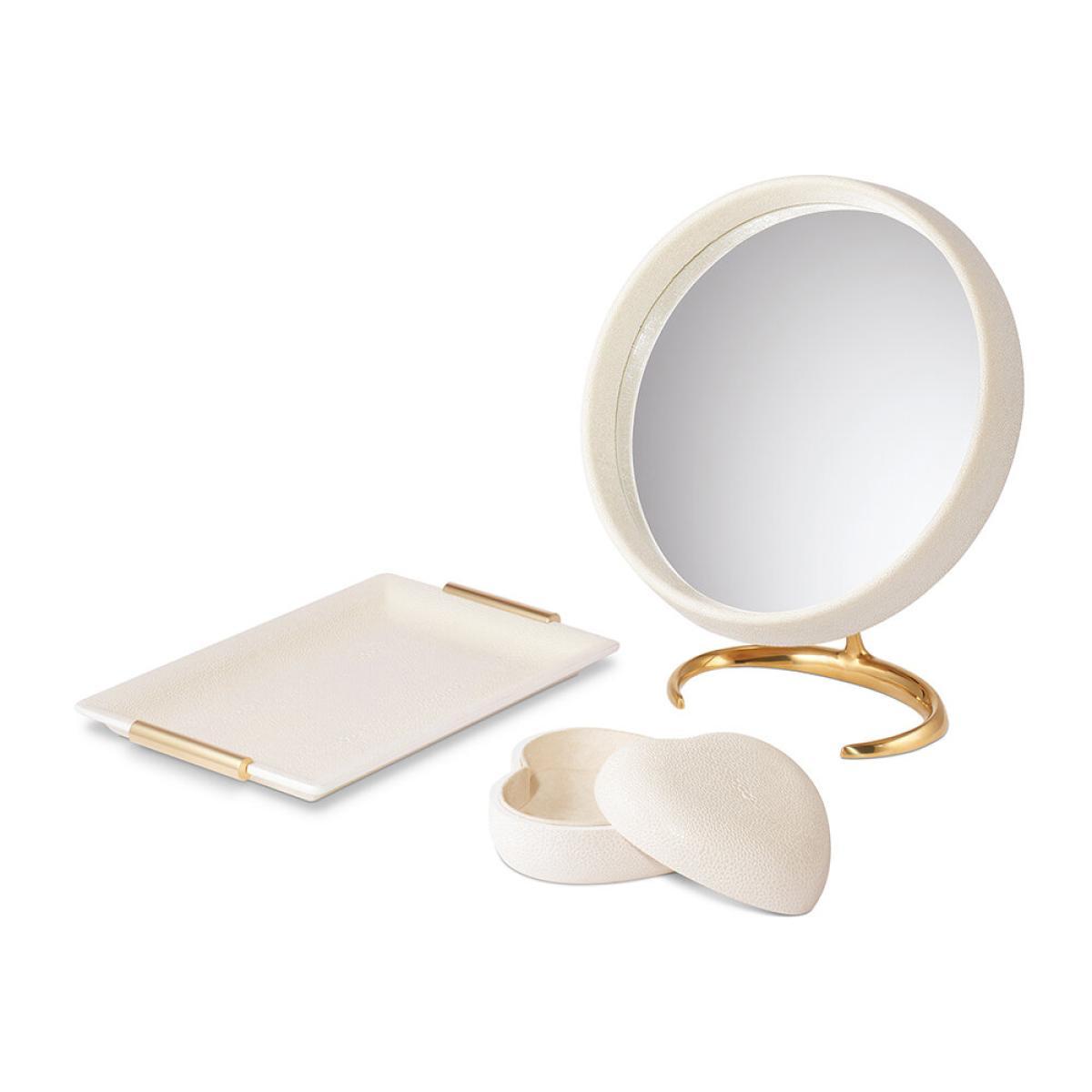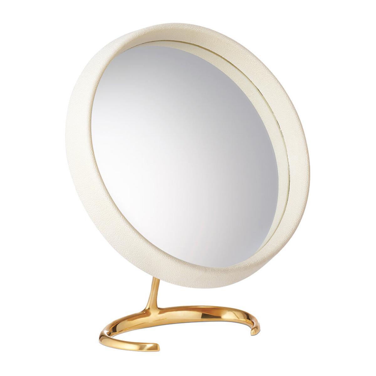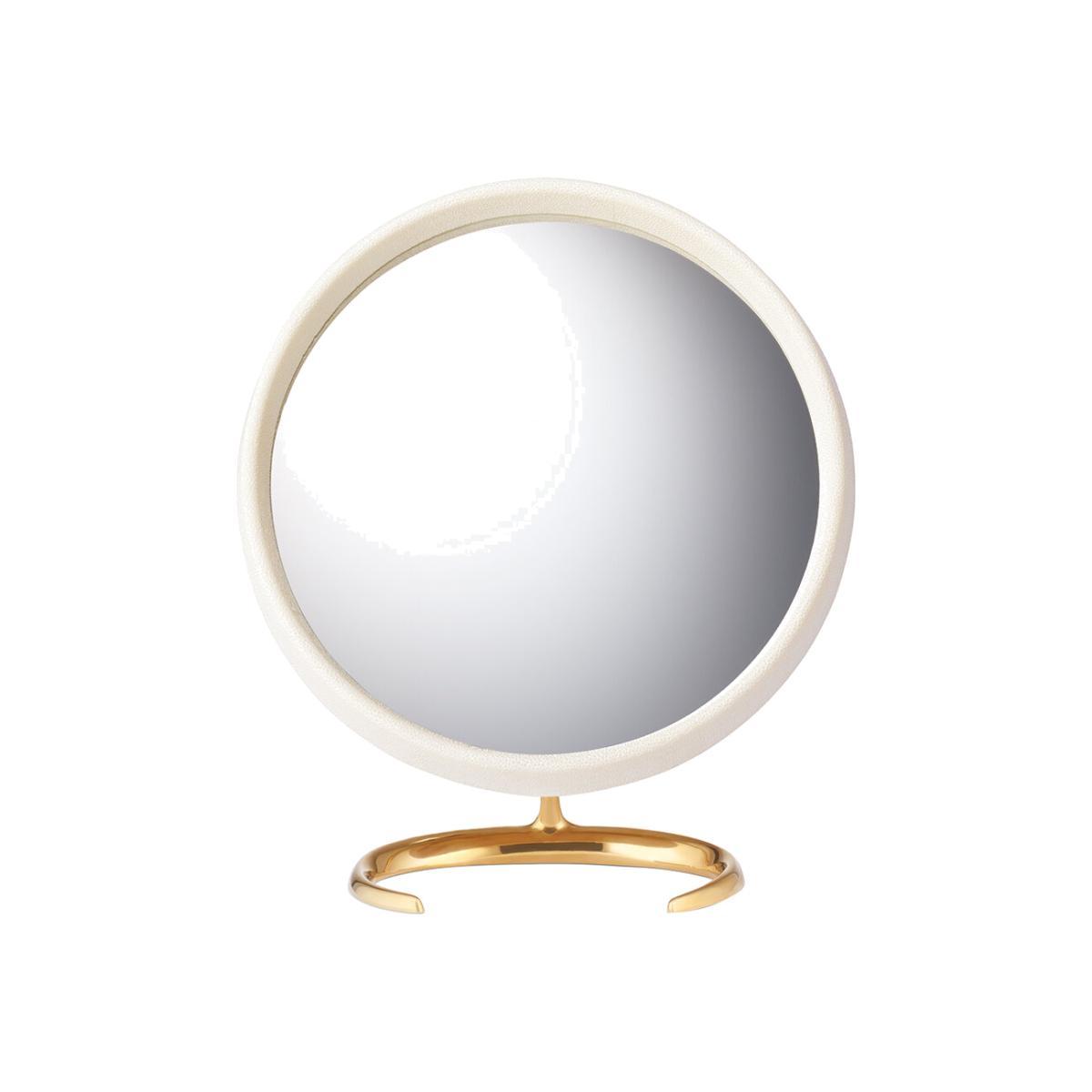 Take a good look into this mirror from AERIN. Inspired by Scandinavian design, this circular vanity mirror is round in shape with embossed shagreen and suede lining. Complete with a swivel hinge arching brass base, it's perfect for placing in the bedroom or bathroom. Key features: * Material: shagreen, brass, glass, wood, suede * Dimensions: H28xW25xD13.5cm * Scandinavian inspired design * Swivel hinge * Curved shape * Arching brass base * Wipe clean with a damp non-abrasive cloth