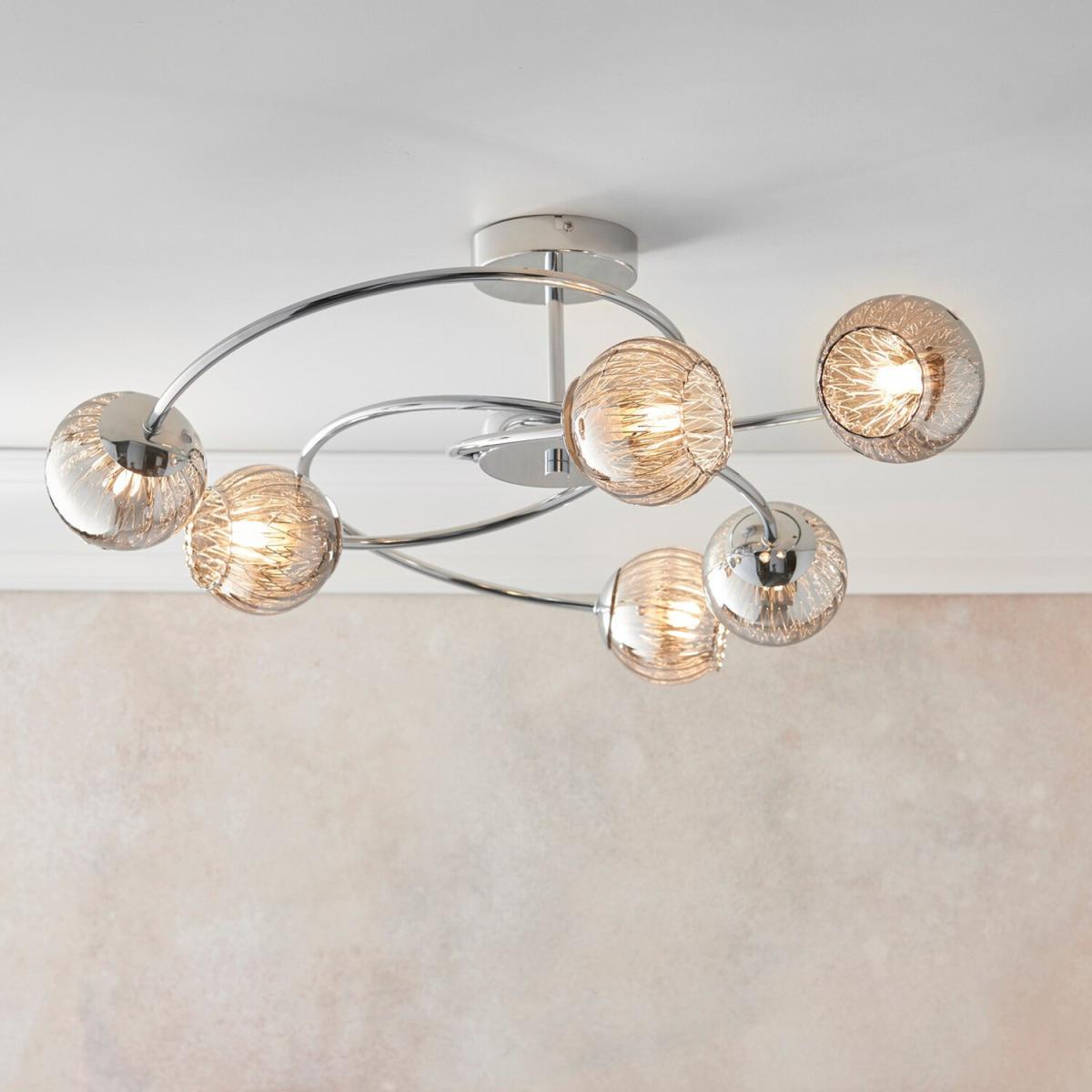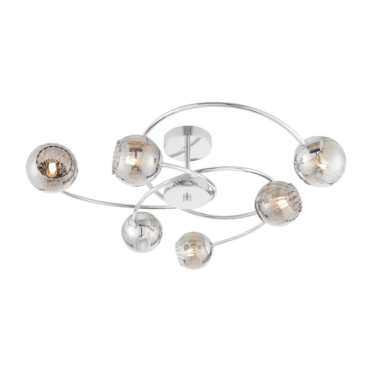 The 6 light semi flush fitting is finished in a shiny chrome effect plate. The shades are made from a smokey mirror effect glass which houses wire mesh to create a stunning light effect. Dimmable and compatible with LED lamps. Matching items available.