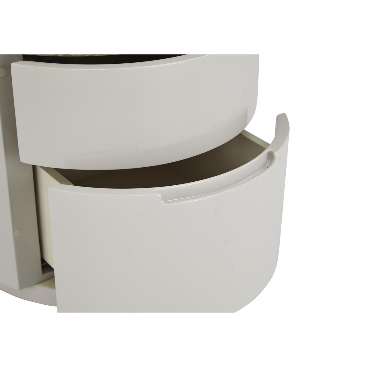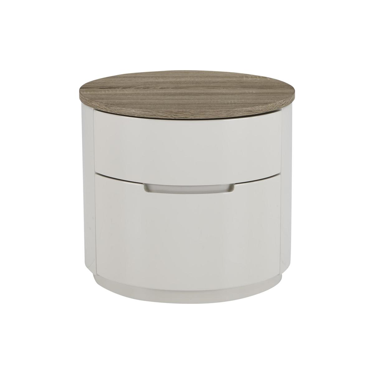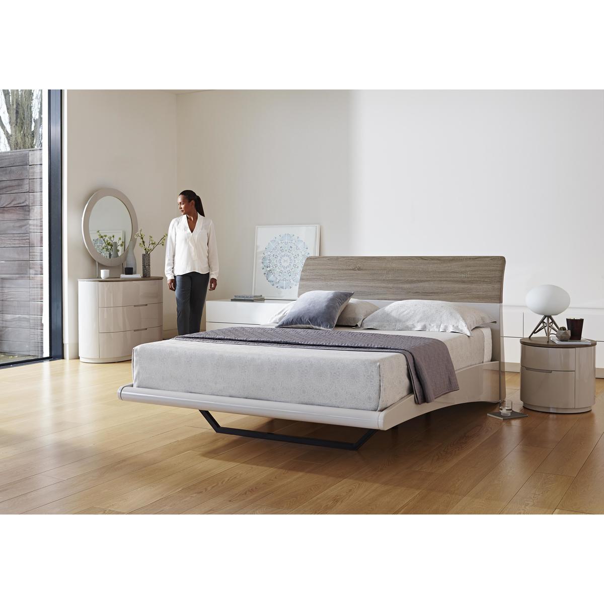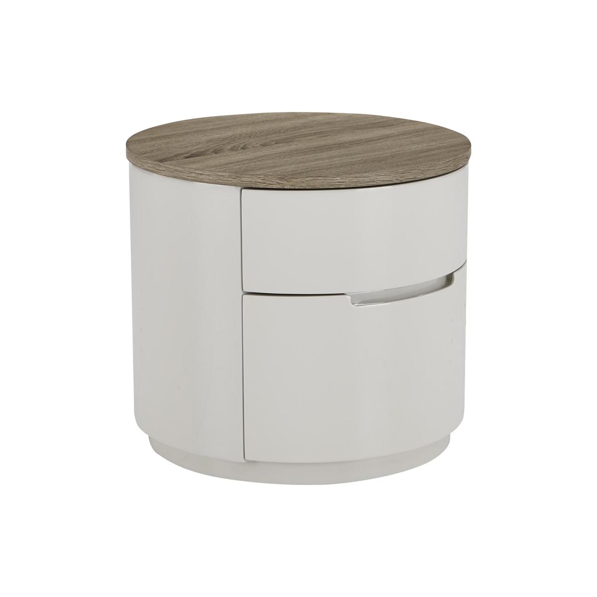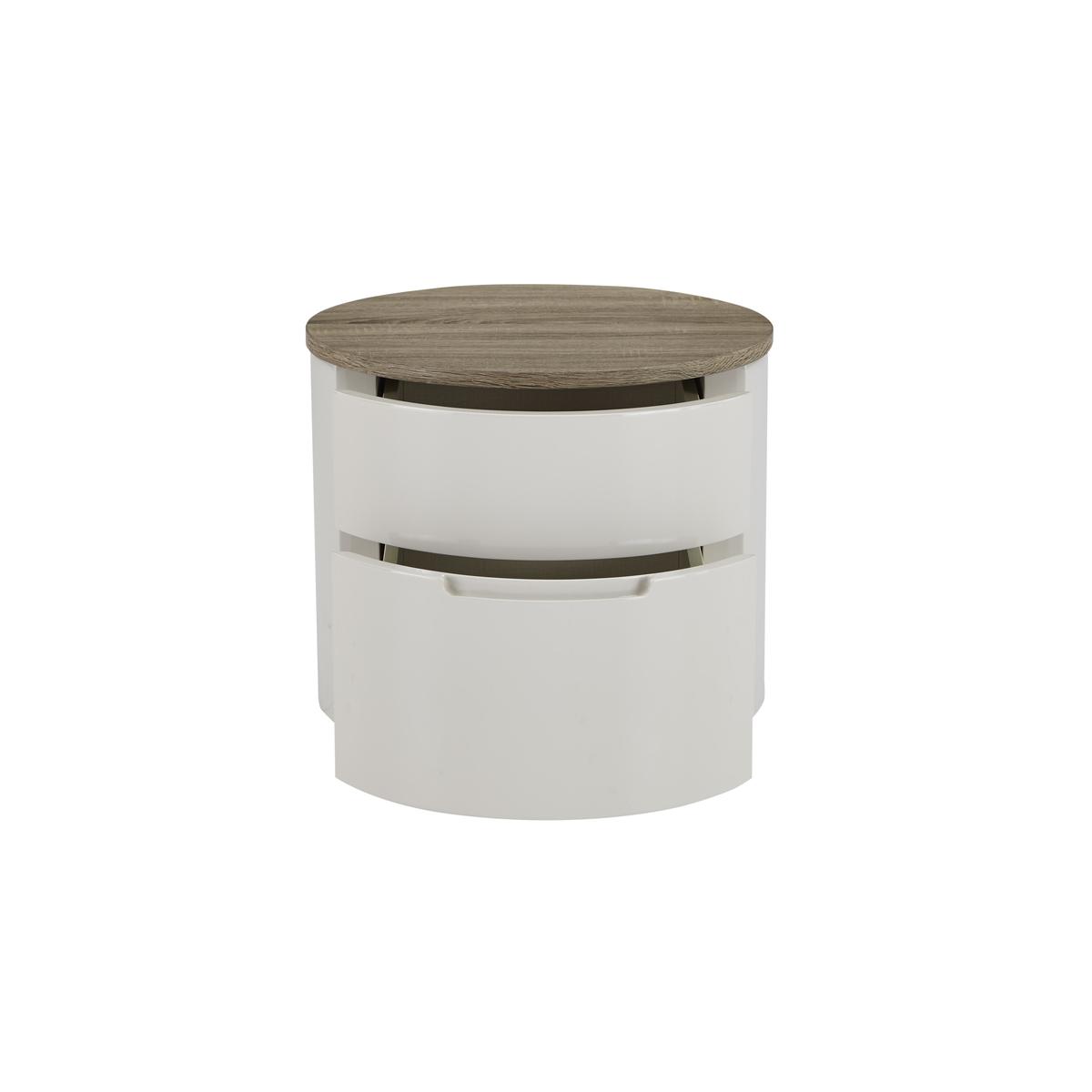 The breathtaking Aero bed seems to float in mid air, thanks to its ingeniously designed frame. Like every piece in the Aero contemporary bedroom collection, it's glamorous, modern and stylish and pays tribute to Art Deco with clean cool curves and inset handles. With a glossy cashmere lacquered finish and sleek Havana oak effect veneers. Exclusively designed for Furniture Village. Perfectly round, the Aero bedside table draws inspiration from the sleek curves and tactile shapes of Art Deco furniture. The combination of luxurious cashmere gloss lacquered finish and oak-effect top gives this piece a contemporary feel and ensures that it’ll be perfectly at home in your modern, minimal bedroom. It’s functional too. The two roomy drawers – one deeper, one shallower – have simple inset handles. Sophisticated and glamorous, the Aero bedside table is part of the stunning Aero range of bedroom furniture. It pairs perfectly with the curvaceous Aero bed frame and coordinates with the range’s storage pieces – the Aero tall chest and the Aero dresser. Did you know?. Hairline marks are a natural feature of this furniture's beautiful, high gloss finish.
