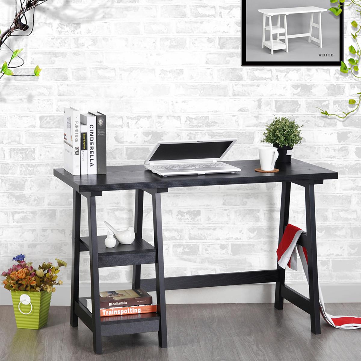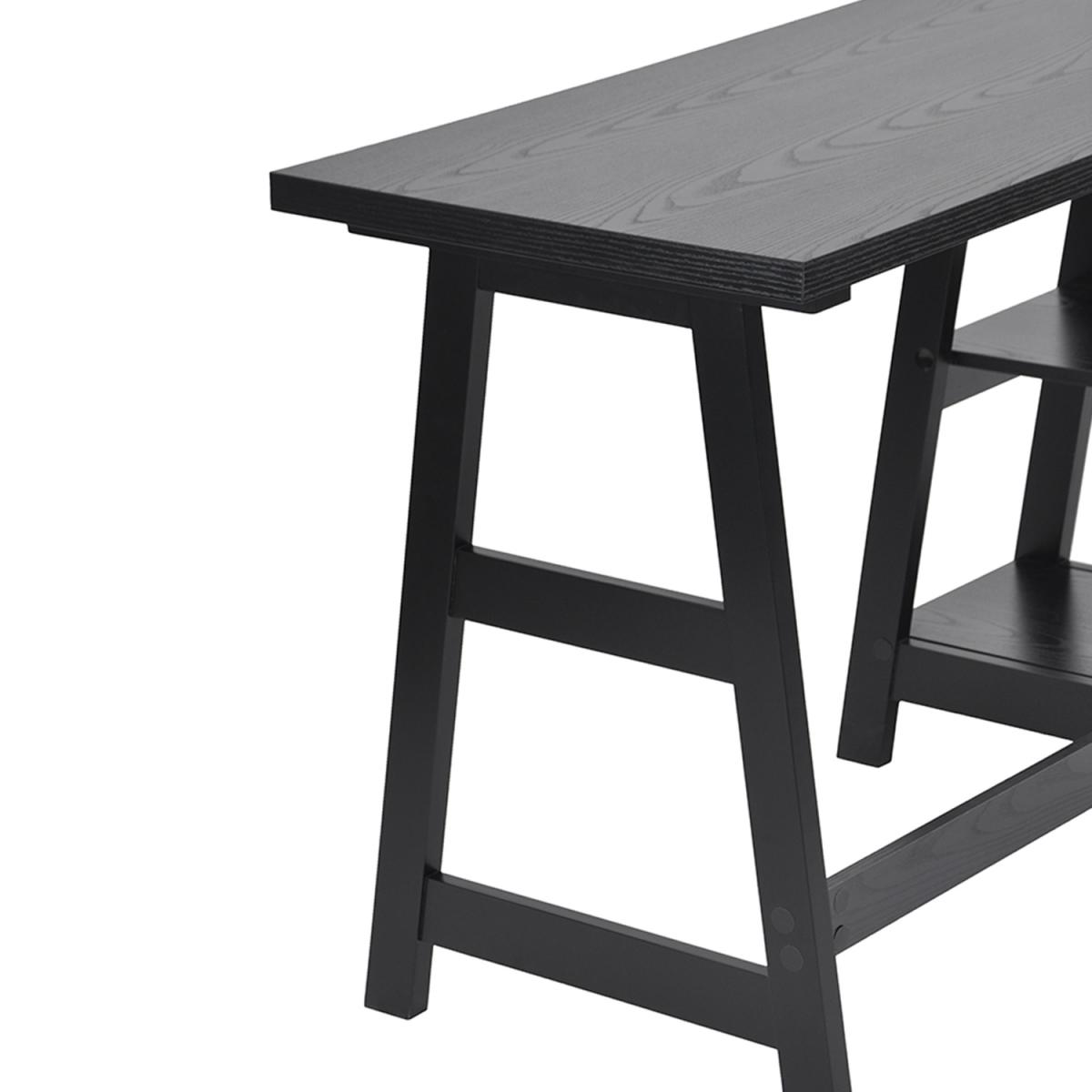 This desk has 2 shelves for storing writing materials and other office supplies and keeping the table clutter-free. The black finished table top and table legs create a fashionable appearance while commercial grade materials promise to withstand the rigors of everyday use.