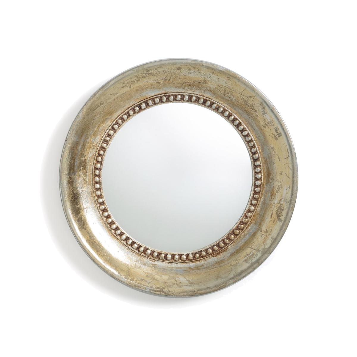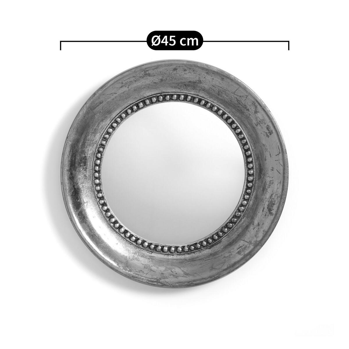 Afsan round mirror with aged effect gold painted finish. Full of vintage charm, this antique style mirror has a pearlised finish that recalls aged metal pieces, and a delicate beaded trim. Product Details • Solid mango wood covered with a golden paint with an aged finish • Black painted MDF • Beaded trim • 1 hook for wall mounting (screws and plugs not supplied)Dimensions • Diameter: 45cm • Thickness: 4cm • WOOD FROM SUSTAINABLY MANAGED FORESTS. FSC® certified wood comes from forests that are environmentally, socially and economically well managed. Parcel Dimensions1 parcel • 52 x 52 x 10cm • 3.5kg