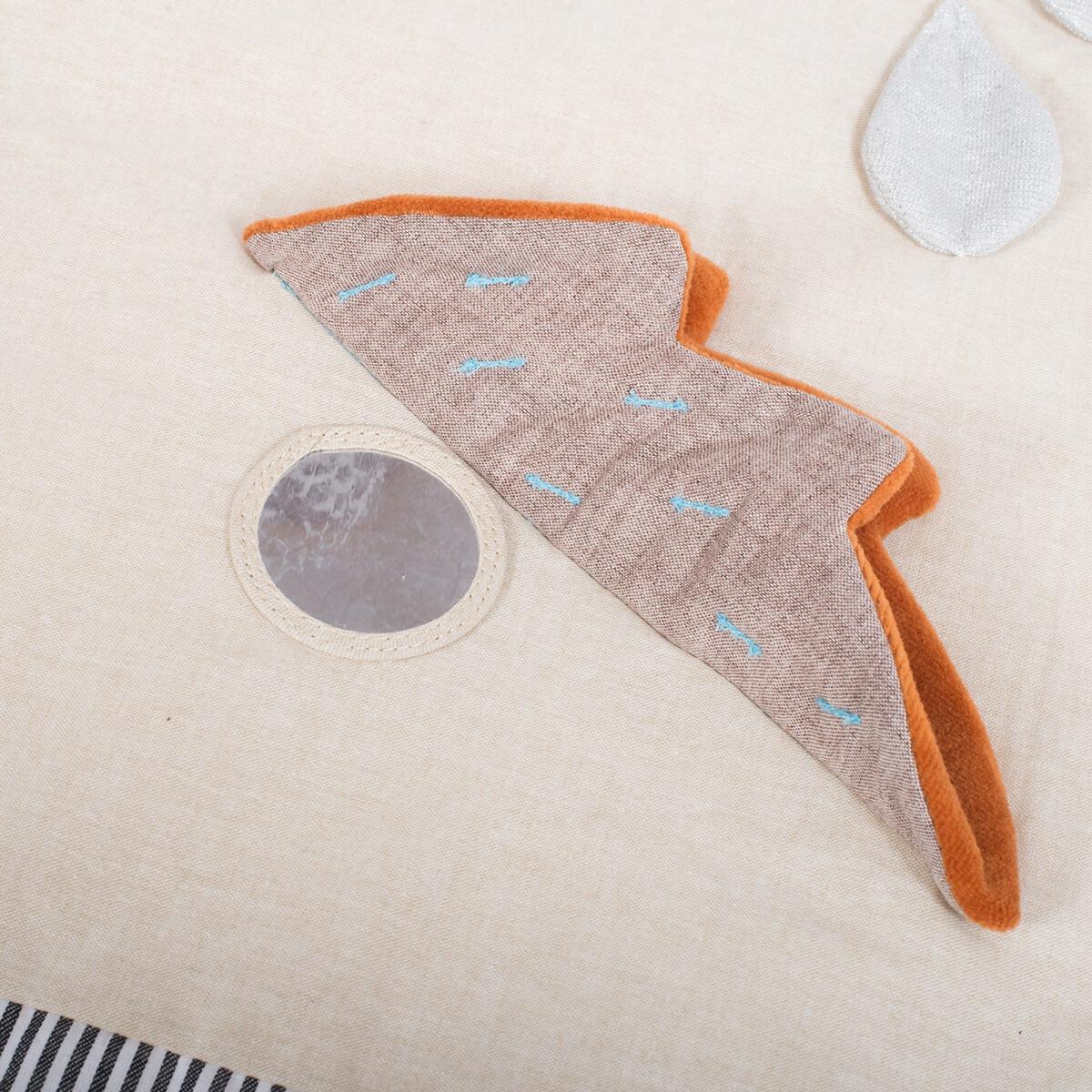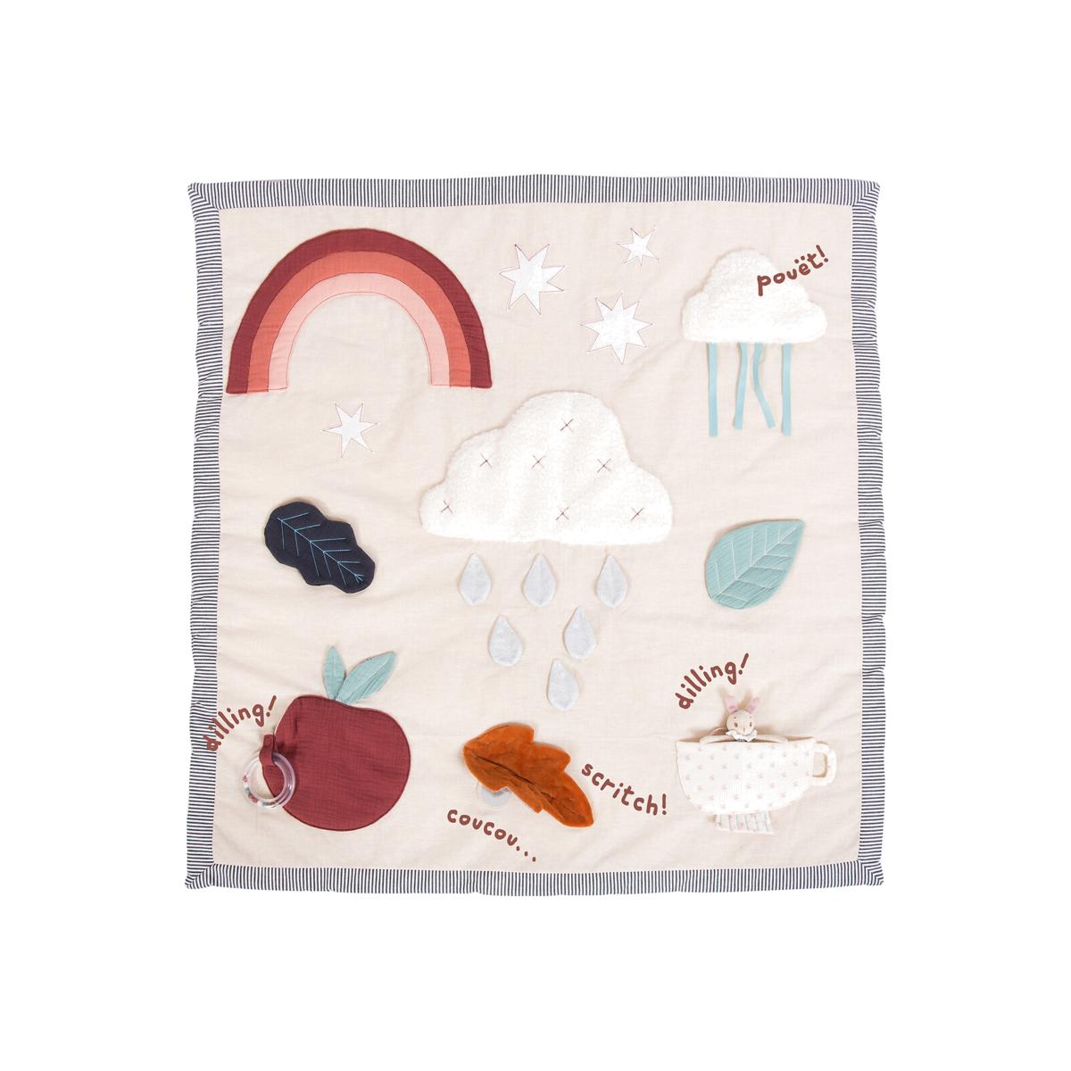 Fleece rug in chambray fabric with many activities in fall colours. Textured leaves, a sweet rabbit in its cup of tea, a ball ring hidden in the apple and lots of materials to discover with the weather! Dimensions: 51 x 15.5 x 51cm. Age: Suitable from birth
