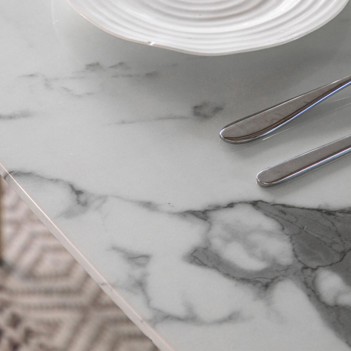 With a sophisticated faux marble glass top with delicate veining, this rectangular table feels beautifully opulent. Gold coloured polished legs add a luxe feel. Perfectly suited to contemporary or vintage glamour inspired spaces, this table is sure to prove a talking point at your next dinner party. Product details. Seats 6 Faux white marble glass table top Gently curved corners Polished gold metal legs Partial assembly required - legs / feet only. Product Composition - Iron / Glass Product Dimensions - 75 cm x160 cm x90 cm , Weight - 40 KGClearance to floor- 74 cm Parcel 1 Packaged Dimensions - 170 cm x 100 cm x 5 cm, Weight 35 kg Parcel 2 Packaged Dimensions - 82 cm x 21 cm x 11 cm, Weight 9 kg. This product will be dispatched by one of our trusted suppliers. You’ll be contacted by their selected courier about your delivery. Please note: this product cannot be delivered to all Offshore Islands, Northern Ireland or Republic of Ireland. GALLE01