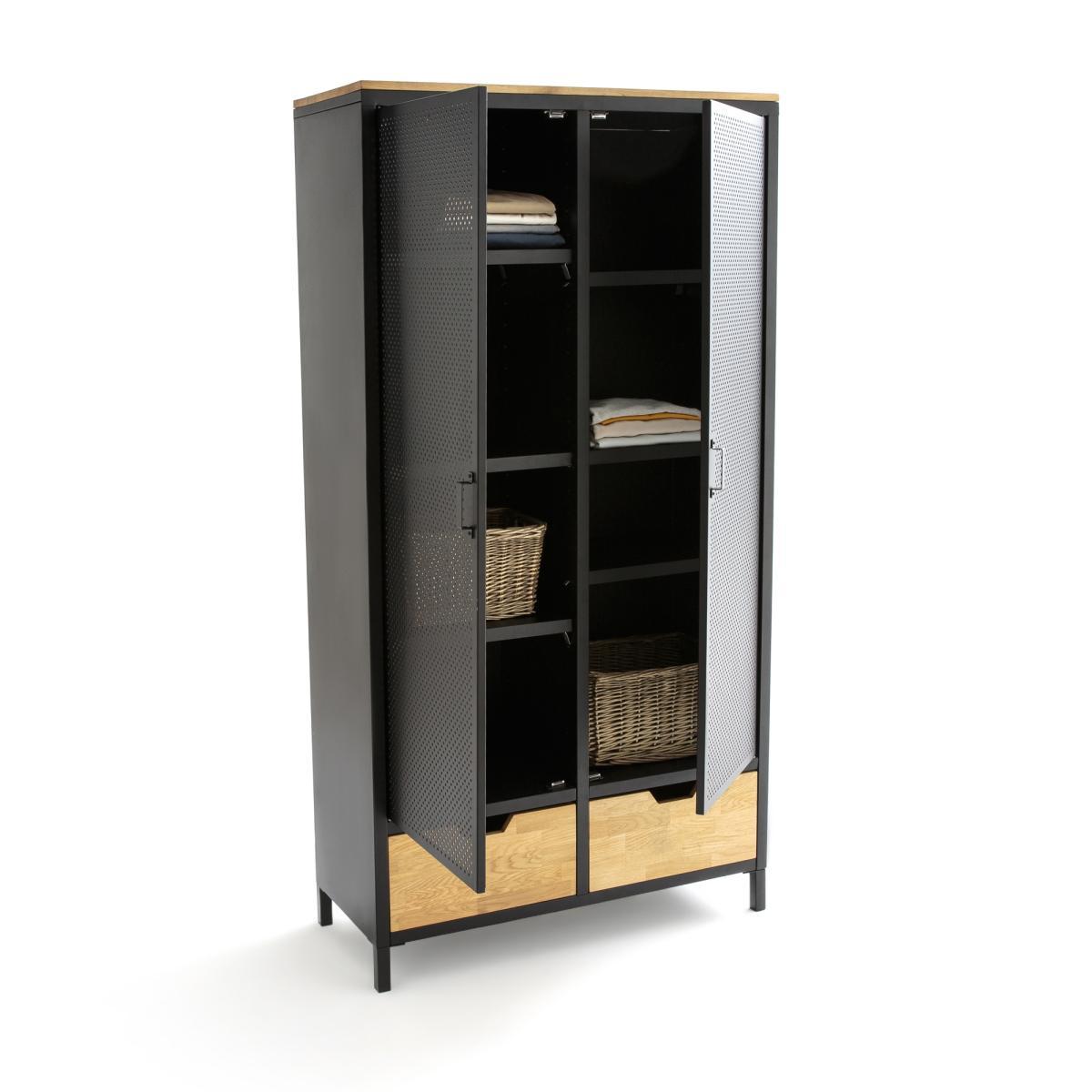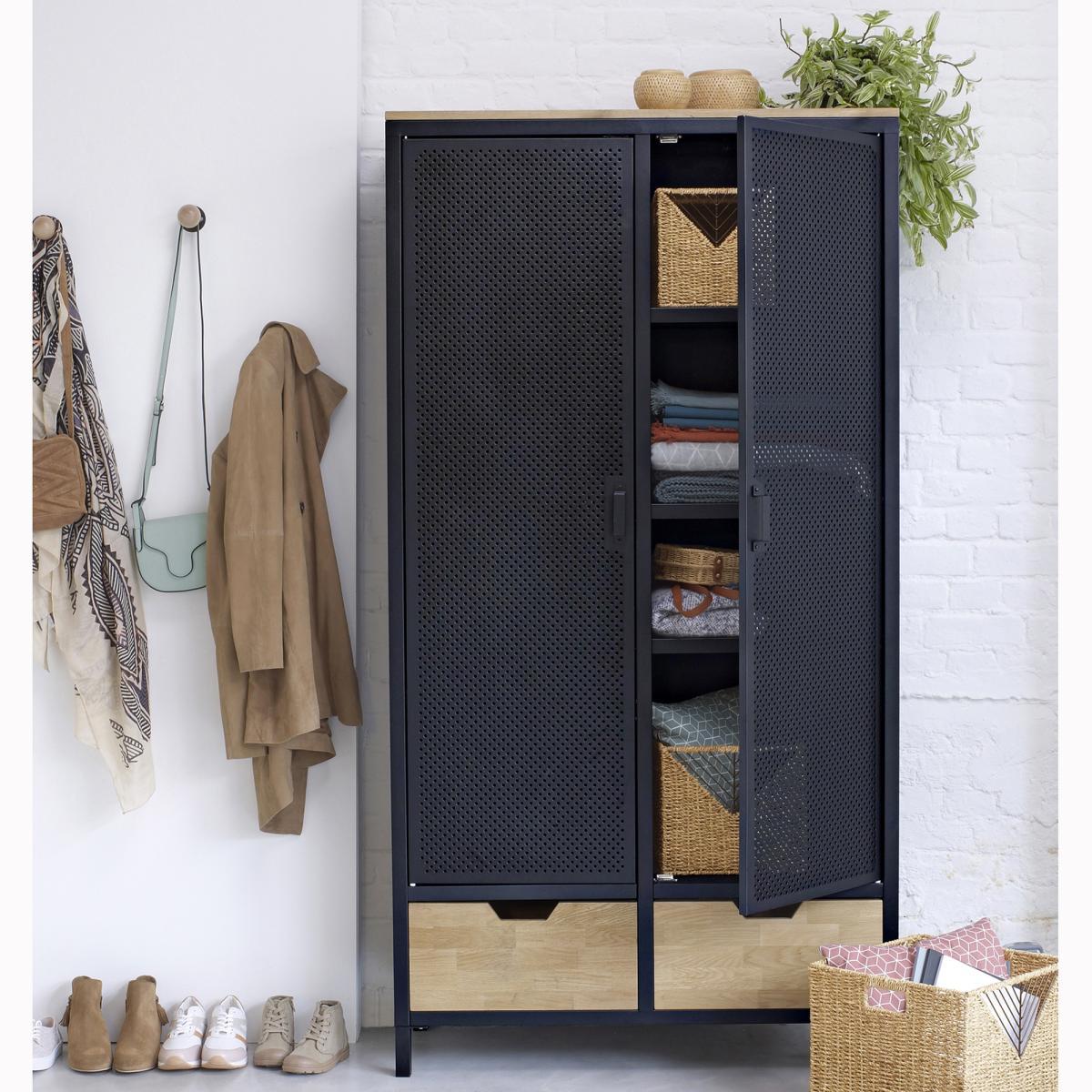 I love this wardrobe because of its versatile blend of industrial metal and warm oak, which makes it a great anchor piece in both contemporary and minimalist interiors. It works well in spaces that balance raw, edgy elements with natural textures, such as modern urban apartments or rustic schemes. For styling, consider pairing it with neutral bedding and simple accessories to let the cabinet’s contrasting materials stand out. To add visual interest, try placing a statement lamp or a stack of textured baskets nearby. This piece is not only functional but also serves as a statement on its own, making it perfect for those seeking practical storage with a touch of modern craftsmanship.