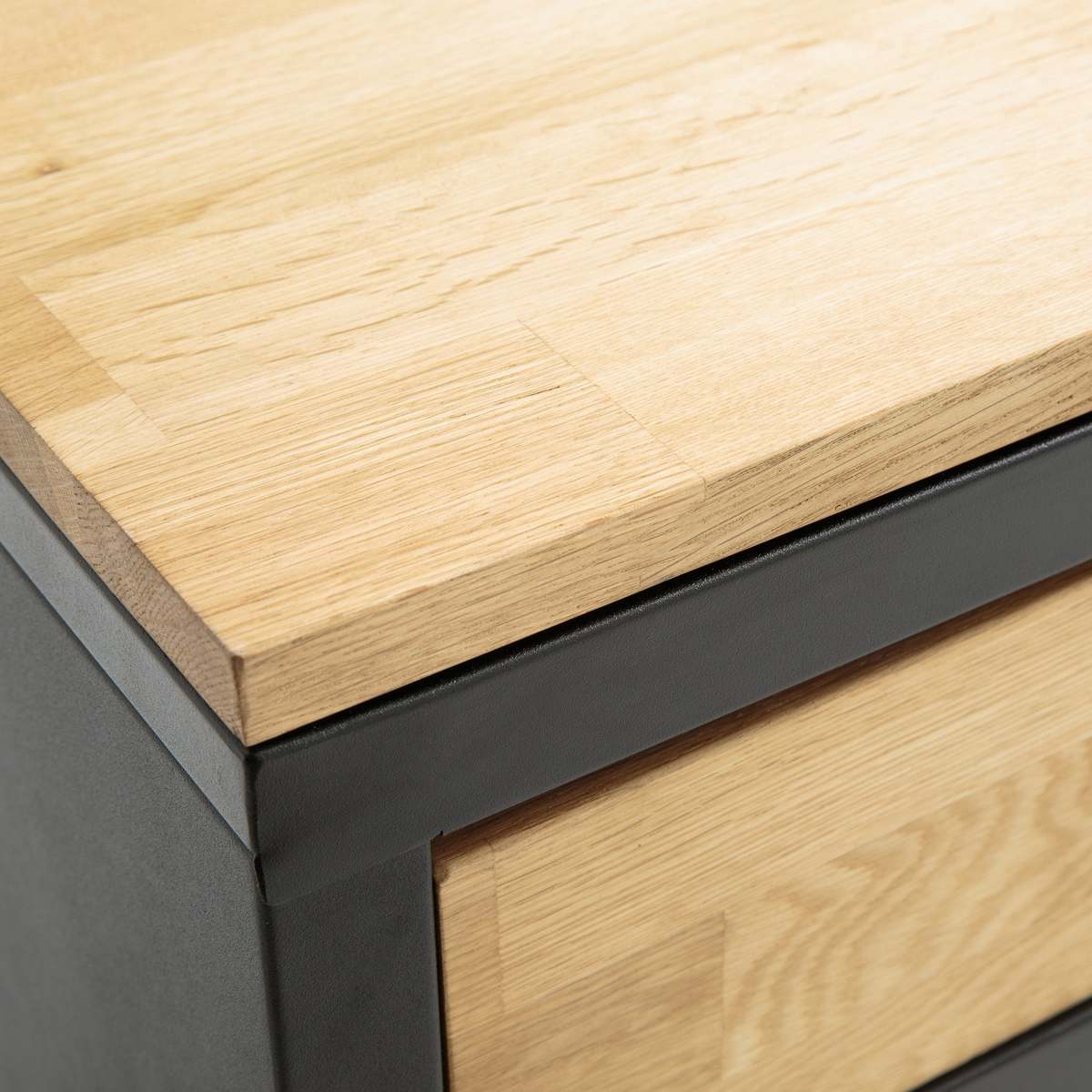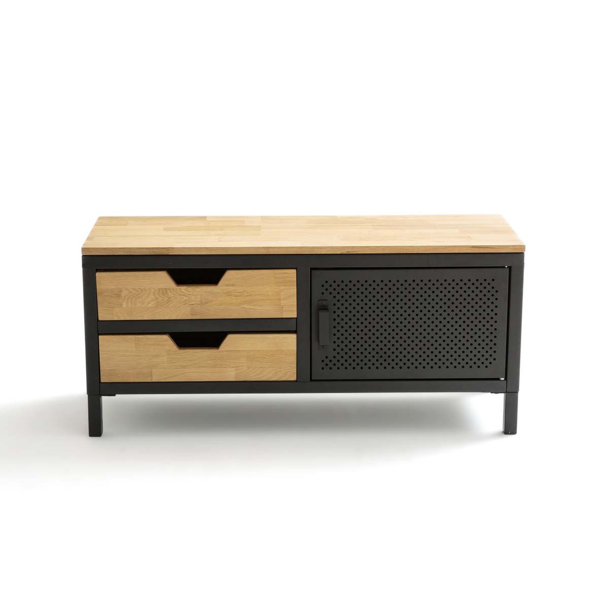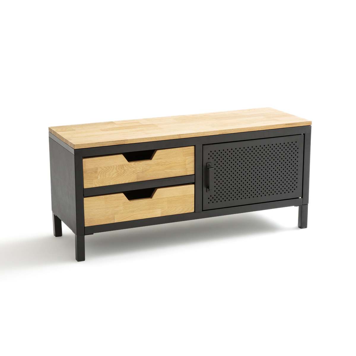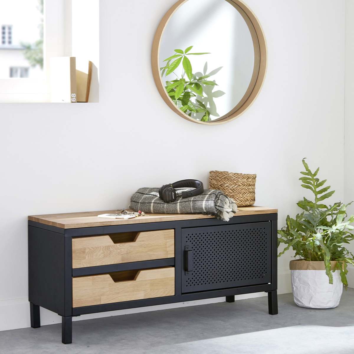 With its metal structure, the Agama entrance bench brings an "industrial" touch to your interior and a touch of warmth thanks to its upper plate and its 2 solid oak drawers.. A perfect combination of materials, super trendy!