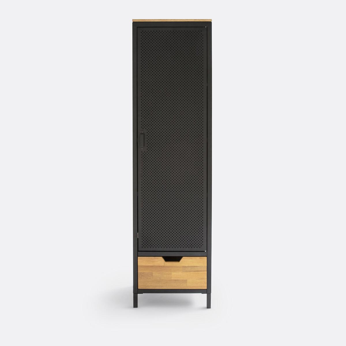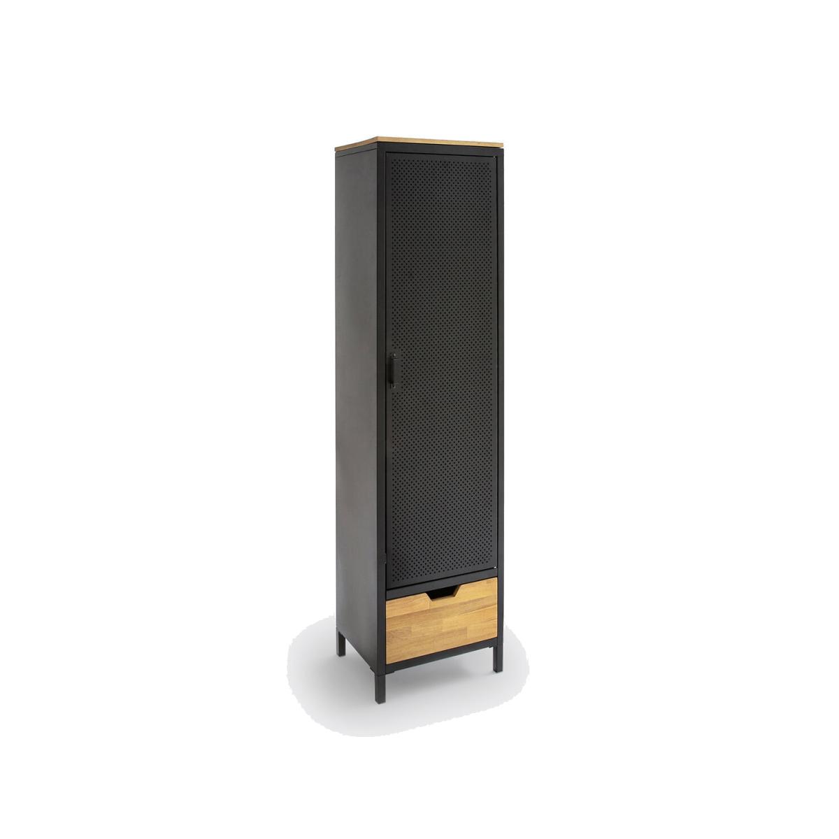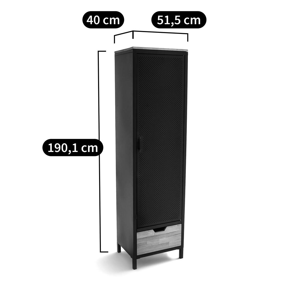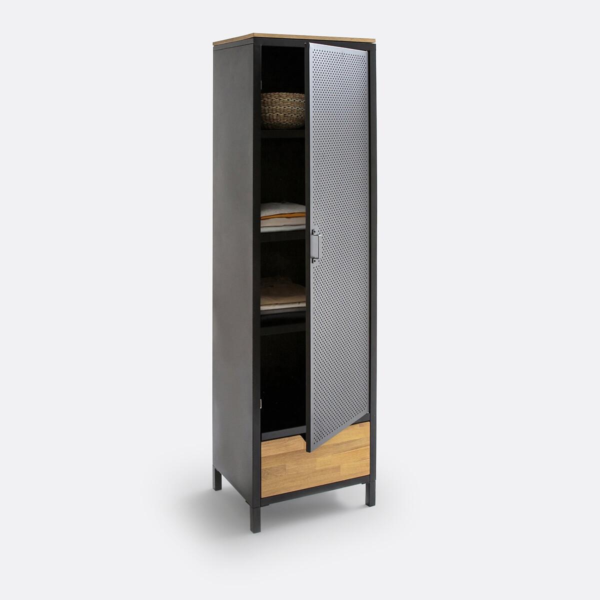 With its black metal structure, the Agama 1-door wardrobe brings an industrial touch to your interior and a touch of warmth thanks to its solid oak top and drawer. A great combination of materials for a modern look!Product Details • 1 openwork door • 1 drawer • 4 shelves : 3 adjustable and 1 fixed at the bottom • Structure and handle in black steel metal, epoxy finish, matte effect • Drawer structure in solid pine with matt effect nitrocellulose finish • Top and drawer front in solid butted oak, nitrocellulose finish. Dimensions • Width 51.5cm • Height 190.1cm • Depth 40cm. Drawer dimensions: • W42 x H20.2 x D34.5cmDelivery:. Assembly required. Available for home delivery. Note! Please check that all access points are large enough to accommodate your delivery (doors, stairs, lifts). • WOOD FROM SUSTAINABLY MANAGED FORESTS. FSC® certified wood comes from forests that are environmentally, socially and economically well managed. Parcel Dimensions: • 1 parcel • 188 x D51.5 x H14cm. 38.5kg