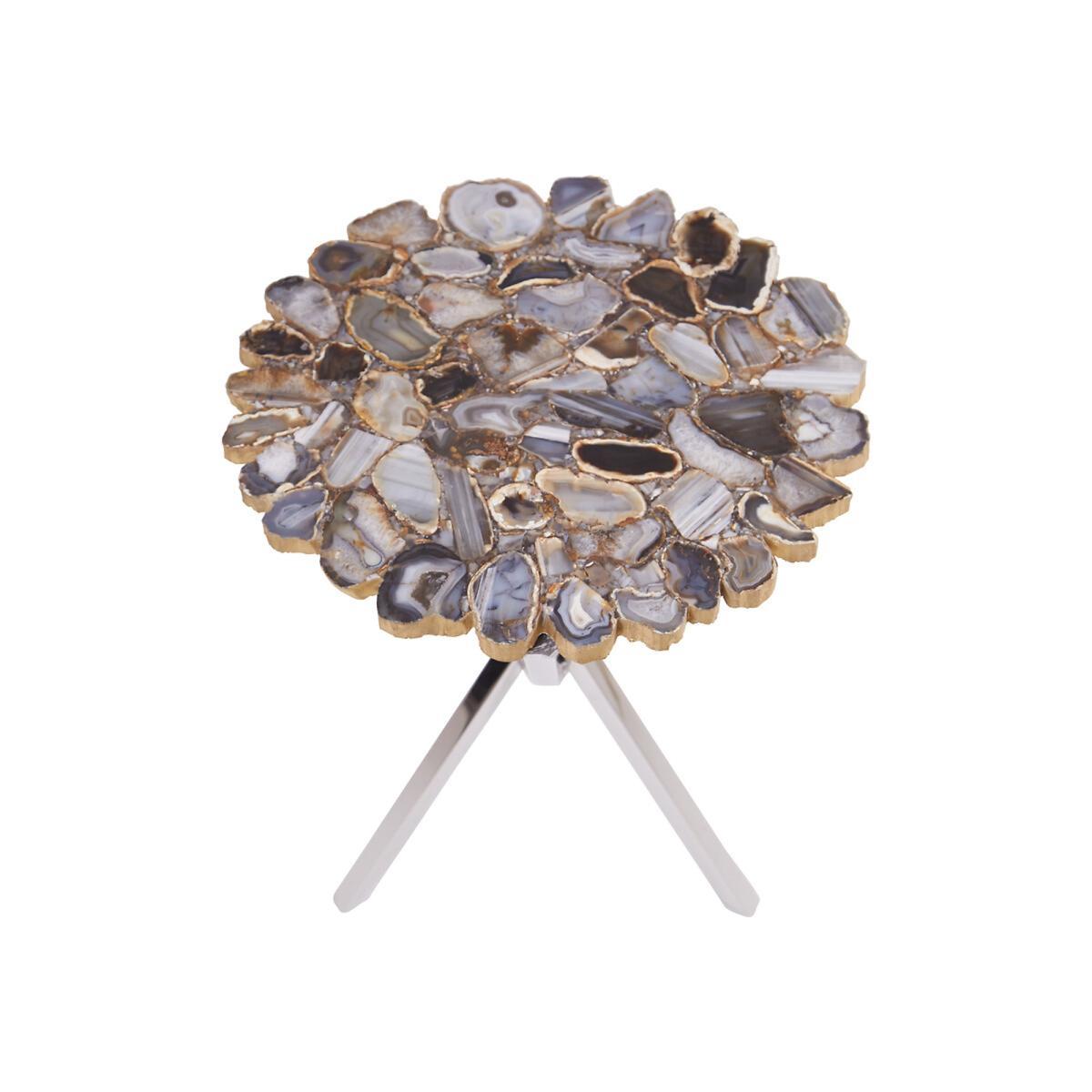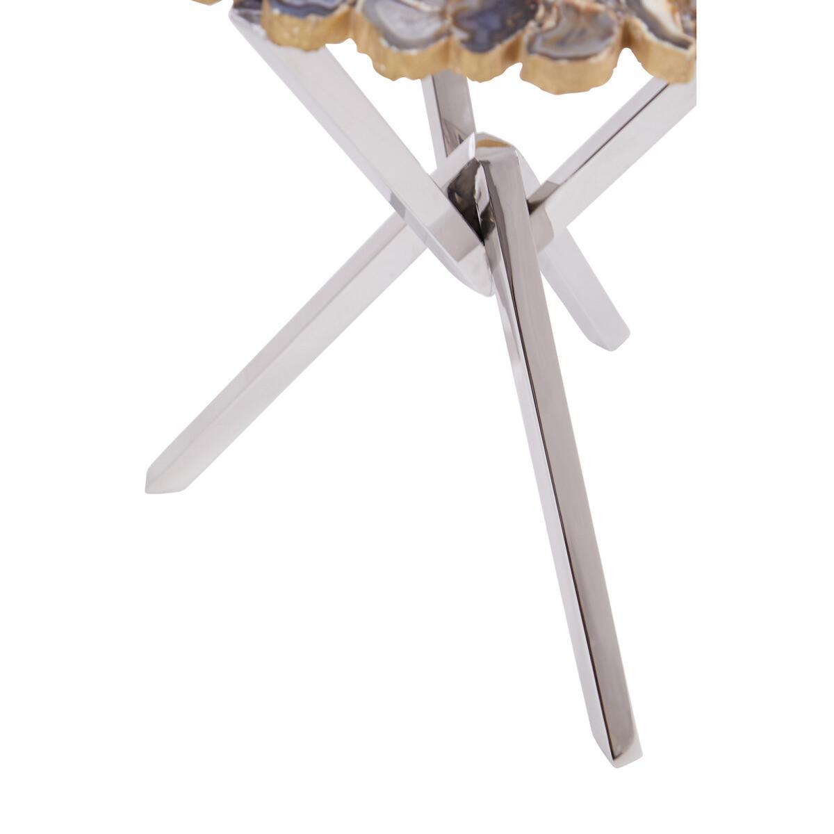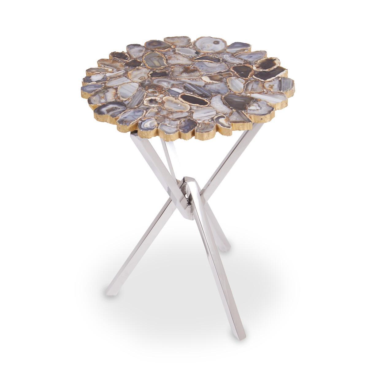 I really like this side table for its contemporary edge and versatile appeal. The agate top offers a subtle luxury feel, perfect for adding texture and visual interest to a neutral or muted palette. Its angular chrome legs give it a modern, streamlined look that works well in minimalist or industrial-inspired interiors. Practical styling tips include pairing it with a sleek lamp or a small decorative object like a vase or candle, ensuring it doesn’t compete with other statement pieces. It also works well next to a sofa or armchair in living rooms that blend modern design with eclectic or luxe touches, bringing a refined yet functional addition to your space.