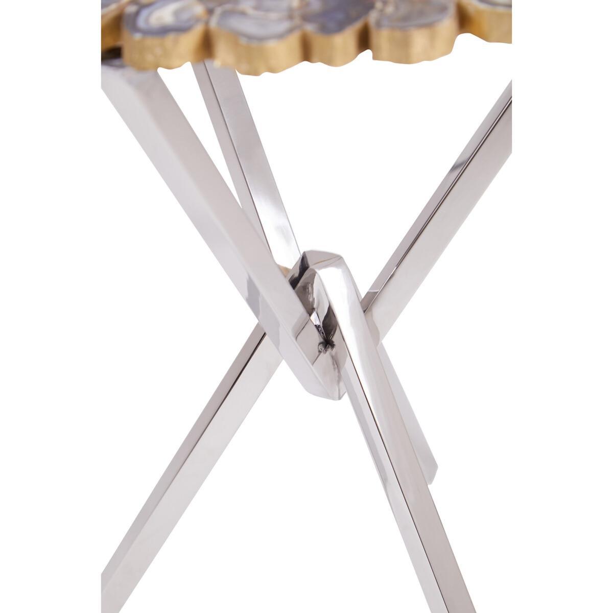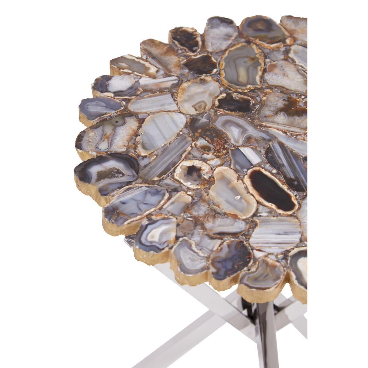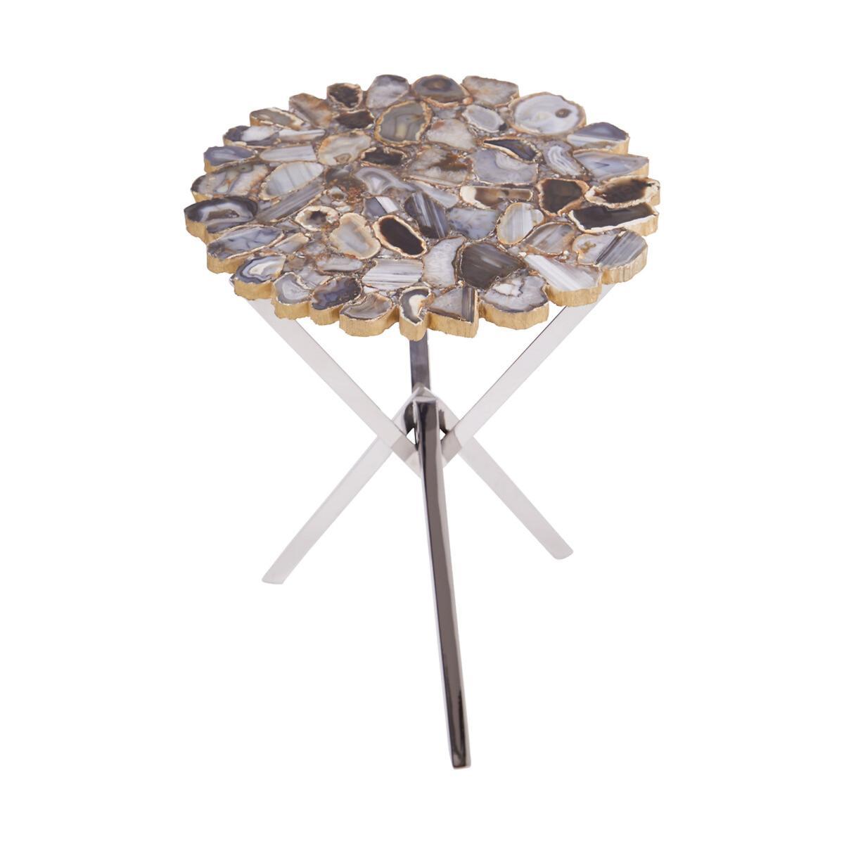 I really like this side table for its contemporary edge and versatile appeal. The agate top offers a subtle luxury feel, perfect for adding texture and visual interest to a neutral or muted palette. Its angular chrome legs give it a modern, streamlined look that works well in minimalist or industrial-inspired interiors. Practical styling tips include pairing it with a sleek lamp or a small decorative object like a vase or candle, ensuring it doesn’t compete with other statement pieces. It also works well next to a sofa or armchair in living rooms that blend modern design with eclectic or luxe touches, bringing a refined yet functional addition to your space.