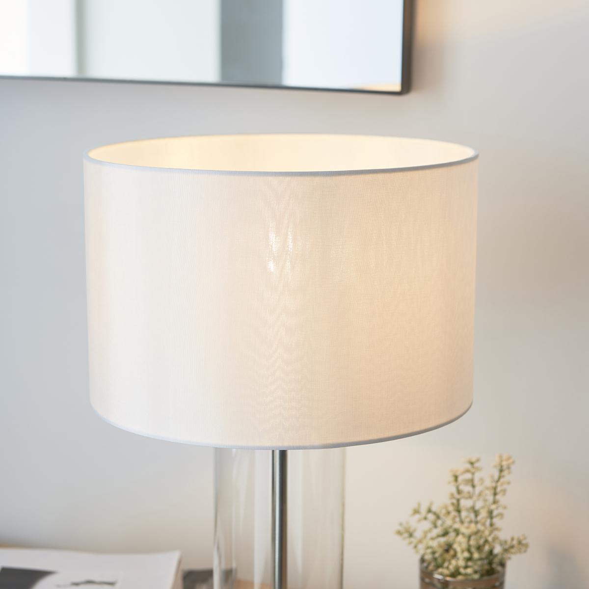 I love this table lamp for its sleek and contemporary look, which makes it highly versatile in various interiors. Its clear glass base paired with bright nickel accents lends a clean, modern feel that works particularly well in minimalist or industrial spaces, but can also add a touch of sophistication to more classic settings. Practical styling tips include placing it next to a neutral sofa or bedside table to create a sophisticated vignette, and pairing with textured or coloured accessories to prevent it from looking too stark. Its understated design allows it to blend seamlessly without overpowering other elements in the room, making it a smart choice for adding both function and style.