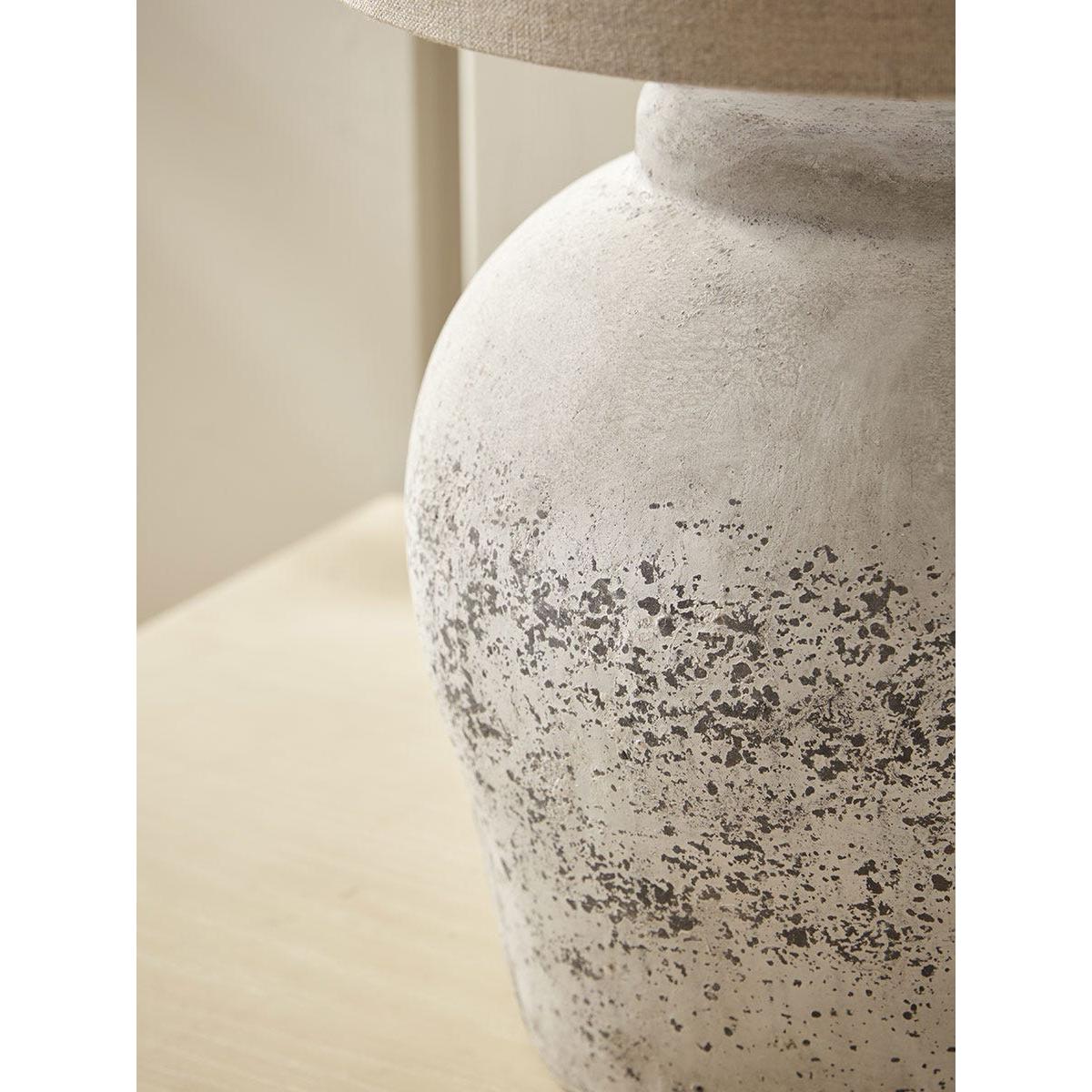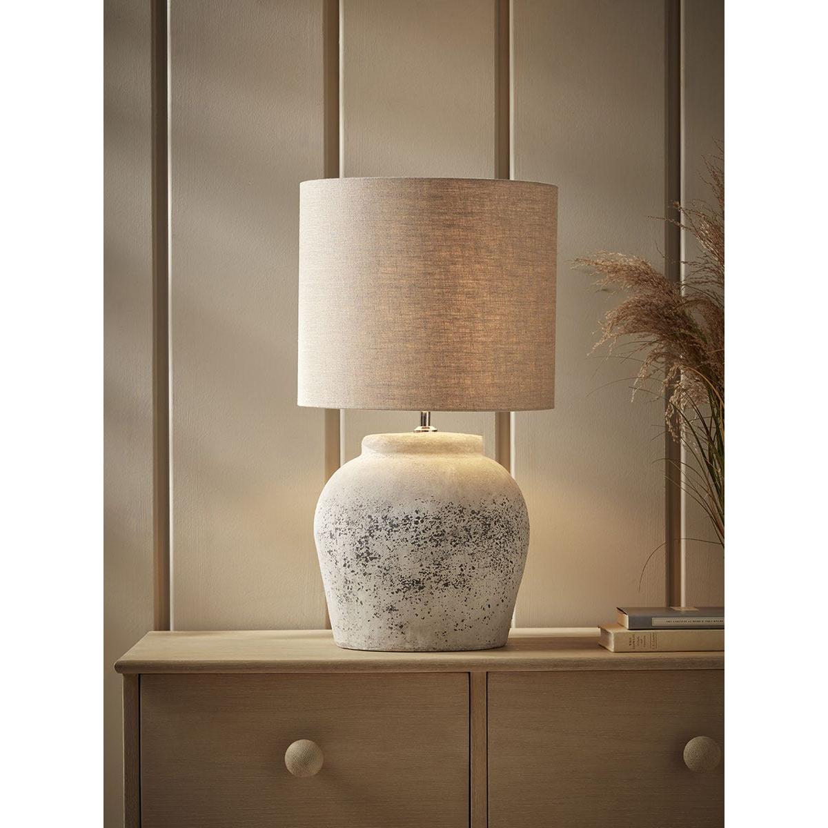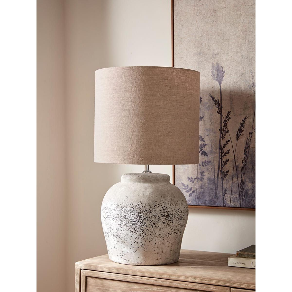 With a wide base, speckled detailing surrounds the base of this lamp with a natural and organic look to it for a lamp that creates interest no matter what angle it is placed. A 100% linen shade adds a softeness to the base, creating a lamp that radiates warmth and a welcoming glow around your space whilst blending seamlessly into a variety of interior styles.