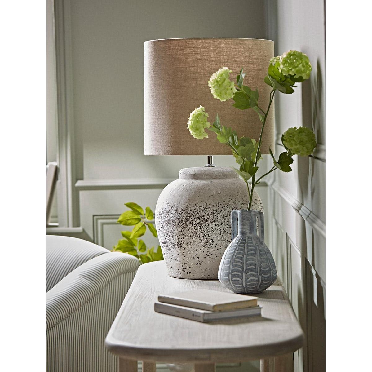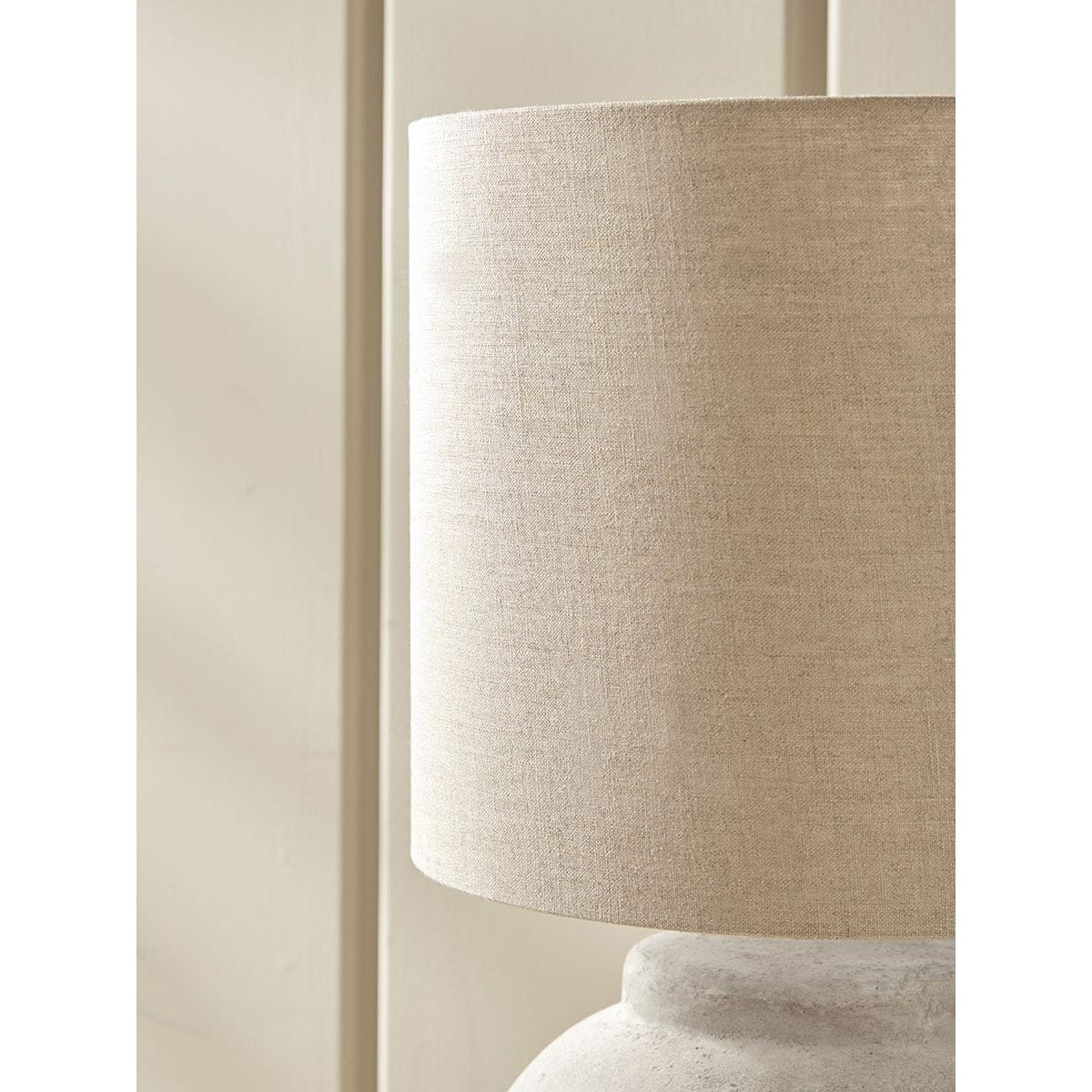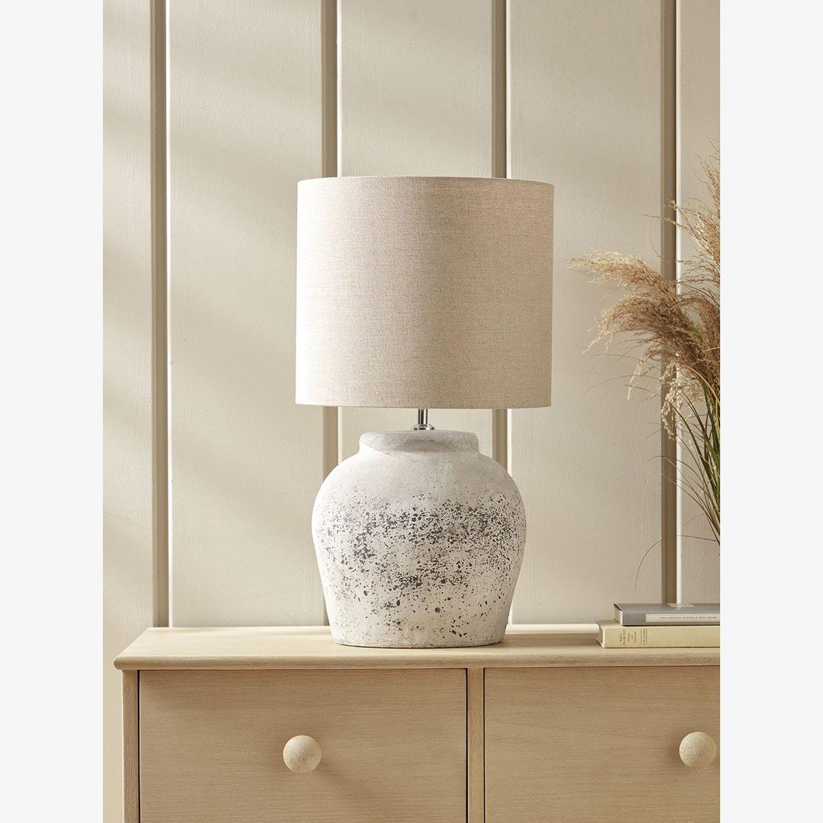 With a wide base, speckled detailing surrounds the base of this lamp with a natural and organic look to it for a lamp that creates interest no matter what angle it is placed. A 100% linen shade adds a softeness to the base, creating a lamp that radiates warmth and a welcoming glow around your space whilst blending seamlessly into a variety of interior styles.