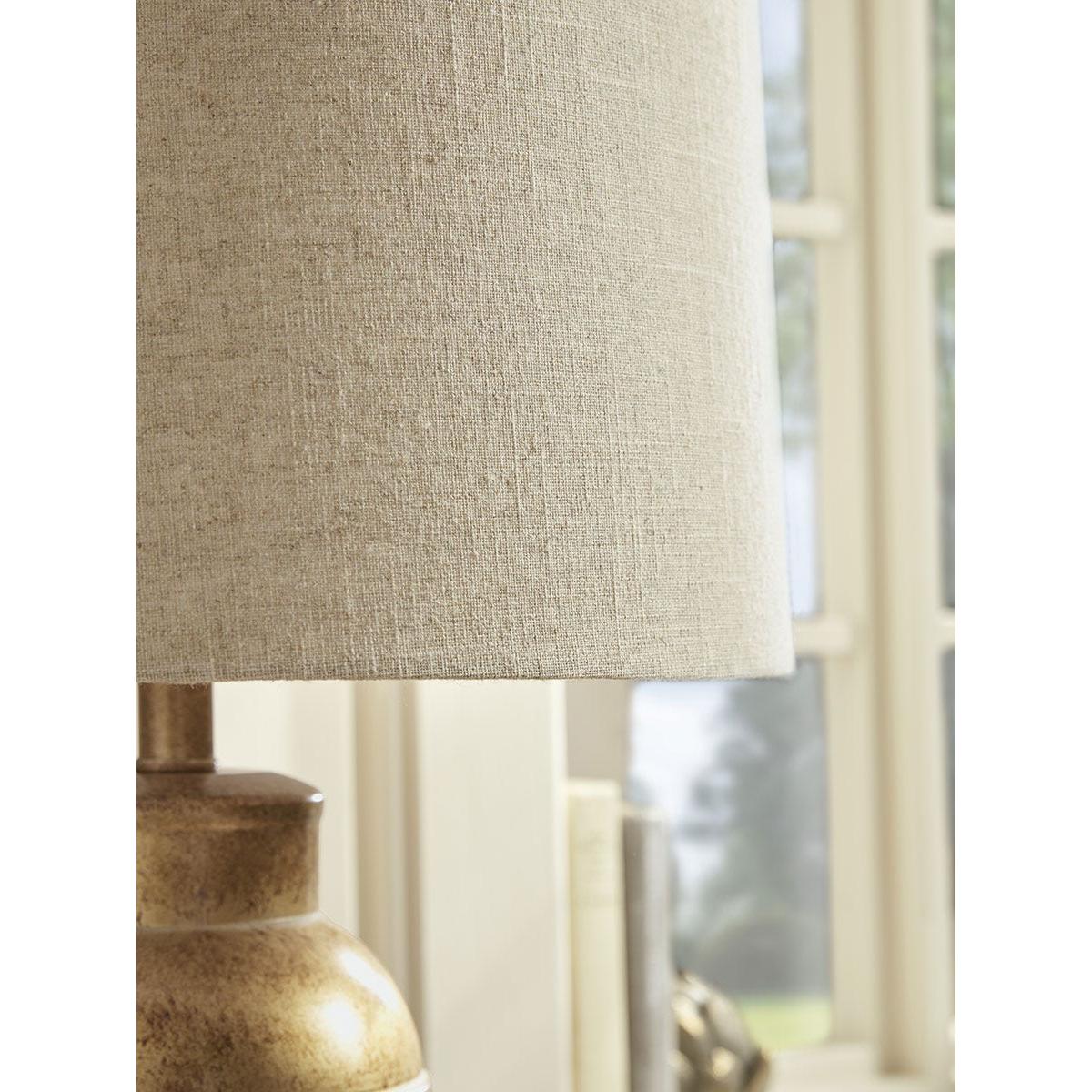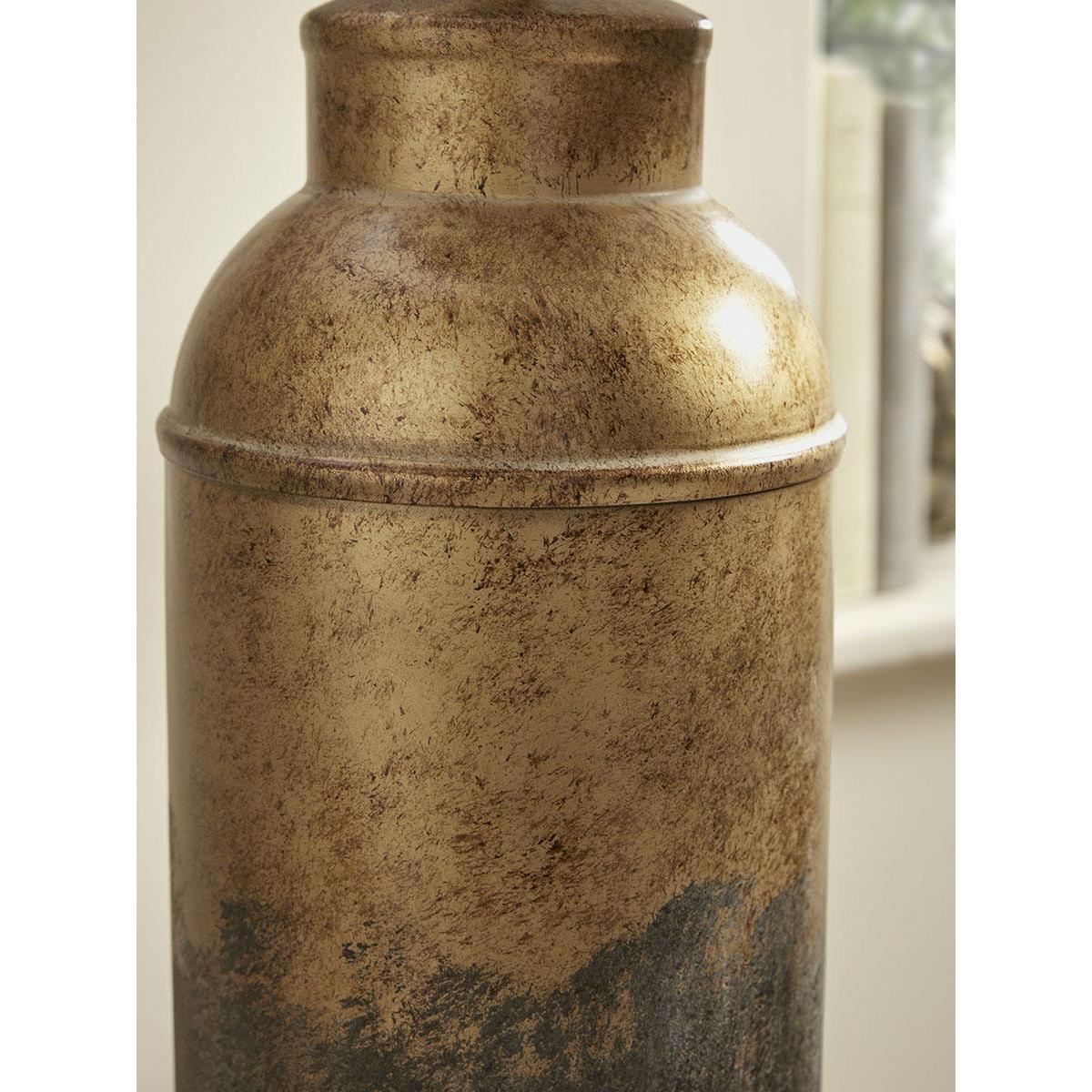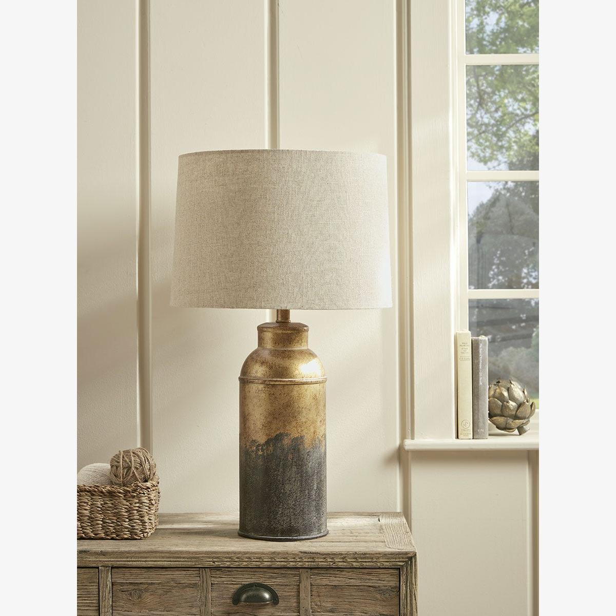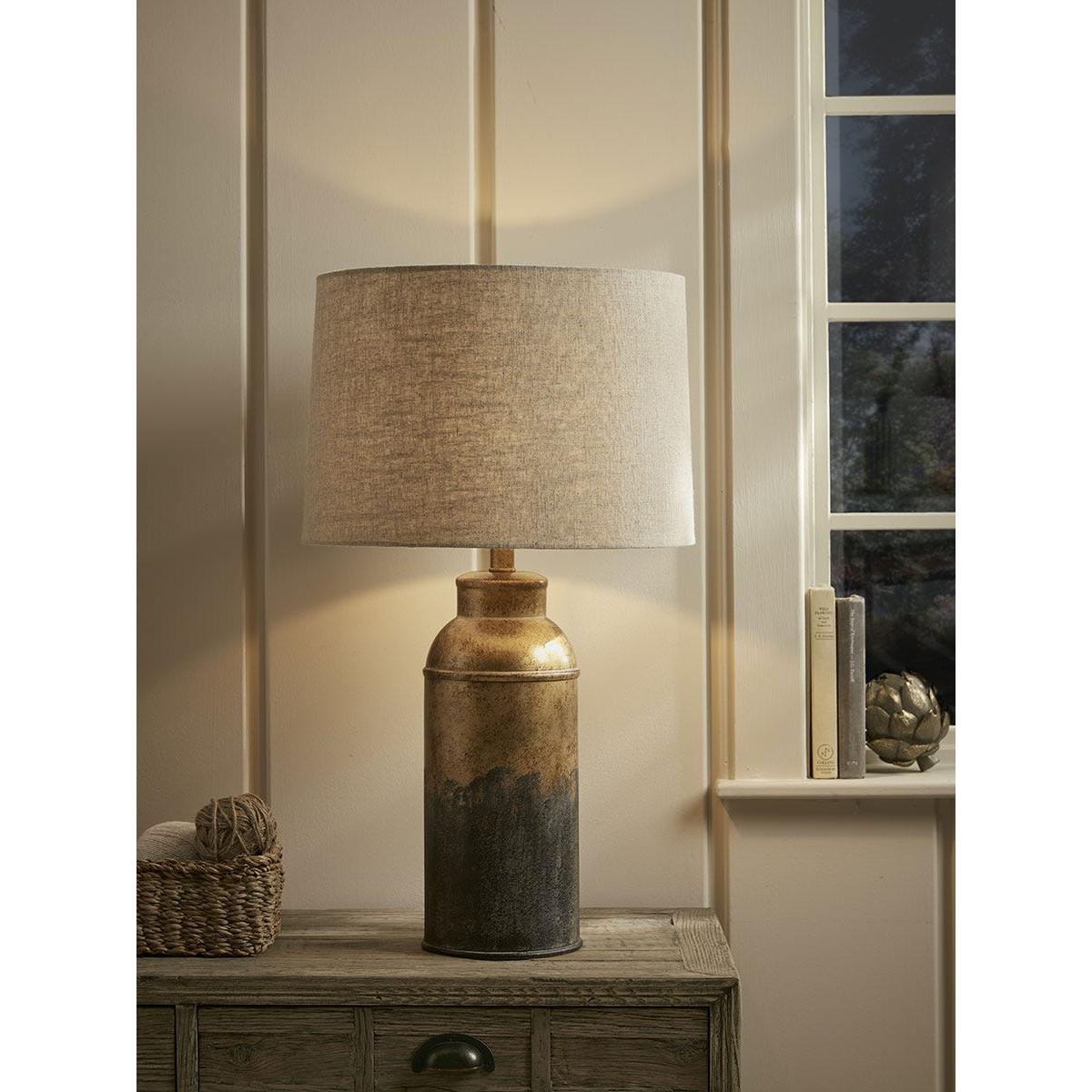 Cast a warm glow around your home with our Aged Metal Table Lamp. With the appearance of an old-school milk churn, the base of this lamp has a vintage, upcycled look that offers a sense of individuality for a look of rustic charm in your home. Contrasting the iron tone is an opulent gold-toned top, adding a touch of luxury to the traditional shape. Finished with a neutral linen shade, this lamp works as a wonderful additional to our English Rustic trend. Discover how to create the perfect lighting scheme for your home using our Lighting Buying Guide.
