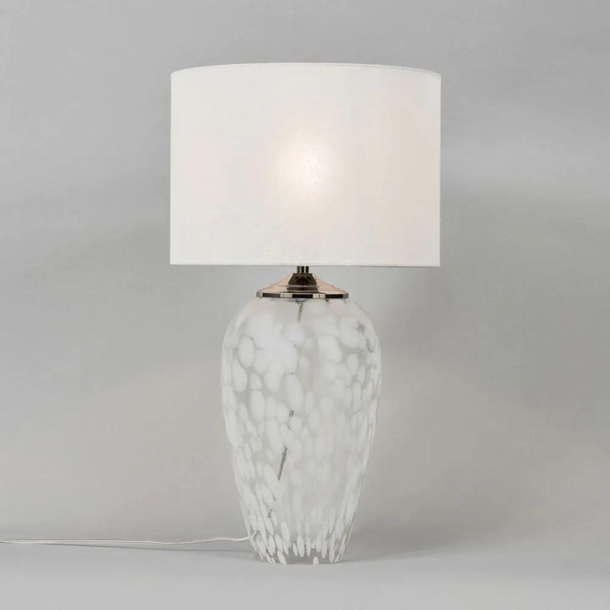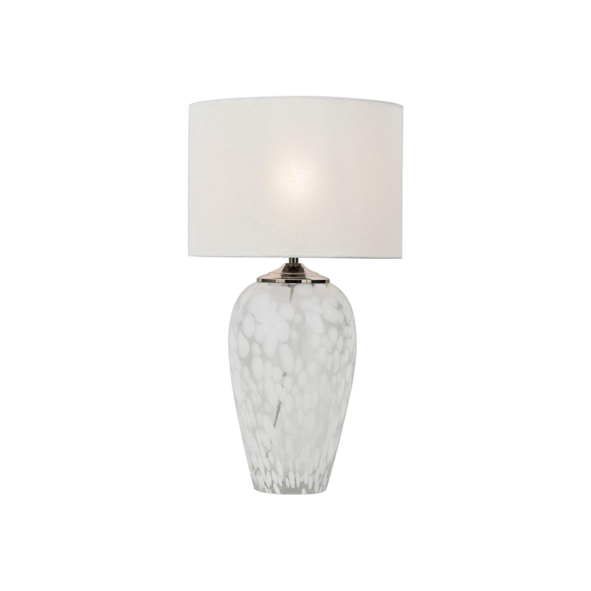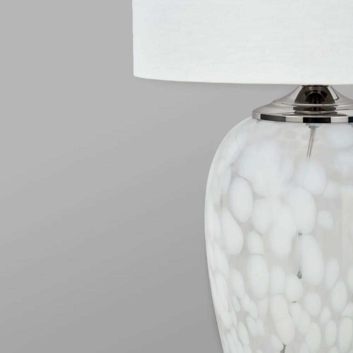 Inspire a stylish look for your tablescapes with the Agnes Flakestone Table Lamp in Polished Nickel. The polished nickel finish adds a touch of modernity, while the milky flakestone glass base offers a gorgeous decorative focal point to the room. Diffusing a stunning glow into the room with a white shade, this table lamp becomes a stylish addition to your living room, bedroom, or entryway.