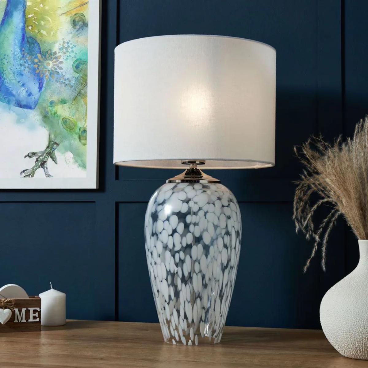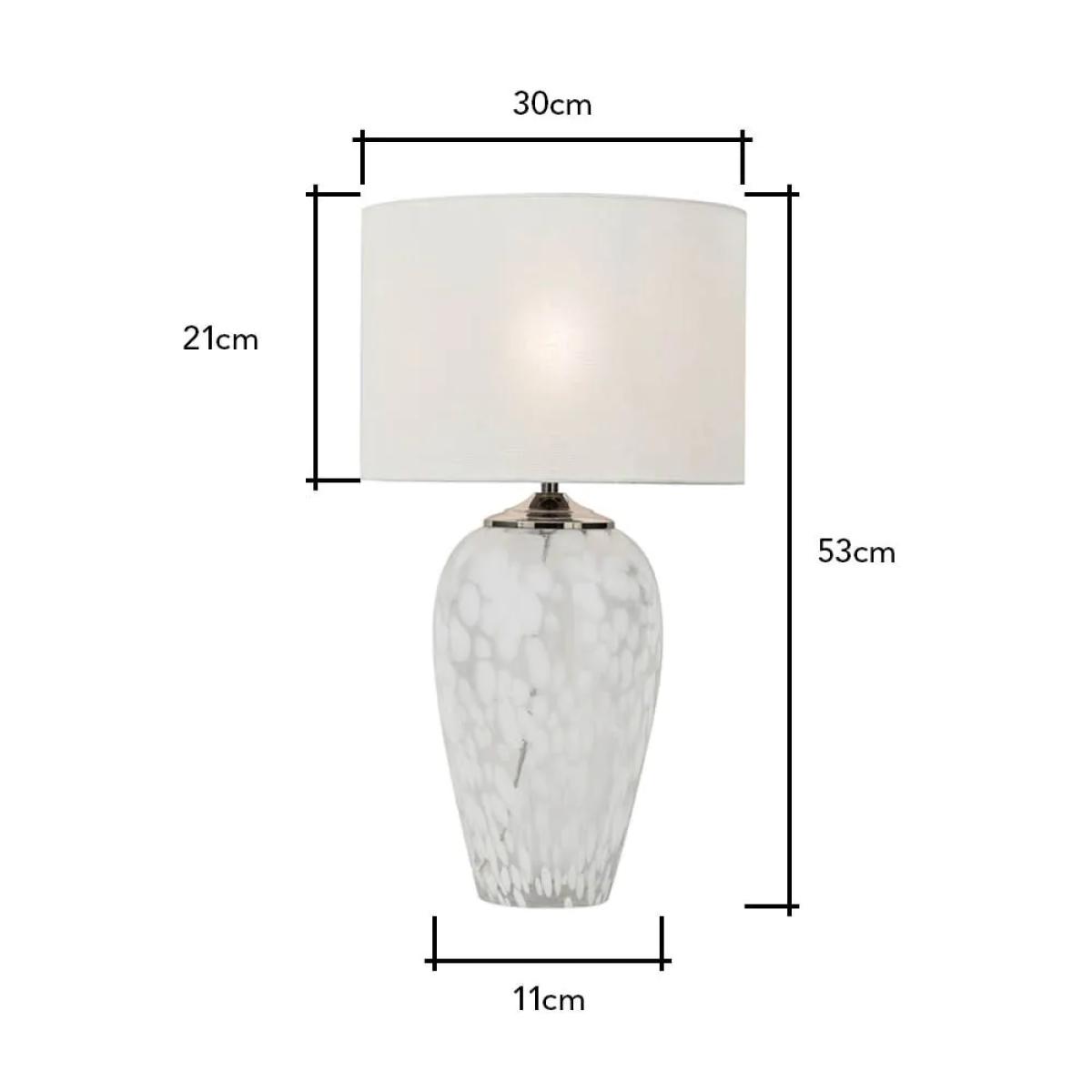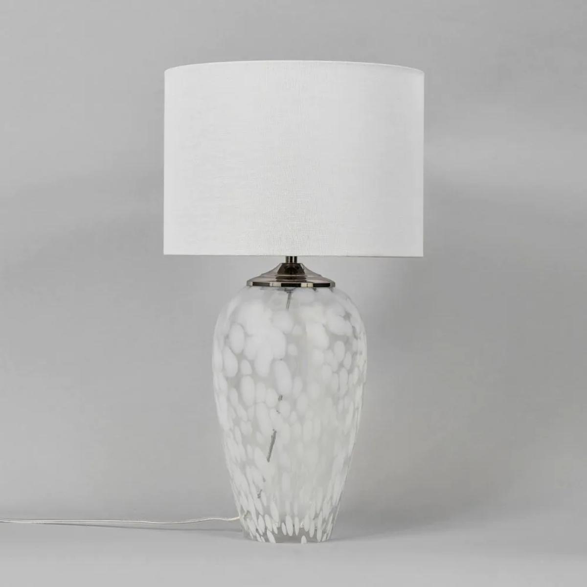 Inspire a stylish look for your tablescapes with the Agnes Flakestone Table Lamp in Polished Nickel. The polished nickel finish adds a touch of modernity, while the milky flakestone glass base offers a gorgeous decorative focal point to the room. Diffusing a stunning glow into the room with a white shade, this table lamp becomes a stylish addition to your living room, bedroom, or entryway.