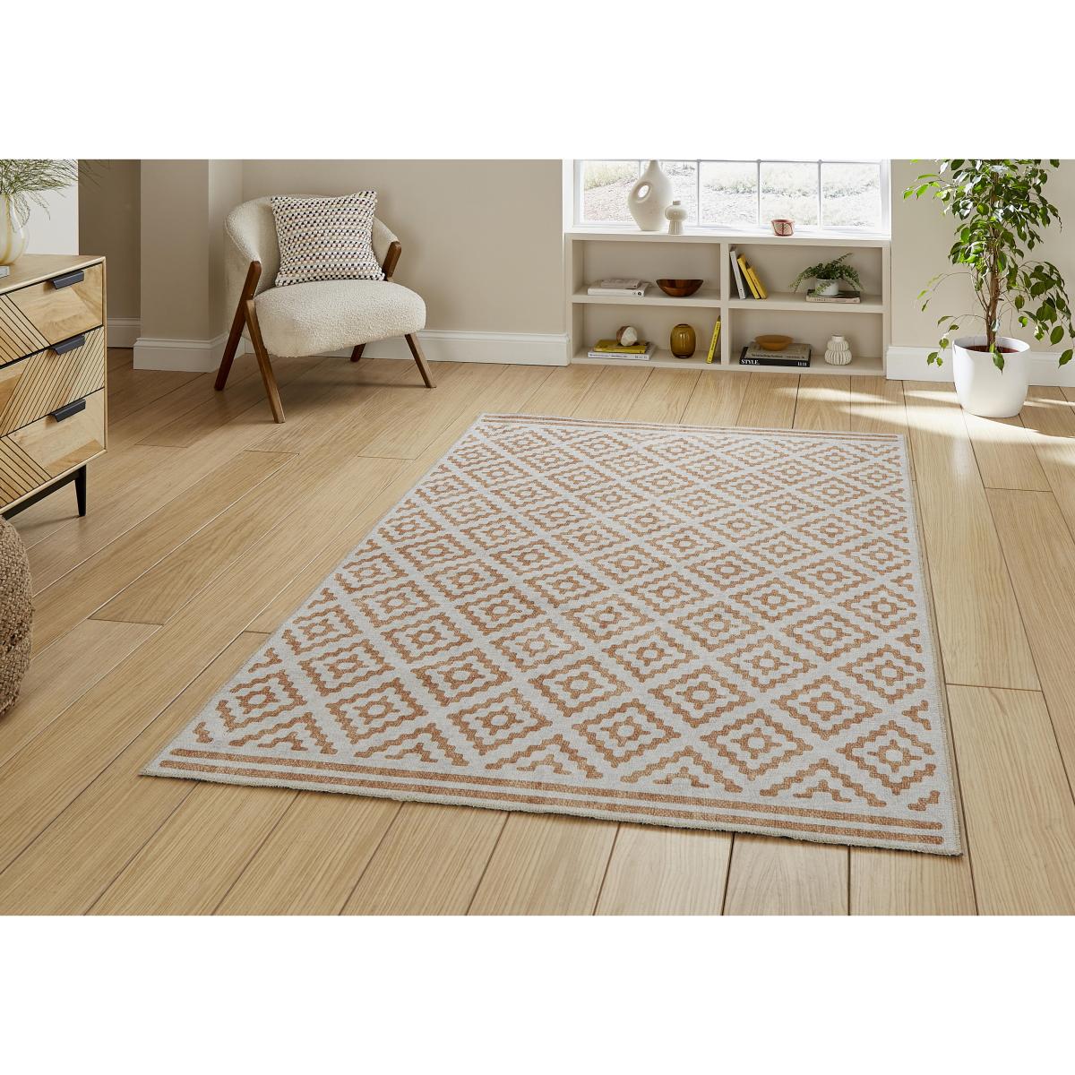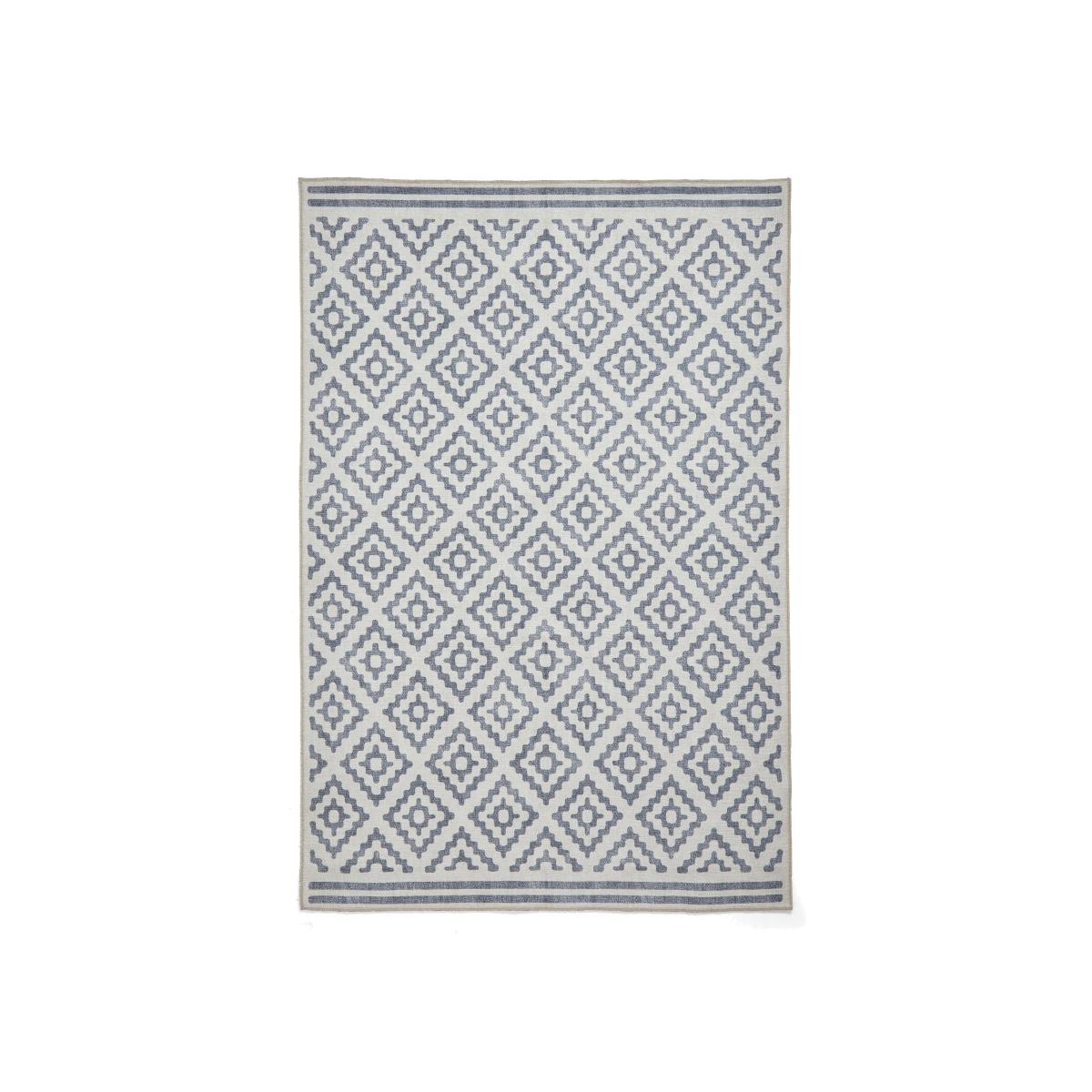 Kids or pets? Here’s your new rug. Machine washable, it has a durable flatweave finish and a non-slip backing so it stays exactly where you want it. In a choice of colours and sizes. Why you'll love it Beautiful washable rug with an elegant geometric pattern. Short ends are finished with a striped border. Wide choice of colourways and sizes. So easy to keep clean – it’s machine washable. Durable flatweave finish with a soft, shallow pile. Non-slip backing keeps it firmly in place. Environmentally friendly – it’s made with recycled materials. Striking digitally printed design. Ideal for homes with children and pets. Also available as a runner. This rug is part of the Furniture Village home accessories collection. What you need to know Polyester, recycled materials. For indoor use only. Machine washable. Item code: AGNERUG3BLU-001