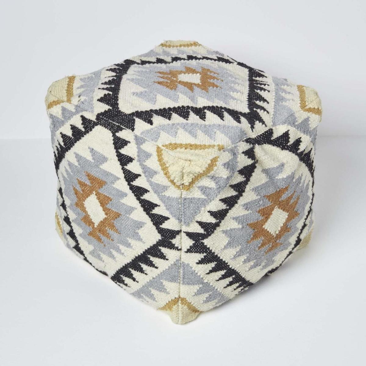 Traditionally handwoven kilim pouffe from Homescapes exclusive kilim collection. These durable, hardwearing footstools are woven from 100 cotton and 100 wool that create tapestry style decorative design, perfect for everyday use. Featuring a traditional textured design that echoes Indian and Tribal patterns, these striking and colourful pouffes are sure to make a statement in any home. Generously filled with polyester beads, that are encased within thick, 100 cotton to prevent filling leakage, these versatile beanbag style pouffes are both practical and comfy. A range exclusively designed by Homescapes, each kilim pouffe is expertly handwoven, resulting in a truly unique accessory each and every time. Using the finest quality fair-trade cotton and wool, each colour has been dyed using natural dyes and finished to a premium standard. Measures 43 x 43 x 43cm square. Spot clean only. Matching Kilim rugs, cushions and home accessories are also available from Homescapes, sold separately. Each pouffe is truly unique, images are representative of the kilim pattern and colours, due to the handcrafted nature of kilim, each pouffe design may differ slightly.