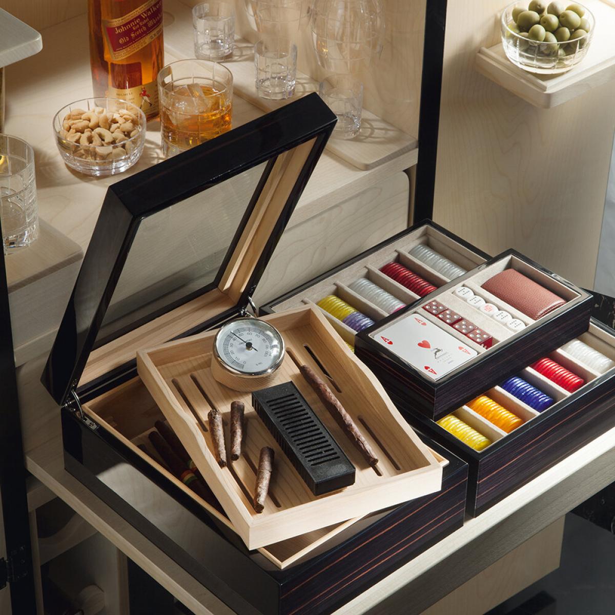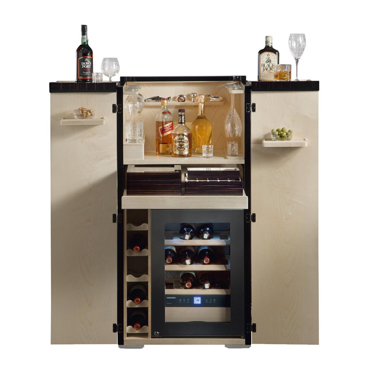 Enhance dinner parties with this Bacco Tabacco bar armoire from Agresti. Made from polished wood with a maple interior and leather handles, this luxurious design features a LIEBHERR wine cellar, hand-cut crystal glasses, and wine accessories. Perfect for entertaining guests, the lower drawer opens to reveal a humidor, poker chips, playing cards, dice and leather cups.