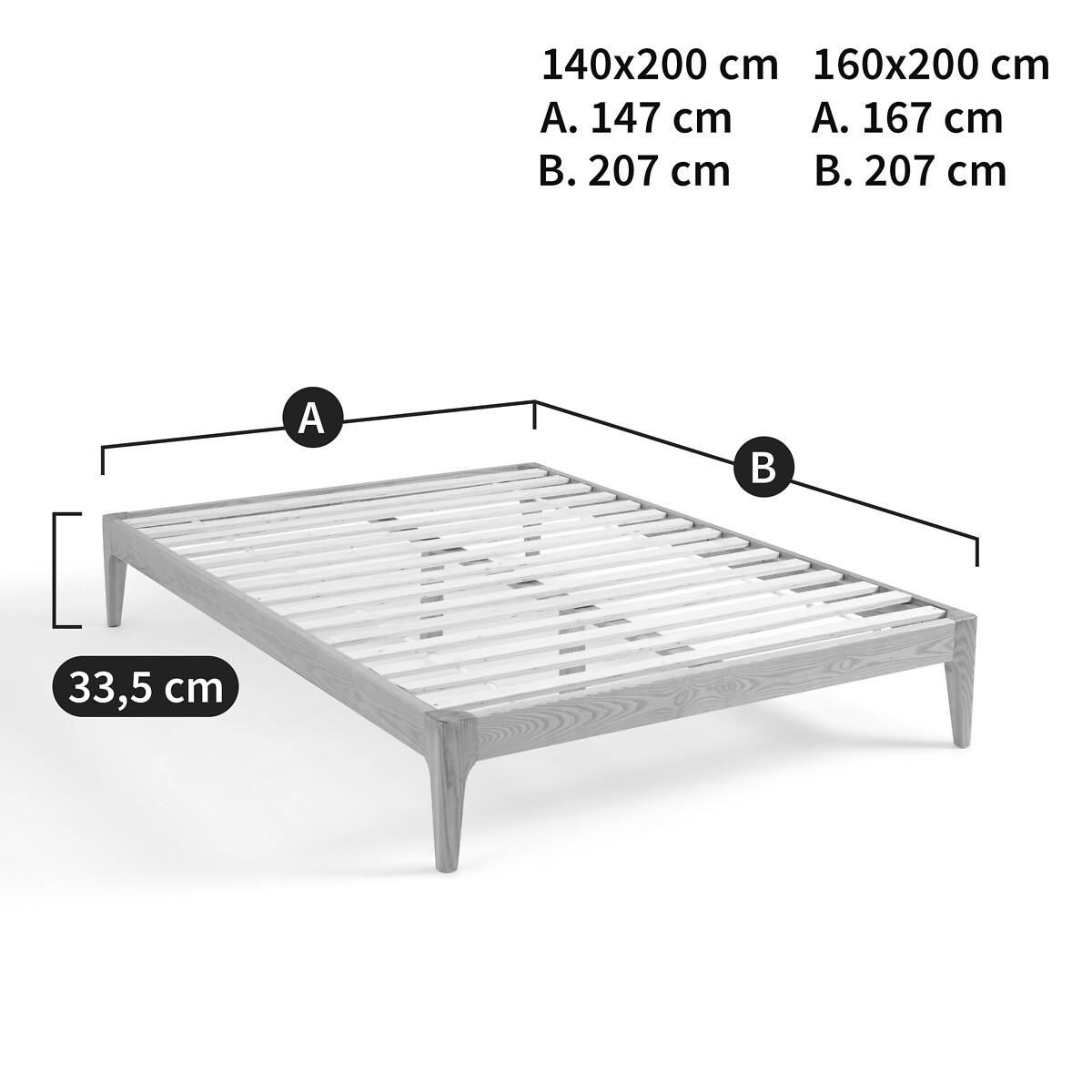 Contemporary design inspired by Scandinavian style, with simple lines: the Agura bed matches any interior. Product Details • Structure in solid ash, nitrocellulose varnish finish • Reinforcment in solid pine • Supplied with slatted base in plywood, to be placed on the inside frame of the bed. Easy to construct. • Sleeping sizes: 140 x 200cm, 160 x 200cm, 180 x 200cm. To move your bed, we advise you to lift it and not push or pull it. Dimensions Bed Size 140 x 200cm[Double]Overall • Width: 147cm • Height: 33cm • Length: 207cm • Height of legs : 33cm • Weight: 30.5kg. Usable space • Storage height available under the bed: 23cm. Bed Size 160 x 200cm[King]Overall • Width: 167cm • Height: 33cm • Length: 207cm • Height of legs : 33cm • Weight: 32.5kg. Usable space • Storage height available under the bed: 23cm. Bed Size 180 x 200cm[Super King]Overall • Width: 187cm • Height: 33cm • Length: 207cm • Height of legs : 33cm • Weight: 34kg. Usable space • Storage height available under the bed: 23cm • This product requires assembly. • WOOD FROM SUSTAINABLY MANAGED FORESTS. FSC® certified wood comes from forests that are environmentally, socially and economically well managed. Dimensions and weight of parcel1 parcel. Double size • L207 x H20 x D25cm. 32kg. King size • L207 x H20 x D25cm. 34kg Super King size • L227 x H16 x D30cm. 37kg