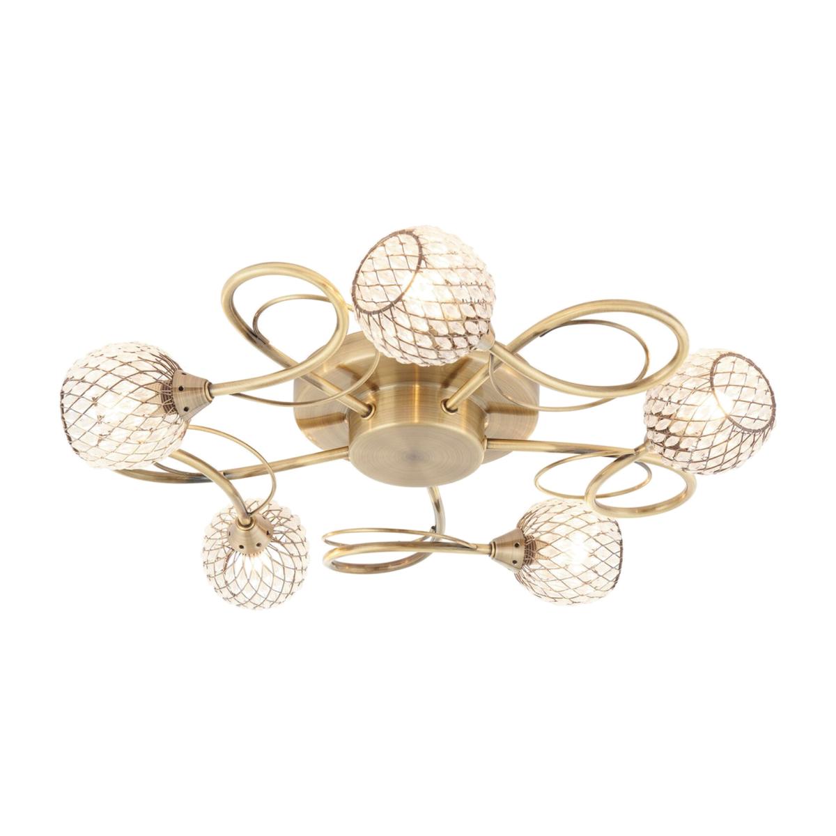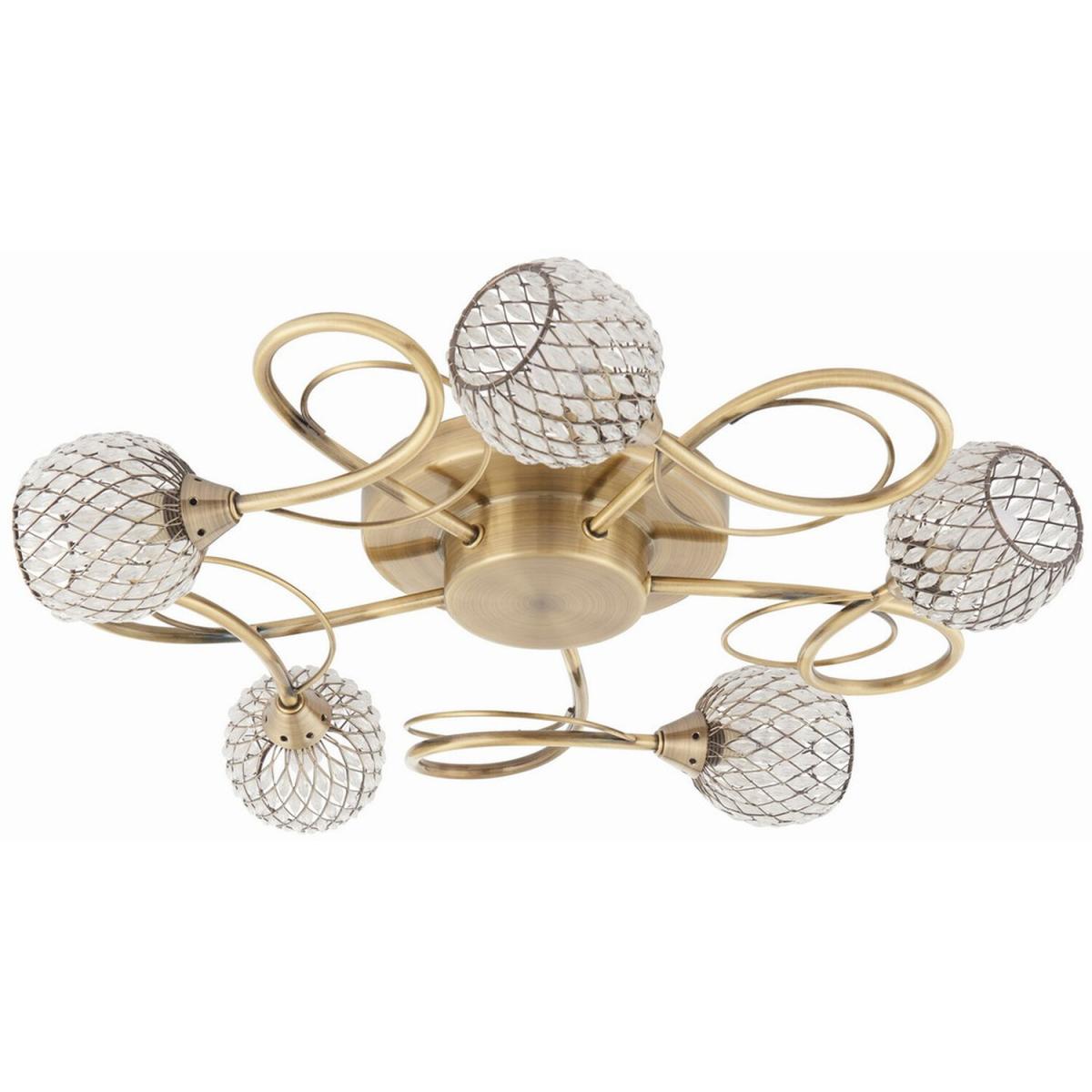 A 5 light flush ceiling fitting which comes finished in an antique brass effect plate chrome, with mesh and clear bead shades. Suitable for use with LED lamps and fully dimmable. Also available in a 3 light version