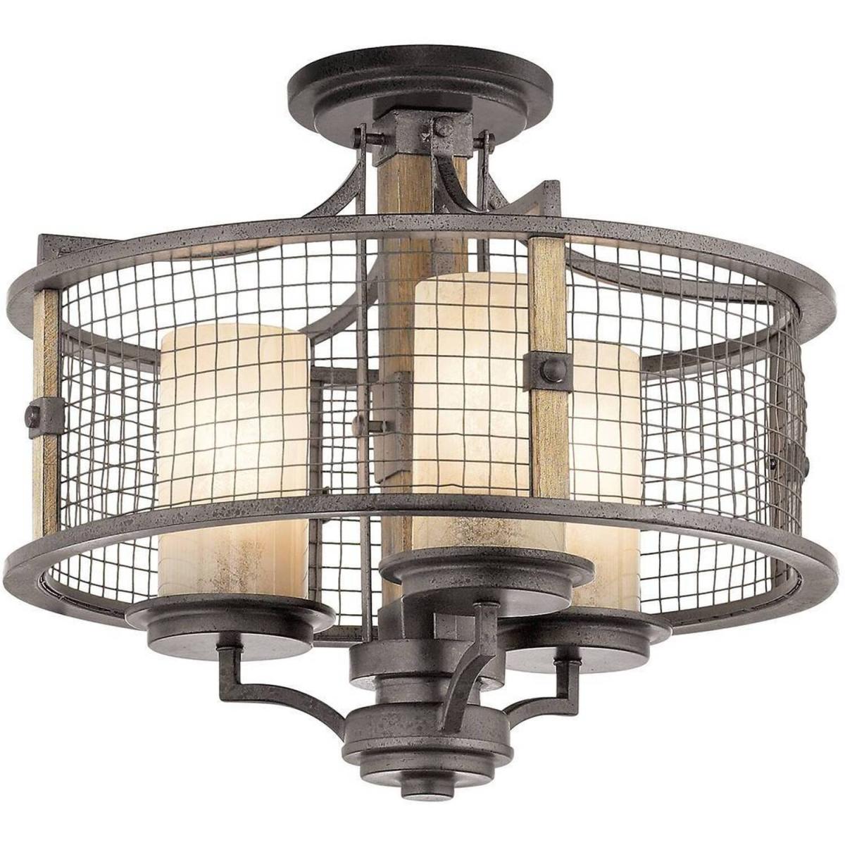 The dressed up rustic styling of this 3 light Duo-Mount Chandelier (can be hang as a flush mount or ceiling chain light) opens new possibilities sure to enhance your decor. Open Anvil iron mesh surrounding and protecting Mica shades which in turn cast satisfying and comforting illuminations in your home. Also available in this range 1lt Wall Light, Mini Pedestal, and 4lt Chandelier.