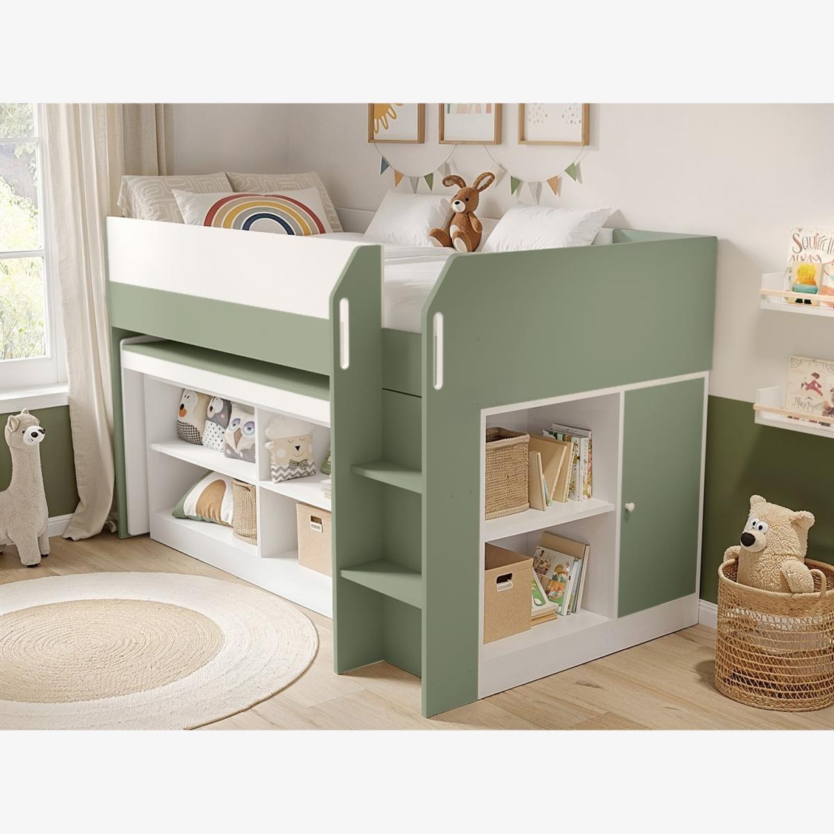 The Flair Aiden Cabin Bed Mid Sleeper is a stylish and practical solution for children bedrooms, offering a compact yet functional design. With its elevated cabin-style bed, integrated shelving, and a convenient pull-out desk, it the perfect choice to maximise space while providing a dedicated area for study, creativity, or play.