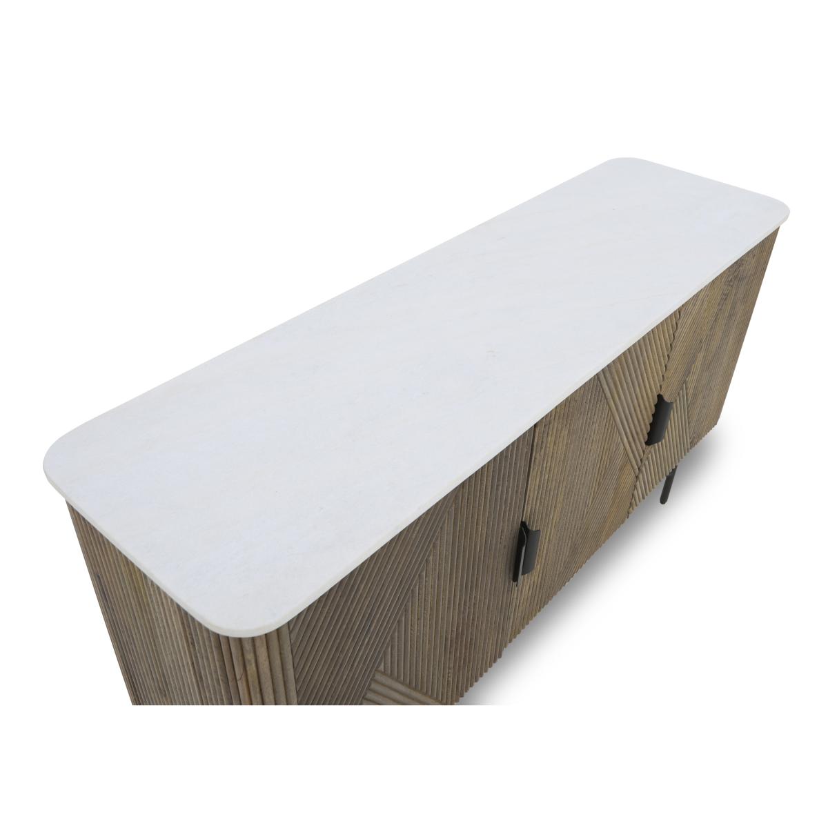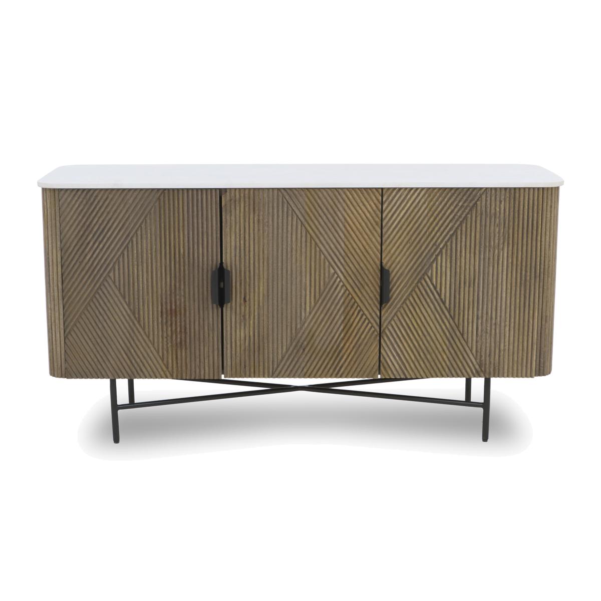It's the combination of natural finishes – marble, wood and iron – that guarantees that every piece in our Aimar range is unique. And it's the way that each material is beautifully crafted that ensures every item is striking, distinctive and elegant. Showcasing white marble tops, fluted wood frames and table pedestal bases, and slender iron legs, this stunning collection includes dining tables, dining sets and sideboards as well as occasional tables and storage pieces for living rooms. Bring home a piece from the Aimar range and bring home one-of-a-kind style. It’s the combination of natural finishes – marble, wood and iron – that makes this beautifully crafted and very roomy sideboard so striking. Why you'll love it Made by nature, crafted by experts. Our Aimar range brings together beautiful and authentic finishes. This sideboard has a stunning white marble top. And because every piece of marble is unique, every Aimar sideboard is one of a kind. The fluted wood frame has a natural, organic feel. 2 cupboards provide roomy dining room storage. Soft-closing cupboard doors. A fashion-forward look that will stand the test of time. This 3-door sideboard is part of the Aimar range. What you need to know 1 double-door cupboard and 1 single-door cupboard, each with 1 shelf. Marble top, wooden frame and iron legs. Marble is hardwearing but not indestructible, so it’s important to care for it properly. Spillages need to be removed immediately. To clean, wipe gently with a damp cloth using warm water, then buff dry. We recommend that you use coasters and placemats to protect against heat and moisture. Do not use knives to cut food on a marble table top, use as a work top, place heavy weights on the table or use acidic or abrasive cleaners. You should never sit or stand on a marble surface. For more advice on caring for your marble furniture, see our Dining care guide. WARNING! Furniture can tip over unexpectedly and cause injury. This item must be fixed to a wall using the anti-tip kit provided. Be sure to use the correct wall fixings suitable for the walls in your home. Furniture Village is not able to fix anti-tip devices for you. Seek professional advice if you are unsure.