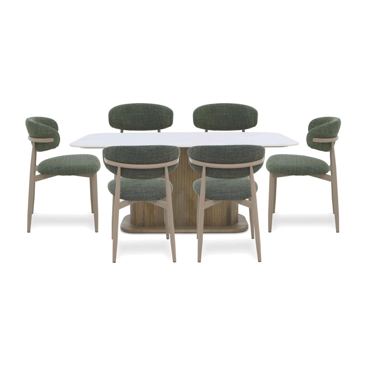 It's the combination of natural finishes – marble, wood and iron – that guarantees that every piece in our Aimar range is unique. And it's the way that each material is beautifully crafted that ensures every item is striking, distinctive and elegant. Showcasing white marble tops, fluted wood frames and table pedestal bases, and slender iron legs, this stunning collection includes dining tables, dining sets and sideboards as well as occasional tables and storage pieces for living rooms. Bring home a piece from the Aimar range and bring home one-of-a-kind style. With a marble-topped dining table and six open-back chairs, this dining set brings striking style to any dining room. Why you'll love it Made by nature, crafted by experts. Our Aimar range brings together beautiful and authentic finishes. The dining table has a stunning white marble boat-shaped top. And because every piece of marble is unique, every Aimar dining table is one of a kind. The fluted wood pedestal base has a natural, organic feel. With 6 stylish open-back dining chairs inspired by mid-century design. Cushioned backrests and seats. Fabric upholstery in a choice of colours. A fashion-forward look that will stand the test of time. This dining set is part of the Aimar range. What you need to know Chair cushioning is made of foam. Frames are legs are made of steel with a wood-effect finish. Dining table has a marble top and a wooden frame and legs. Seats 6. Marble is hardwearing but not indestructible, so it’s important to care for it properly. Spillages need to be removed immediately. To clean, wipe gently with a damp cloth using warm water, then buff dry. We recommend that you use coasters and placemats to protect against heat and moisture. Do not use knives to cut food on a marble table top, use as a work top, place heavy weights on the table or use acidic or abrasive cleaners. You should never sit or stand on a marble surface. For more advice on caring for your marble furniture, see our Dining care guide.