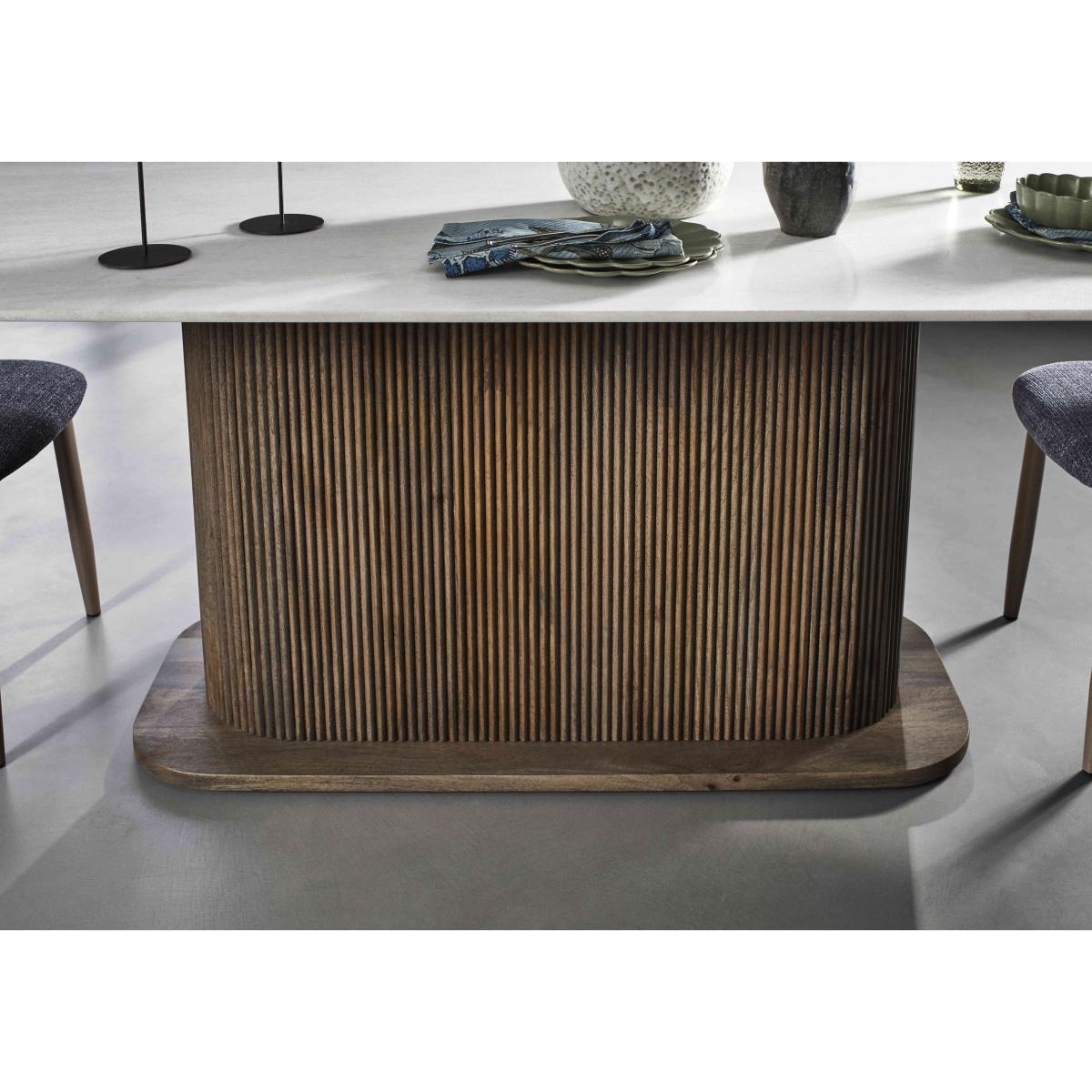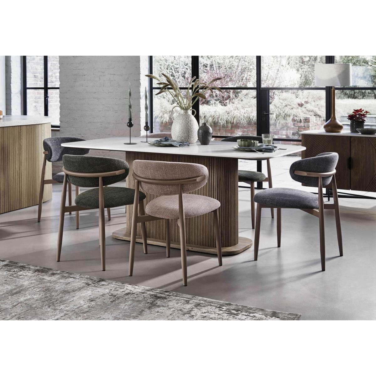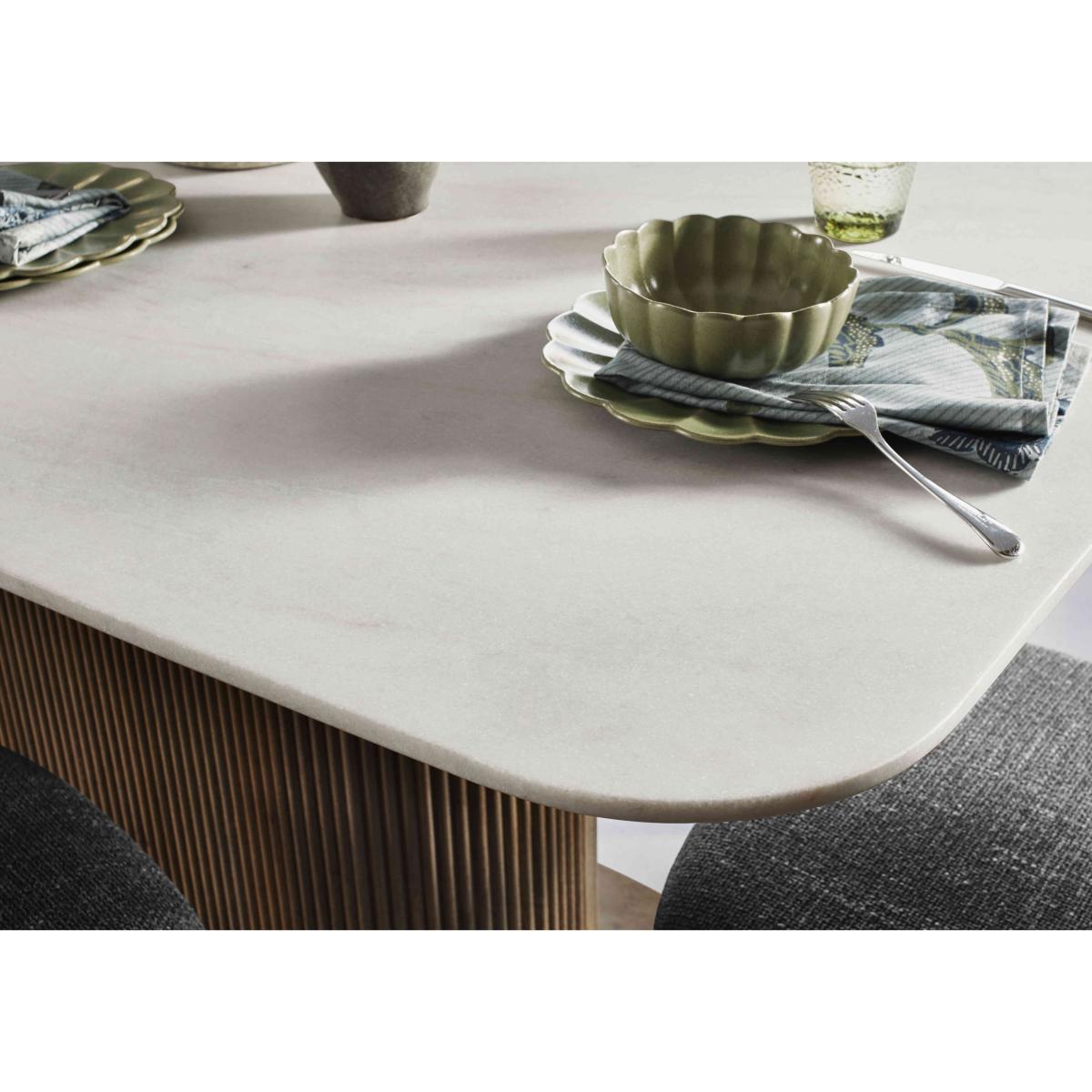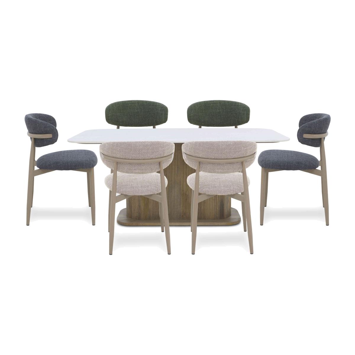 It's the combination of natural finishes – marble, wood and iron – that guarantees that every piece in our Aimar range is unique. And it's the way that each material is beautifully crafted that ensures every item is striking, distinctive and elegant. Showcasing white marble tops, fluted wood frames and table pedestal bases, and slender iron legs, this stunning collection includes dining tables, dining sets and sideboards as well as occasional tables and storage pieces for living rooms. Bring home a piece from the Aimar range and bring home one-of-a-kind style. This beautifully curated dining set showcases the stunning Aimar marble-topped dining table and six open-back chairs in an array of fabric colours. Why you'll love it Made by nature, crafted by experts. Our Aimar range brings together beautiful and authentic finishes. The dining table has a stunning white marble boat-shaped top. And because every piece of marble is unique, every Aimar dining table is one of a kind. The fluted wood pedestal base has a natural, organic feel. With 6 stylish open-back dining chairs inspired by mid-century design. Cushioned backrests and seats. Fabric upholstery. 2 dining chairs in each of the range’s 3 colours. A fashion-forward look that will stand the test of time. This dining set is part of the Aimar range. What you need to know Chair cushioning is made of foam. Frames are legs are made of steel with a wood-effect finish. Dining table has a marble top and a wooden frame and legs. Seats 6. Marble is hardwearing but not indestructible, so it’s important to care for it properly. Spillages need to be removed immediately. To clean, wipe gently with a damp cloth using warm water, then buff dry. We recommend that you use coasters and placemats to protect against heat and moisture. Do not use knives to cut food on a marble table top, use as a work top, place heavy weights on the table or use acidic or abrasive cleaners. You should never sit or stand on a marble surface. For more advice on caring for your marble furniture, see our Dining care guide.