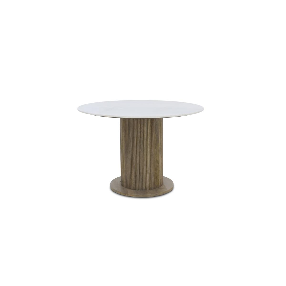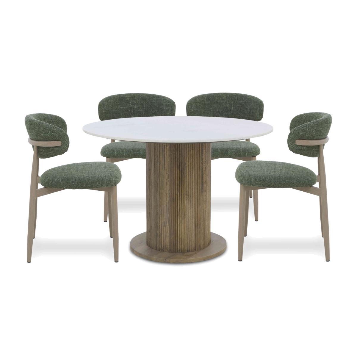 It's the combination of natural finishes – marble, wood and iron – that guarantees that every piece in our Aimar range is unique. And it's the way that each material is beautifully crafted that ensures every item is striking, distinctive and elegant. Showcasing white marble tops, fluted wood frames and table pedestal bases, and slender iron legs, this stunning collection includes dining tables, dining sets and sideboards as well as occasional tables and storage pieces for living rooms. Bring home a piece from the Aimar range and bring home one-of-a-kind style. At the centre of this striking dining set is our Aimar white marble-topped round dining table, the perfect table for stylish and sociable dining. This dining set includes six open-back dining chairs. Why you'll love it Made by nature, crafted by experts. Our Aimar range brings together beautiful and authentic finishes. The round dining table has a stunning white marble top. And because every piece of marble is unique, every Aimar dining table is one of a kind. The fluted wood pedestal base has a natural, organic feel. With 4 stylish open-back dining chairs inspired by mid-century design. Cushioned backrests and seats. Fabric upholstery in a choice of colours. A fashion-forward look that will stand the test of time. This dining set is part of the Aimar range. What you need to know Chair cushioning is made of foam. Frames are legs are made of steel with a wood-effect finish. Dining table has a marble top and a wooden frame and legs. Seats 4. Marble is hardwearing but not indestructible, so it’s important to care for it properly. Spillages need to be removed immediately. To clean, wipe gently with a damp cloth using warm water, then buff dry. We recommend that you use coasters and placemats to protect against heat and moisture. Do not use knives to cut food on a marble table top, use as a work top, place heavy weights on the table or use acidic or abrasive cleaners. You should never sit or stand on a marble surface. For more advice on caring for your marble furniture, see our Dining care guide.