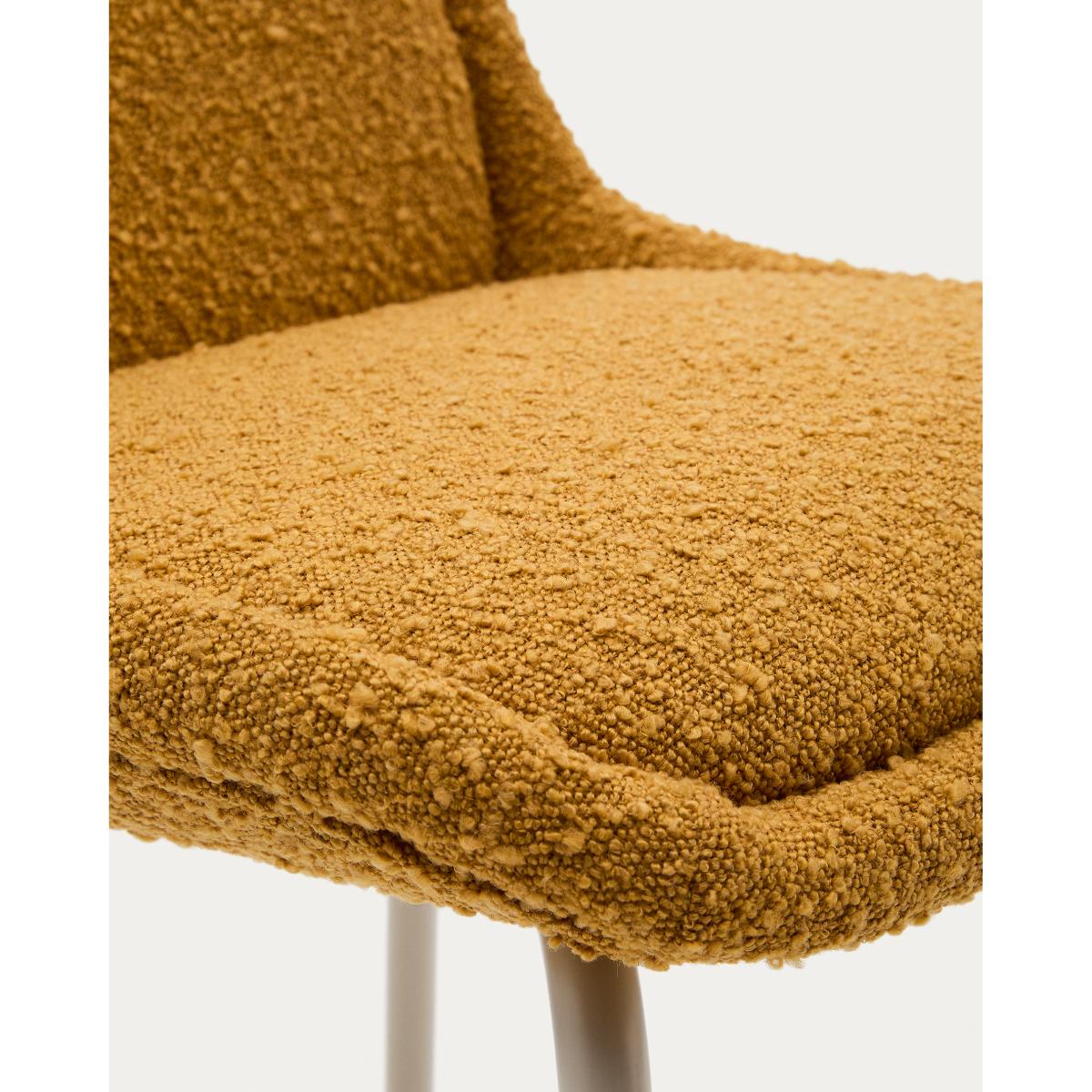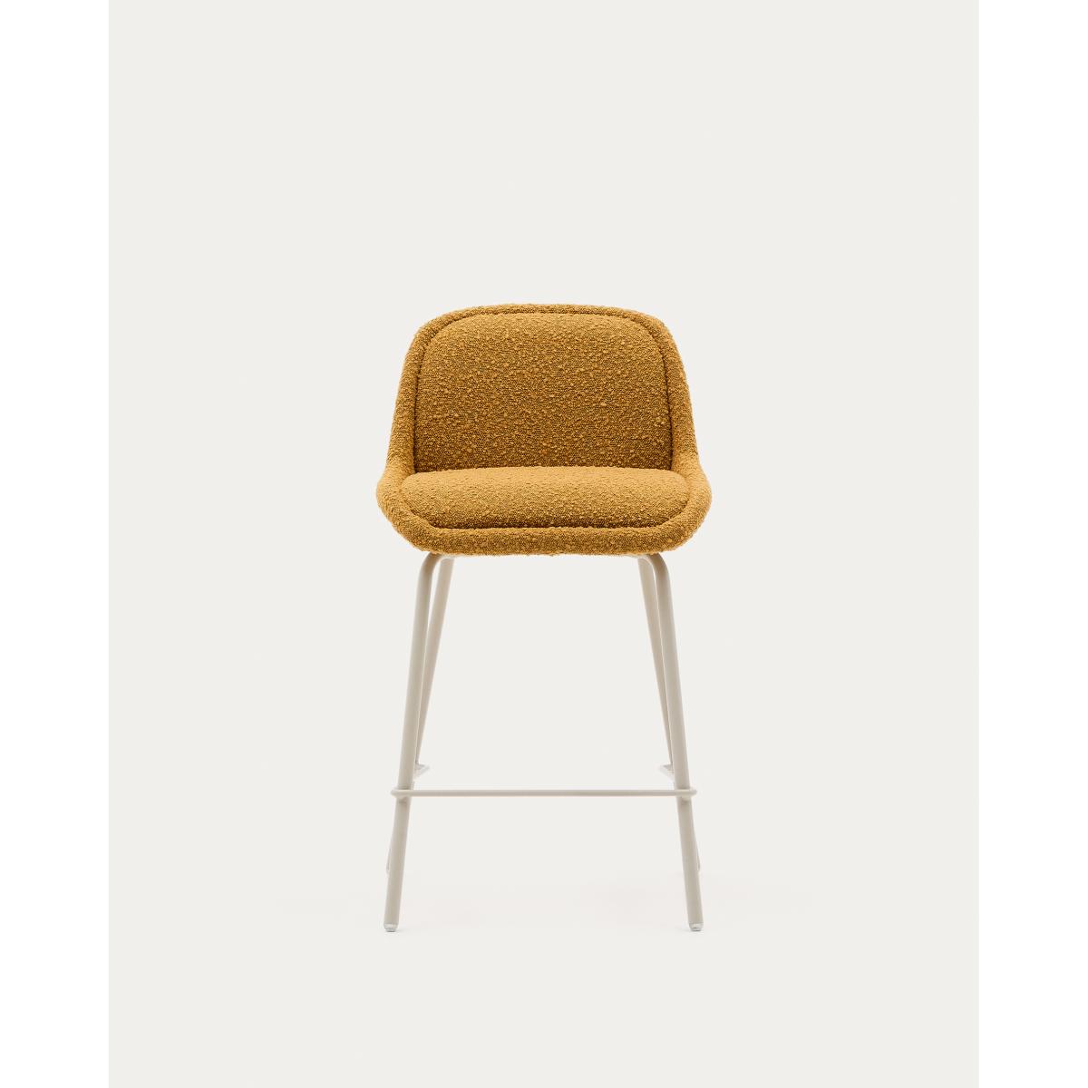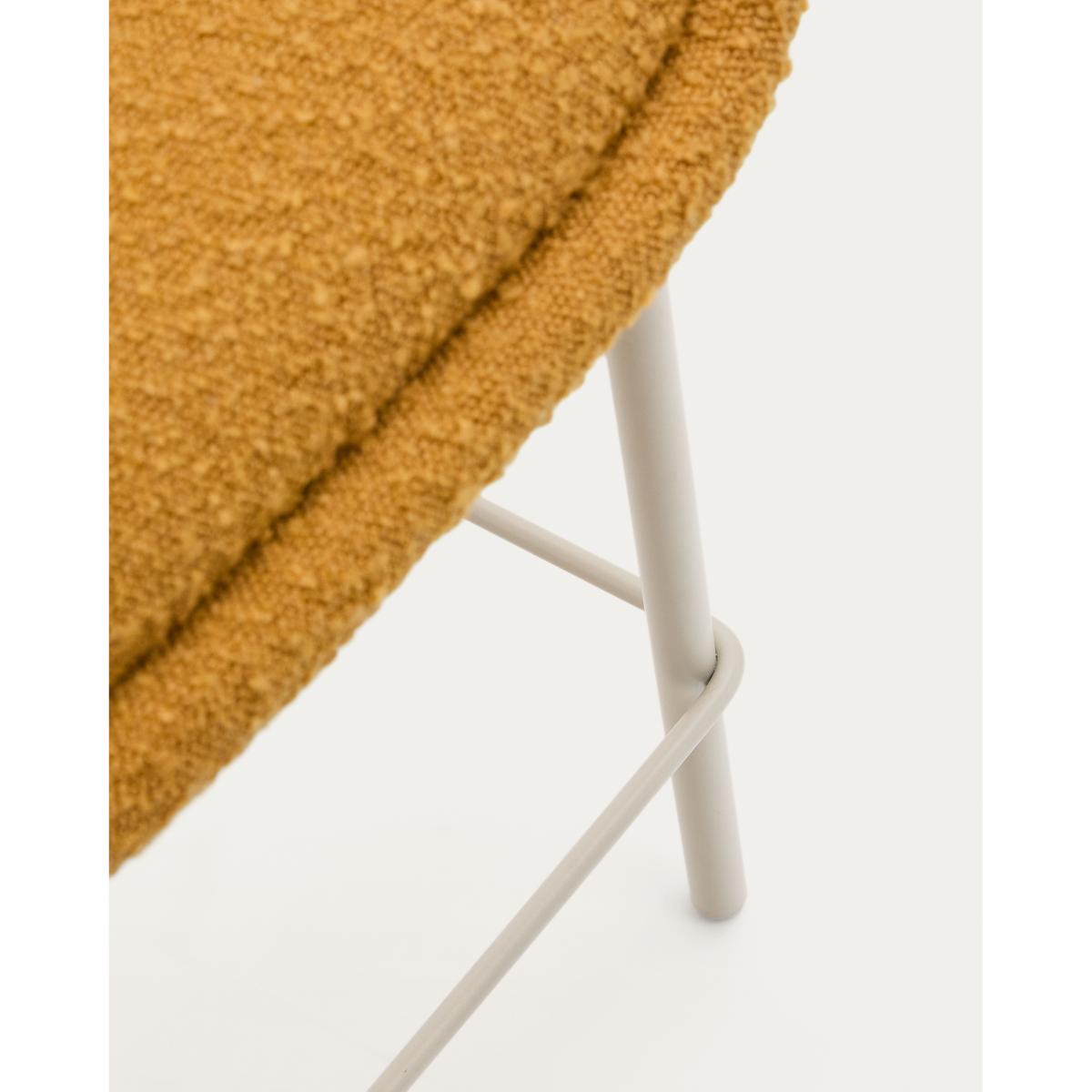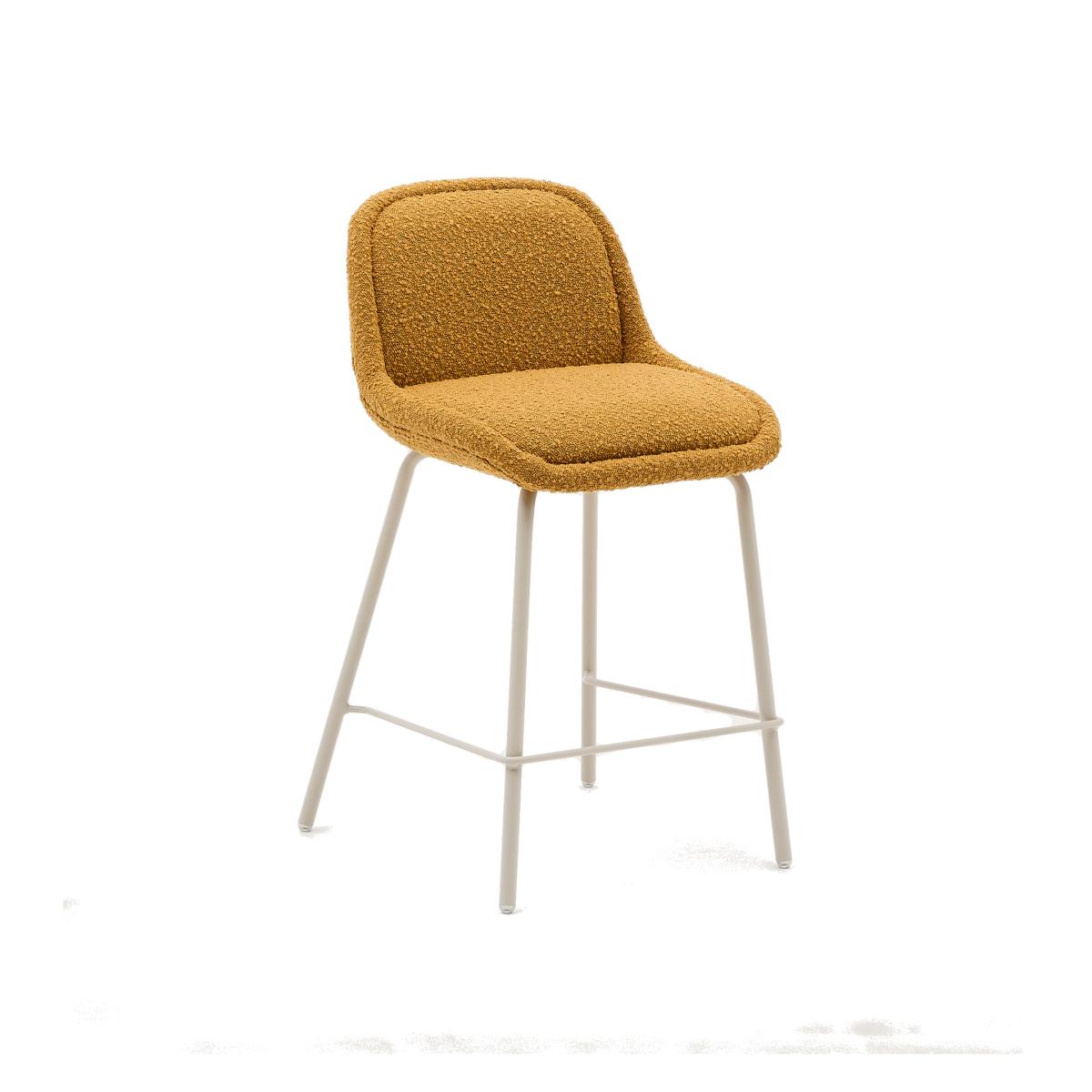 I really like this Aimin stool for its versatility and tactile appeal. The mustard bouclé fabric adds a cosy, inviting texture that works particularly well in contemporary or mid-century inspired interiors, whether in kitchen islands, breakfast bars or even as a decorative side piece in living spaces. Its neutral steel legs with a beige paint finish give it a subtle, modern touch that can tie into a range of colour schemes. For styling tips, consider pairing it with other warm tones or muted palettes to create a cohesive look, and keep the key to balancing its statement fabric with simpler surroundings. This piece is practical too, offering comfort and height at 65cm, making it perfect for everyday use or occasional seating in a variety of home settings.