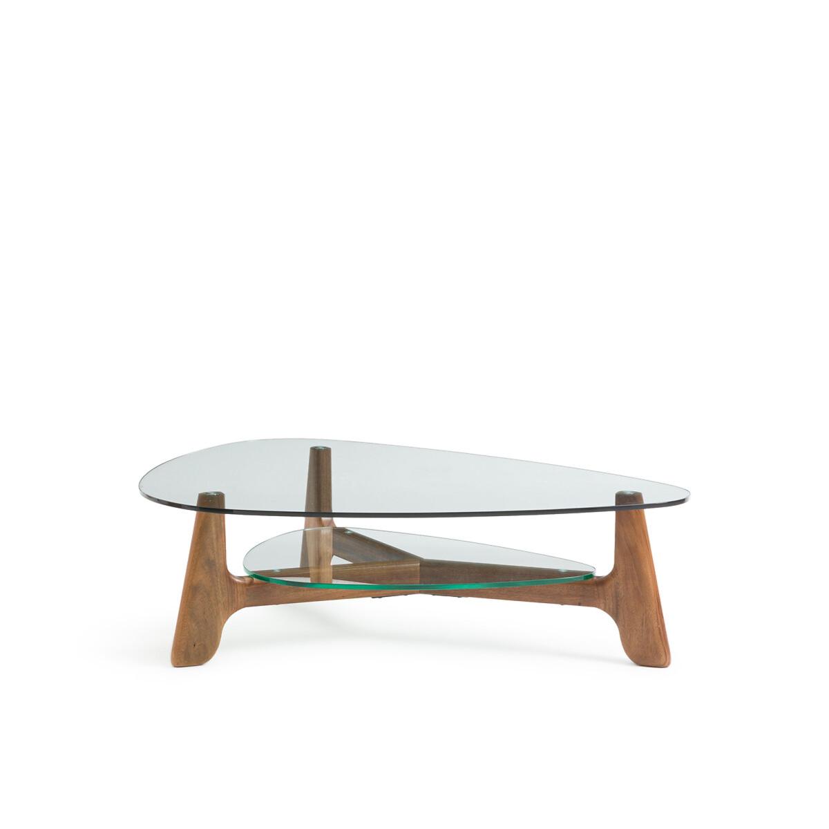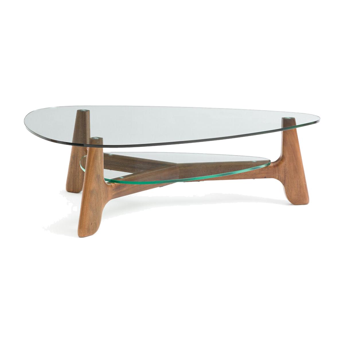 Elegant and sculptural. The Aiole coffee table plays on transparency with its 2 organically shaped tempered glass tops that reveal a solid walnut base with a geometric design. Placée au centre de l’attention, elle invite à la convivialité.