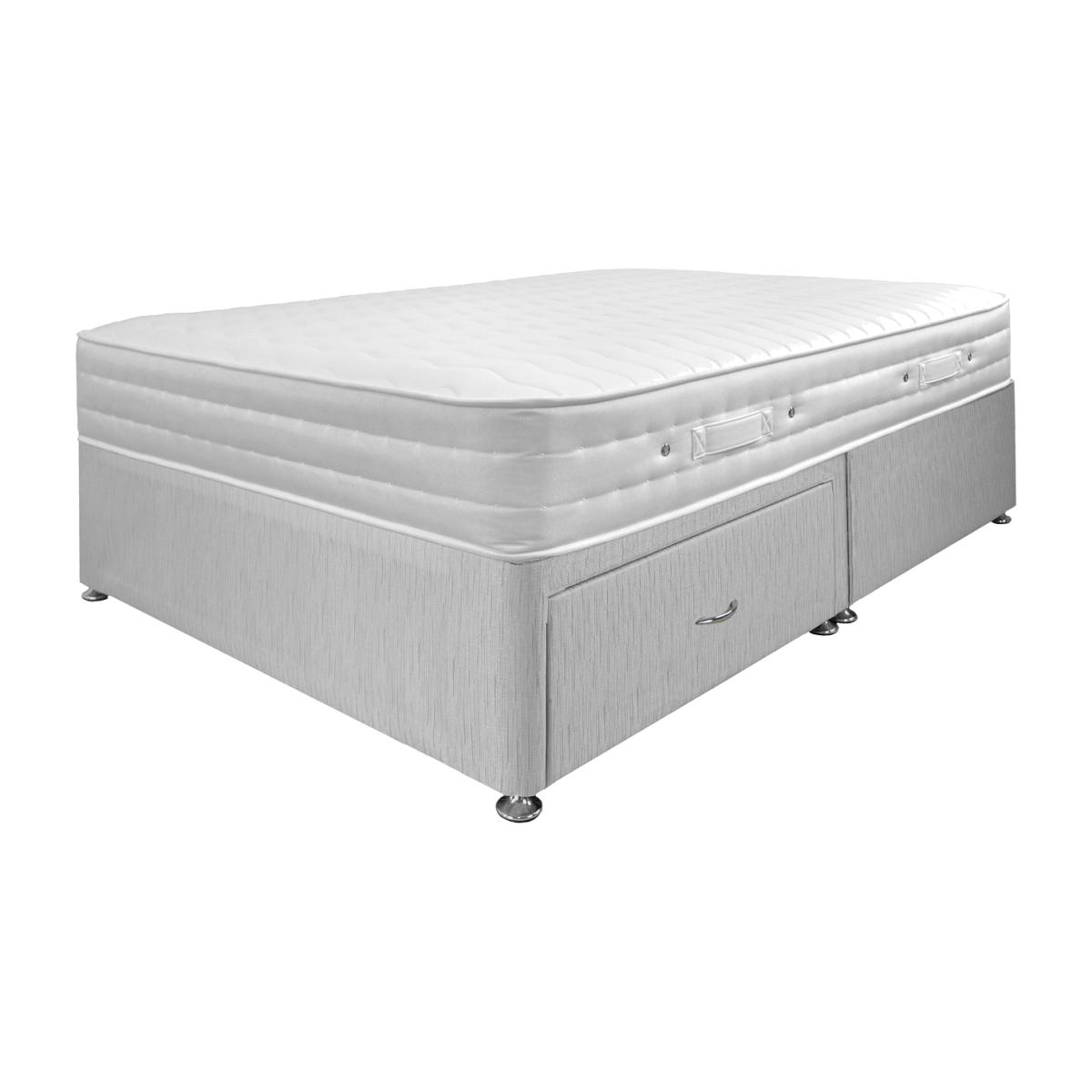 The Aria 1000 Memory divan bed set with 2 storage drawers features a mattress with sublime 30mm layer of heat sensitive memory foam which moulds to your contours as you sleep, offering excellent comfort. The memory foam layer sits above individually pocketed springs that give a superior level of support just where your body needs it most. Generous layers of cushioning sit beneath the soft knitted fabric sleeping surface for an exquisite sleeping experience. To complete the set, of sturdy all-timber construction, the divan base is made using the very best materials and demonstrates the highest standards of workmanship. Stylish silver glides add a touch of extra class to finish the look. Matching Utah headboard available separately.