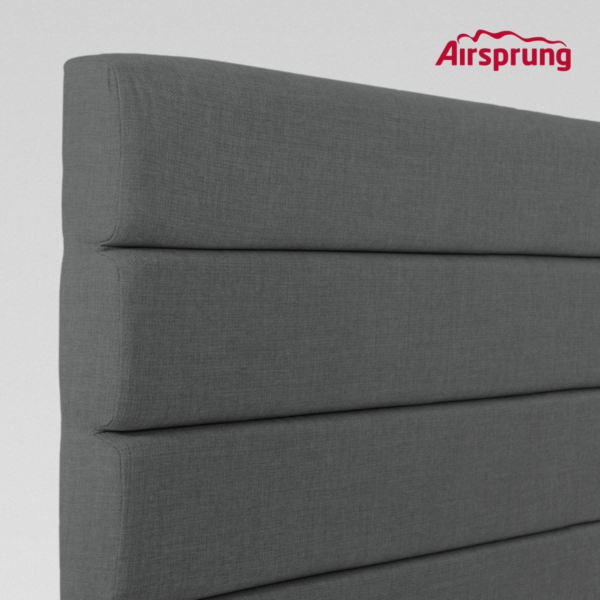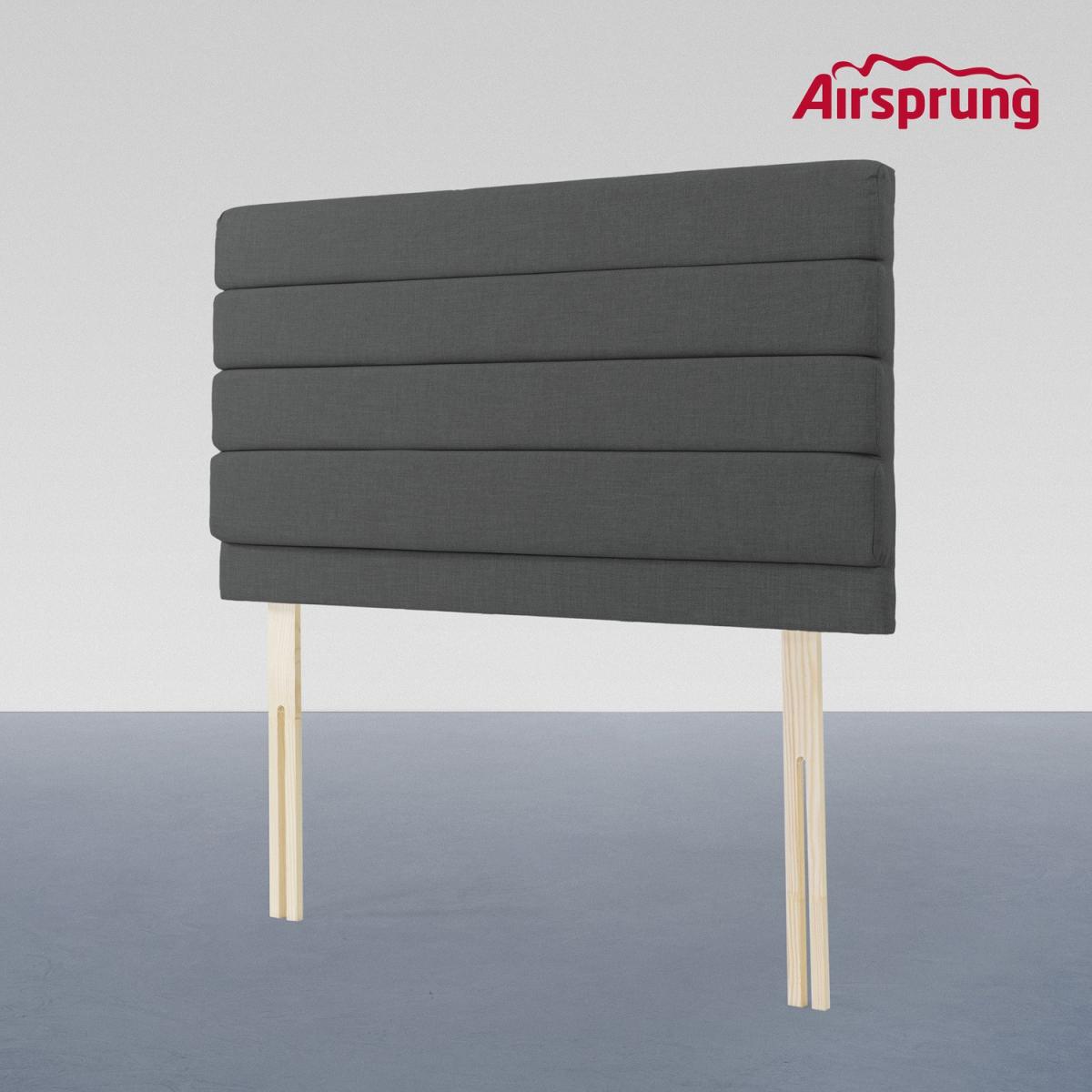 Dimensions H71 x W135 x D5.5cm Features. Colour Charcoal. Usage Designed for all types of divan beds. Surface Linoso linen-feel upholstery fabric. Padded for comfort Height adjustable wooden struts Strutted and upholstered this signature Airsprung model is highly versatile and designed to co-ordinate with our divan range - also fits almost all divan bases. A highly popular horizontal panel theme which is both elegant and practical. Designed with a contemporary feel it is equally at home in a bedroom with either a high or lower ceiling - and because of its proportions doesn’t overpower the space. Available in Linoso linen-look fabric in a choice of two colours deep Midnight Blue or our always-popular cool Charcoal Grey Thoughtfully created to be the perfect accompaniment to our mattresses or divan base DELIVERY RESTRICTIONS . Please note we are only able to ship Airsprung to UK Mainland postcodes. We are unable to ship to Ireland Northern Ireland Scottish Highland or the Channel Islands. .