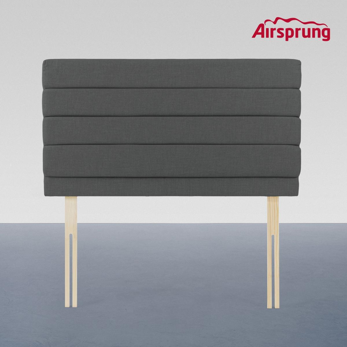 Dimensions H71 x W150 x D5.5cm Features. Colour Charcoal. Usage Designed for all types of divan beds. Surface Linoso linen-feel upholstery fabric. Padded for comfort Height adjustable wooden struts Strutted and upholstered this signature Airsprung model is highly versatile and designed to co-ordinate with our divan range - also fits almost all divan bases. A highly popular horizontal panel theme which is both elegant and practical. Designed with a contemporary feel it is equally at home in a bedroom with either a high or lower ceiling - and because of its proportions doesn’t overpower the space. Available in Linoso linen-look fabric in a choice of two colours deep Midnight Blue or our always-popular cool Charcoal Grey Thoughtfully created to be the perfect accompaniment to our mattresses or divan base DELIVERY RESTRICTIONS . Please note we are only able to ship Airsprung to UK Mainland postcodes. We are unable to ship to Ireland Northern Ireland Scottish Highland or the Channel Islands. .