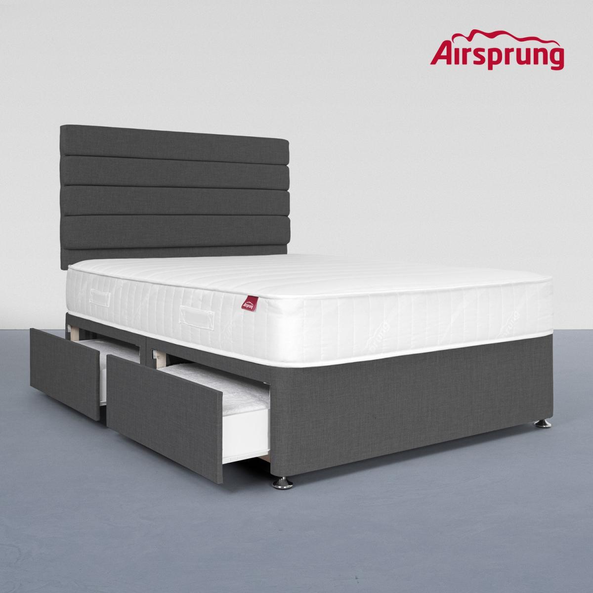 Dimensions H58 x W150 x D200cm Features. Mattress Firmness Medium feel. Comfort layers Contains recycled materials. Sleeping Surface Soft feel knit. Mattress Care Non turn. Matching Headboard available separately Divan Base Wooden frame covered in Linoso linen-feel upholstery fabric Our COMFORT mattress has been designed to be both medium in feel and extremely comfortable. It’s an ideal companion to the stylish and practical Kelston divan base – available in various storage options and two colours. The quilted soft knit sleeping surface sits on top of soft sumptuous 80% recycled polyester fillings for really comfy support. At the heart is our tough Airsprung Supercoil® spring system providing secure support throughout. This COMFORT model is non turn for extra convenience but do rotate it occasionally as it preserves its longevity. DELIVERY RESTRICTIONS . Please note we are only able to ship Airsprung to UK Mainland postcodes. We are unable to ship to Ireland Northern Ireland Scottish Highland or the Channel Islands. .