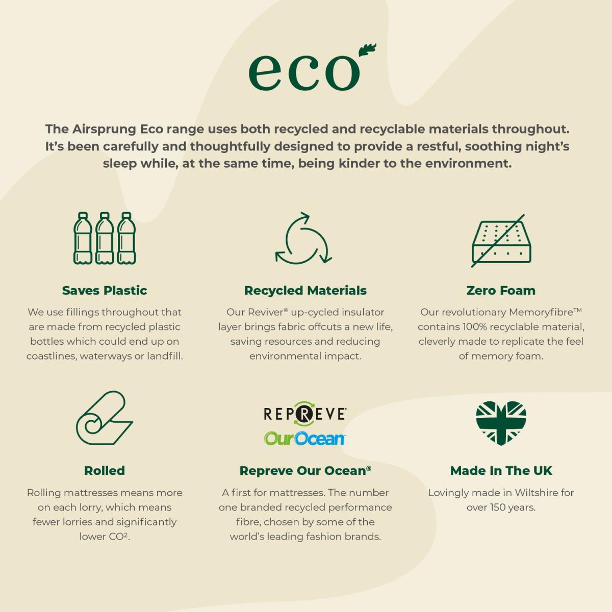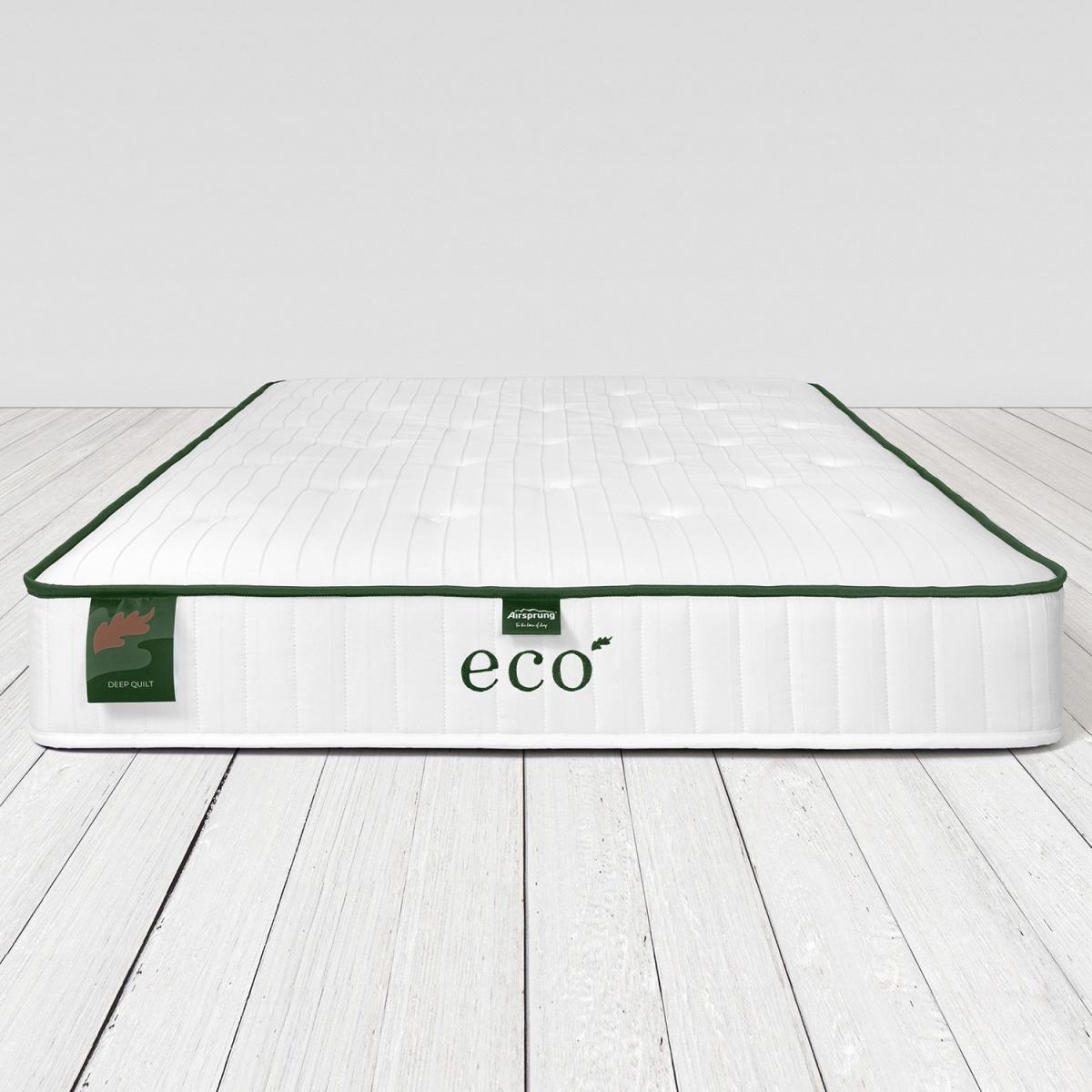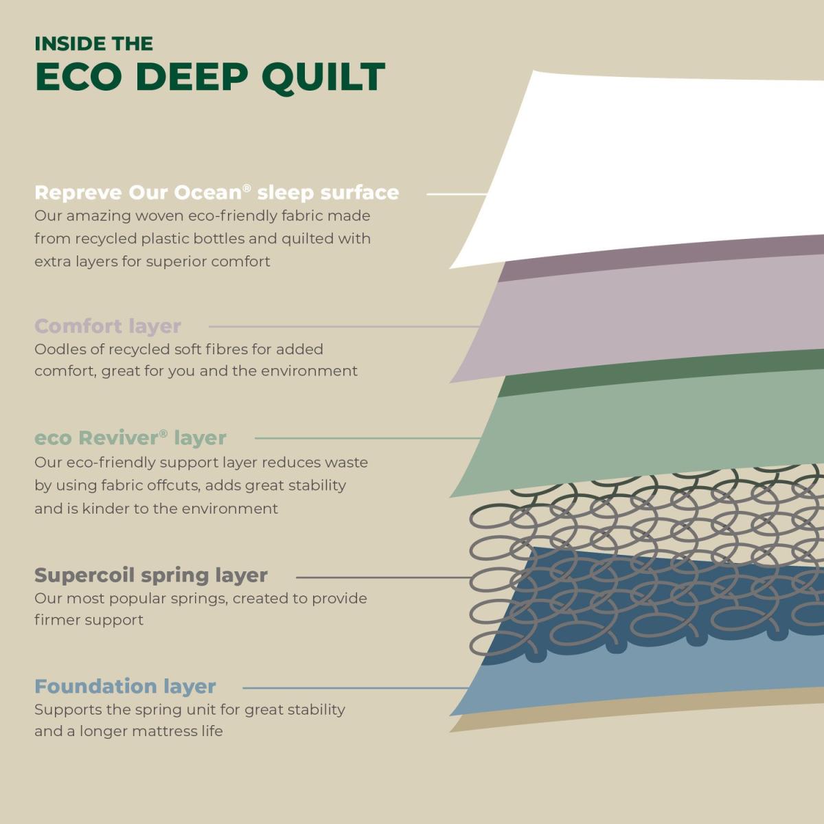 Coil Sprung Firmness Mattress Depth Tufted Recycled Fibres Rolled 5 Year Warranty Made in UK Quilted Features we love A medium firm mattress with supportive Memoryfibre™ Airsprung Supercoil® springs evenly distribute weight Eco-friendly with 100% REPREVE® Our Ocean™ woven fabric Reviver™ insulator layer made of recycled fabric off-cuts Designed, manufactured, and tested in the UK All about me Part of their Eco range, Deep Quilt by Airsprung not only offers an ultra-comfy sleeping experience but has been created using sustainable materials. It is a non-turn mattress, too, thanks to the layers arranged for maximum comfort and durability, and it comes vacuum-packed and rolled, all and all, with convenience in mind. It features soft polyester fillings, of which 80% is recycled plastic, and an insulation layer made of 100% recycled fabric. The surface REPREVE®, our Ocean™ woven fabric, is made from 100% ocean-bound plastic such as bottles at risk of ending up in the ocean- collected within 50km of the coast and waterways in regions that don't have developed waste or recycling systems, which is the first of its kind for mattresses. Finally, an environmentally friendly mattress at an affordable price. Need to know Dimensions:W150 x H21 x L200 cm Packed weight: 24.05kg Rolled dimensions: W39 x H39 x L156 cm Size: Standard UK King-size (5ft) Comfort: Medium to firm Type: Coil sprung Filling: Memoryfibre™ (100% recyclable material), Polyester (80% recycled plastic) with Reviver™ insulator layer (100% recycled soft fabric offcuts) Top finish: REPREVE® Our Ocean™ woven fabric Warranty: 1 year Please note: This product cannot be delivered to postcodes starting with KW, IV, PA, BT, AB, DD, EX, GY, HS, JE, PH, PL, SA, TA, TQ,TR and ZE.