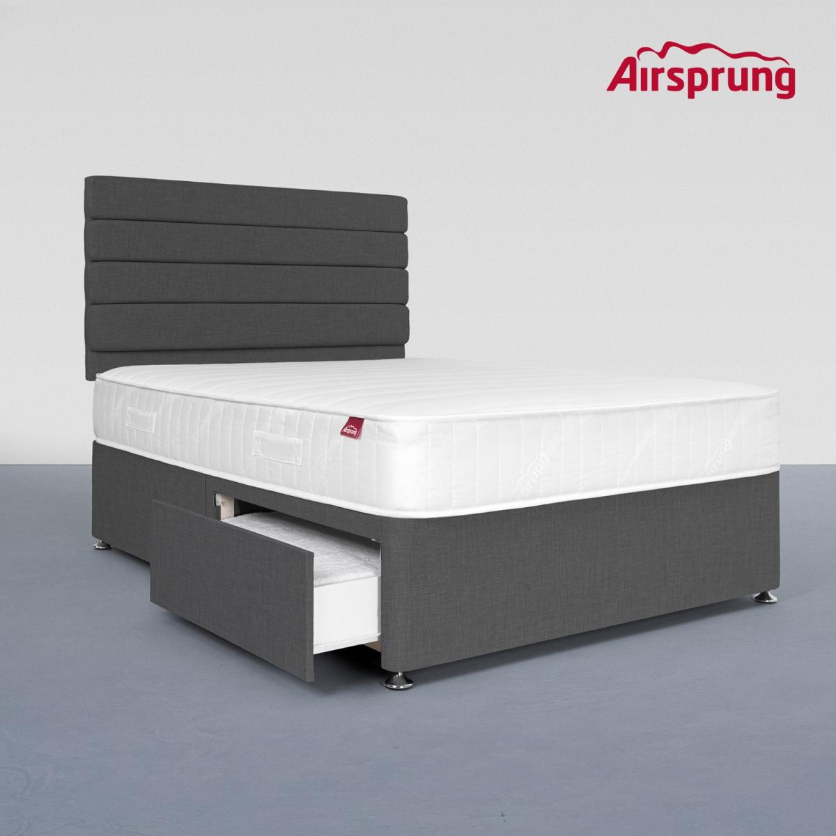 Dimensions H62 x W120 x D190cm Features. Mattress Firmness Medium/soft feel. Comfort layers Contains recycled materials. Sleeping Surface Soft feel knit. Mattress Care Non turn. Matching Headboard available separately Divan Base Wooden frame covered in Linoso linen-feel upholstery fabric Cleverly 1000 movement-reducing individual mini pocket springs sit on top of Airsprung’s Supercoil® spring system. So that’s double springs in one mattress! Available here with the Kelston divan base with a choice of various storage options and two designer-chosen colours. This HYBRID model has soft sumptuous 80% recycled polyester fillings and is non turn for extra convenience; do rotate it occasionally as it preserves its longevity. DELIVERY RESTRICTIONS . Please note we are only able to ship Airsprung to UK Mainland postcodes. We are unable to ship to Ireland Northern Ireland Scottish Highland or the Channel Islands ..