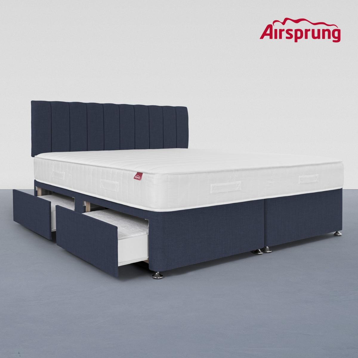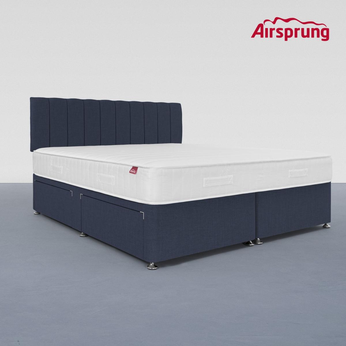 Dimensions H62 x W180 x D200cm Features. Mattress Firmness Medium/soft feel. Comfort layers Contains recycled materials. Sleeping Surface Soft feel knit. Mattress Care Non turn. Matching Headboard available separately Divan Base Wooden frame covered in Linoso linen-feel upholstery fabric Cleverly 1000 movement-reducing individual mini pocket springs sit on top of Airsprung’s Supercoil® spring system. So that’s double springs in one mattress! Available here with the Kelston divan base with a choice of various storage options and two designer-chosen colours. This HYBRID model has soft sumptuous 80% recycled polyester fillings and is non turn for extra convenience; do rotate it occasionally as it preserves its longevity. DELIVERY RESTRICTIONS . Please note we are only able to ship Airsprung to UK Mainland postcodes. We are unable to ship to Ireland Northern Ireland Scottish Highland or the Channel Islands ..