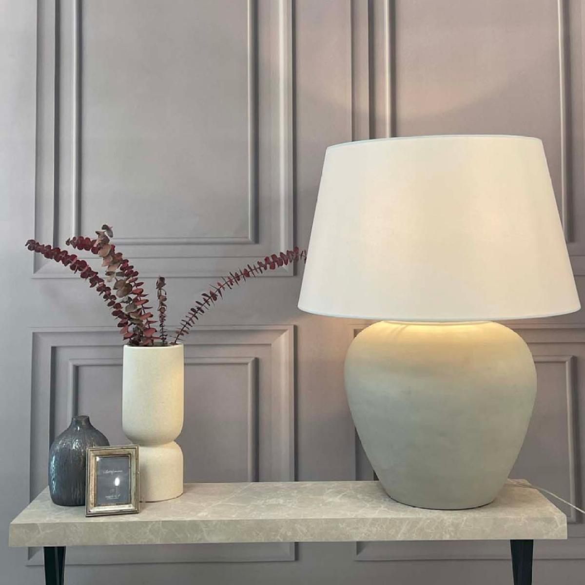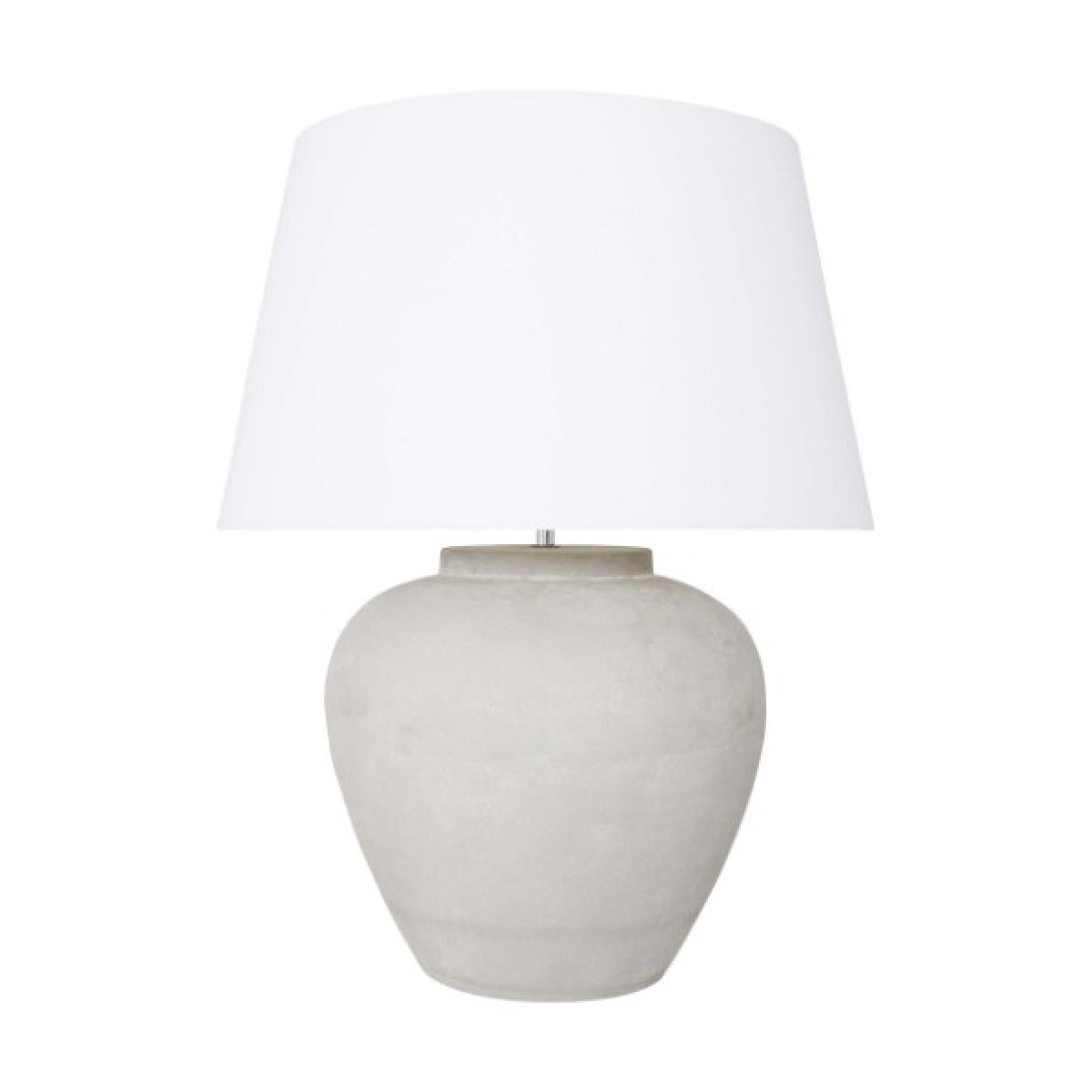 Modern cement effect table lamp featurinhg a circular white shade. The Aitana is a statement table lamp featuring a modern cement effect base and white circular shade. This fabulous lamp is a must have for any hallway or lounge..