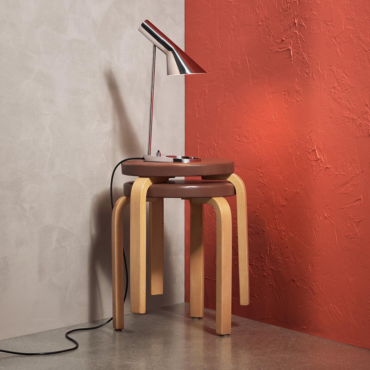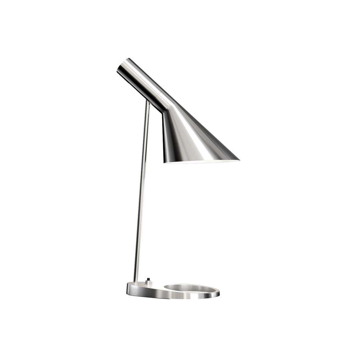 The iconic AJ Table Lamp was designed by Arne Jacobsen in 1957 for Copenhagen's SAS Royal Hotel and is available in its original stainless steel finish by Louis Poulsen. Two geometric shapes allow the shade to direct light exactly where needed, making the AJ a perfect task or reading light. Crafted from stainless steel and moulded zinc, the inside of the shade is painted white for soft, comfortable light and the angle is fully adjustable to the user's needs. The rounded base was originally intended for nestling ashtrays and can now be used for small plant pots or trinket holders. The sculptural lamp is produced by Louis Poulsen, a Danish lighting manufacturer founded in 1874. Through collaborations with renowned designers such as Arne Jacobsen, Louis Poulsen has established itself as one of the leading architectural lighting producers in the world. Requires: 1x max. E27 60W bulb (not included).