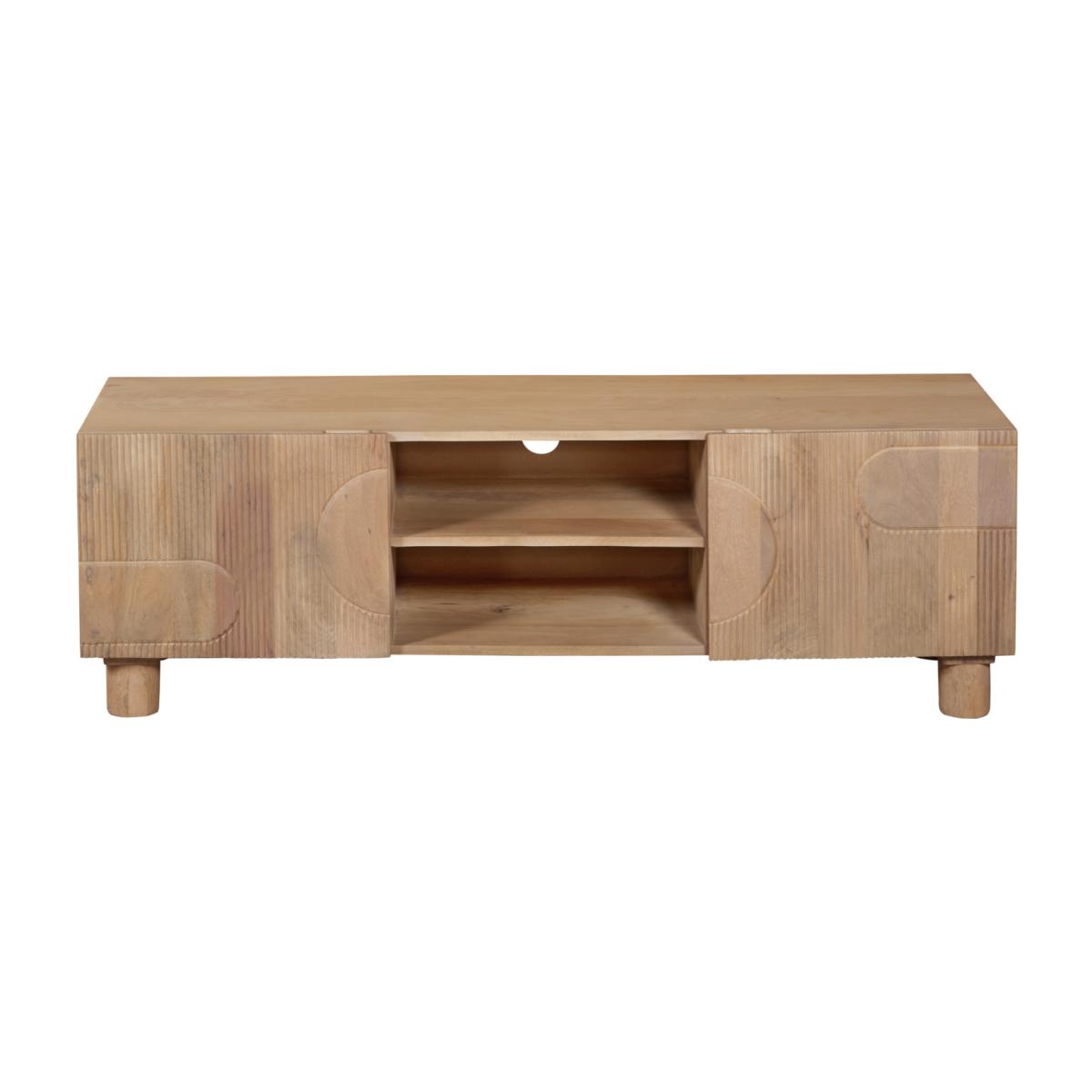 This TV cabinet is a statement piece that effortlessly blends modern aesthetics with rustic charm. Its fluted design and eye-catching pattern make it a conversation starter, while its light brown finish adds a touch of warmth to any space. Crafted from durable mango wood, this piece offers ample storage with a single shelf and is sure to elevate your decor.