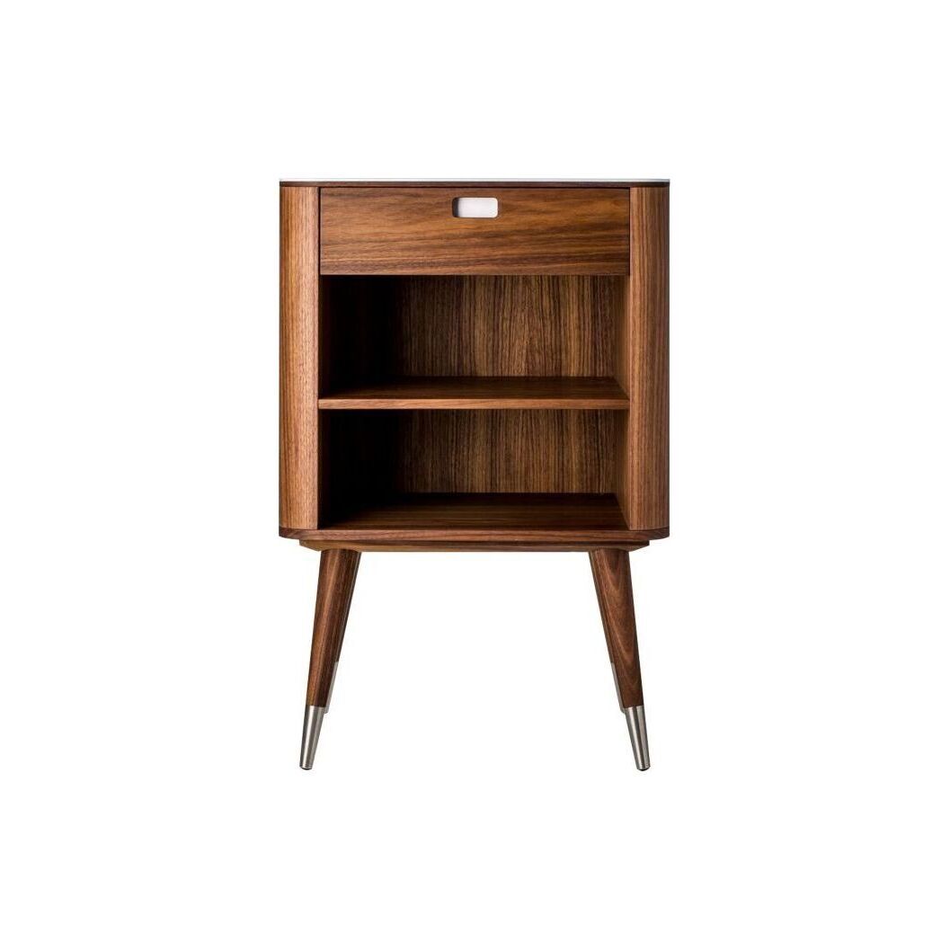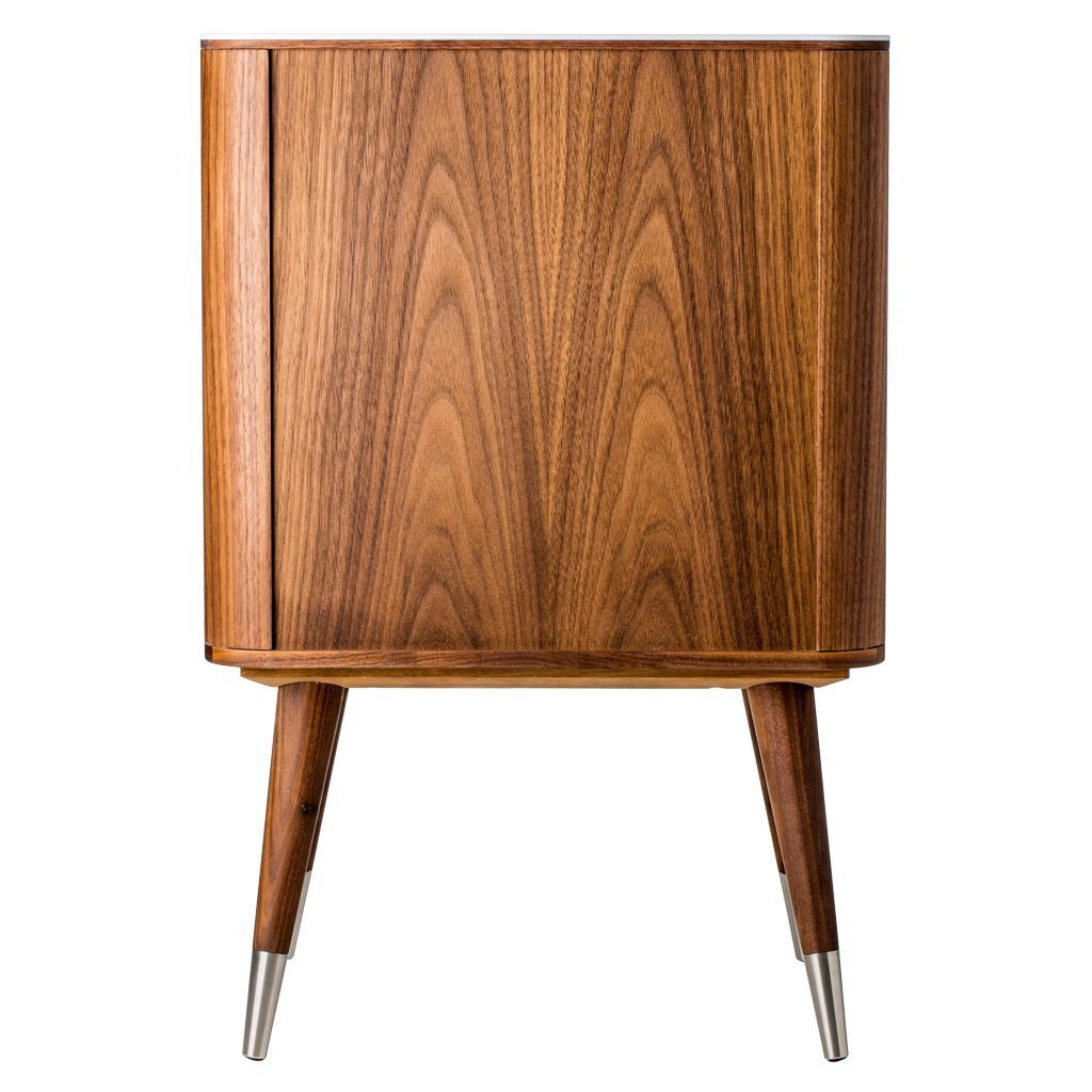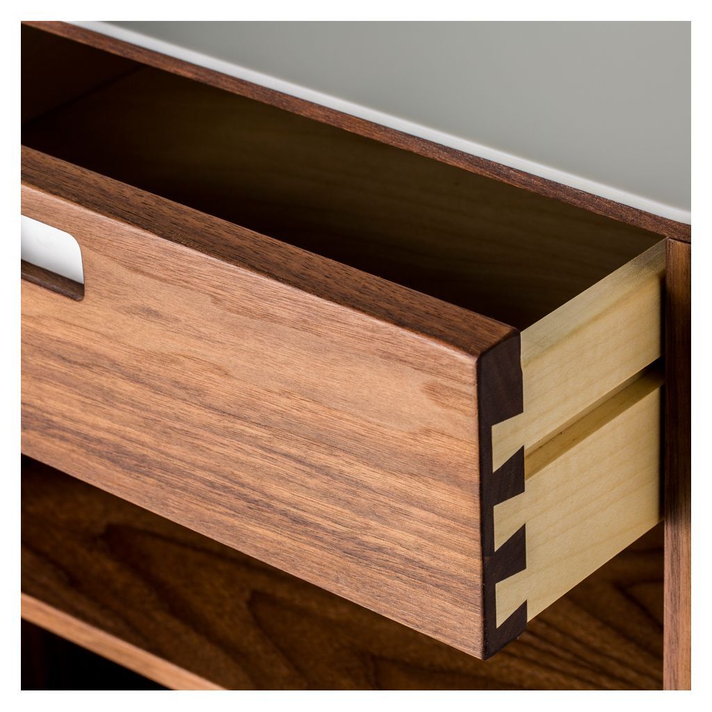 Designed by Soren Nissen and Ebbe Gehl for Naver Collection, the sophisticated walnut AK 2405 Bedside Table is crafted with functionality in mind, featuring a single drawer with two open storage compartments and a striking white corian surface. Crafted in Denmark from solid walnut wood, the AK 2405 Bedside Table beautifully references mid-century Scandinavian style, with steel-capped tapered legs and a corian insert handle on its pull-out drawer. Featuring a contrasting distinctive glacier white corian top, the bedside table provides a surface that is strong, resistant to scratches and staining and easily wipes clean. Finished with steel feet, the retro-inspired slender legs and the uniquely grained wood create a sense of effortless style and practical design that makes for an inspiring bedroom space.