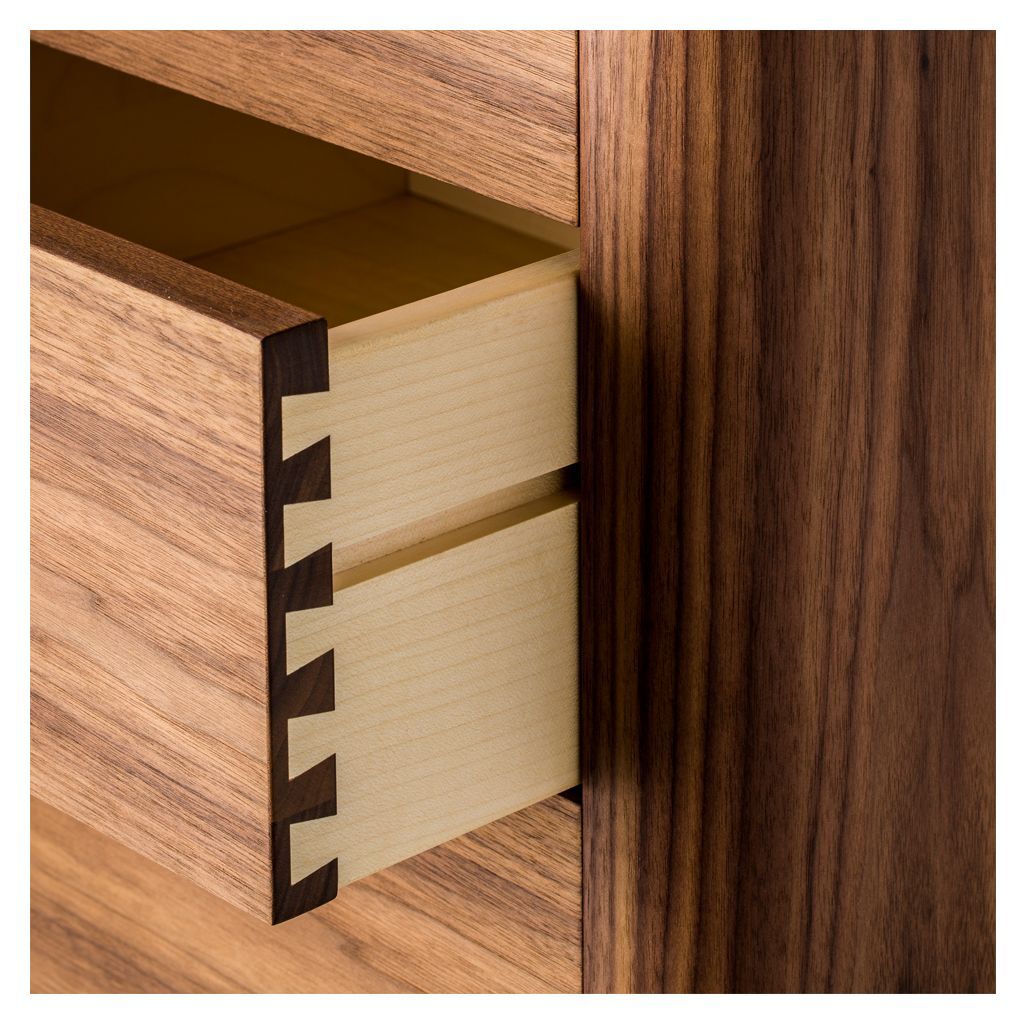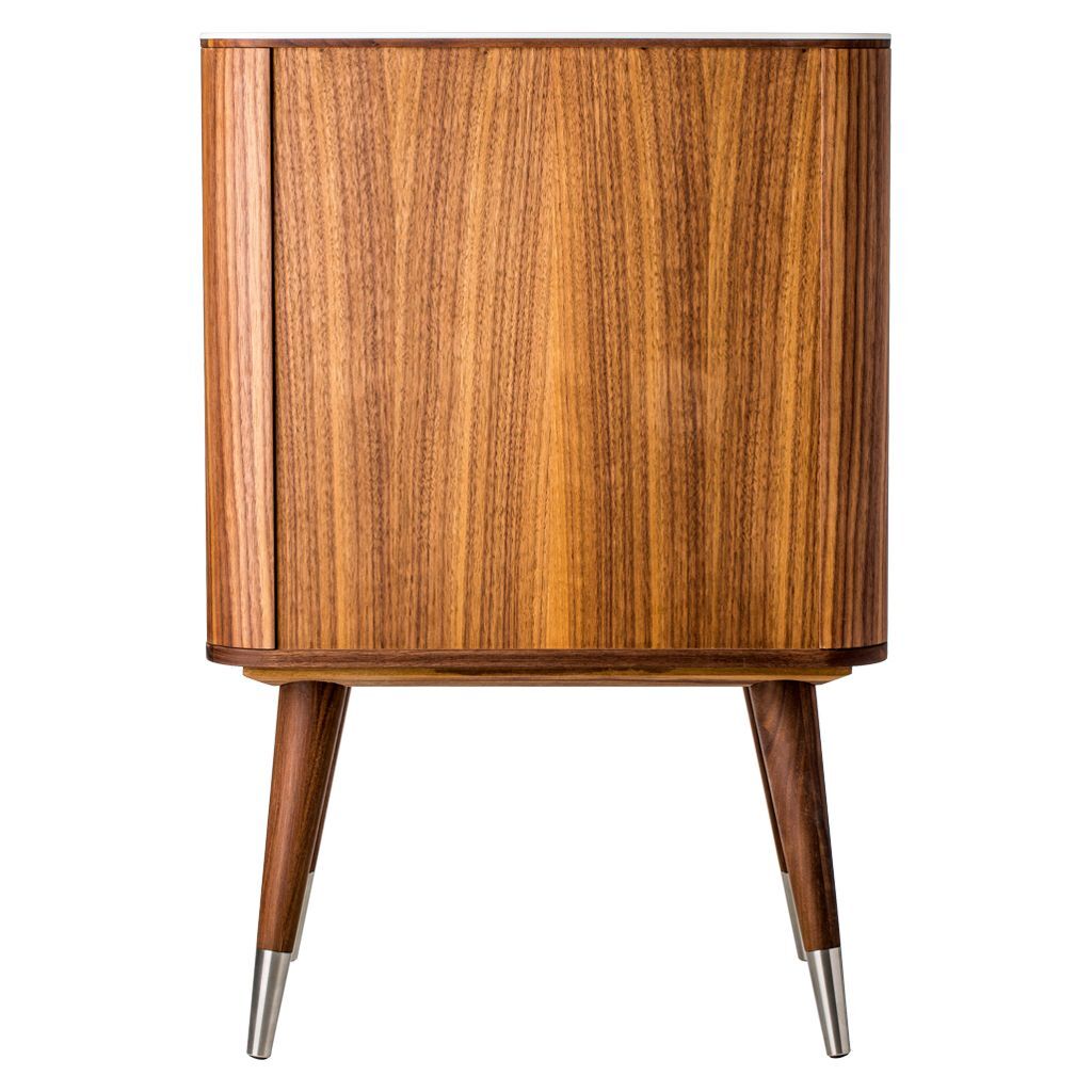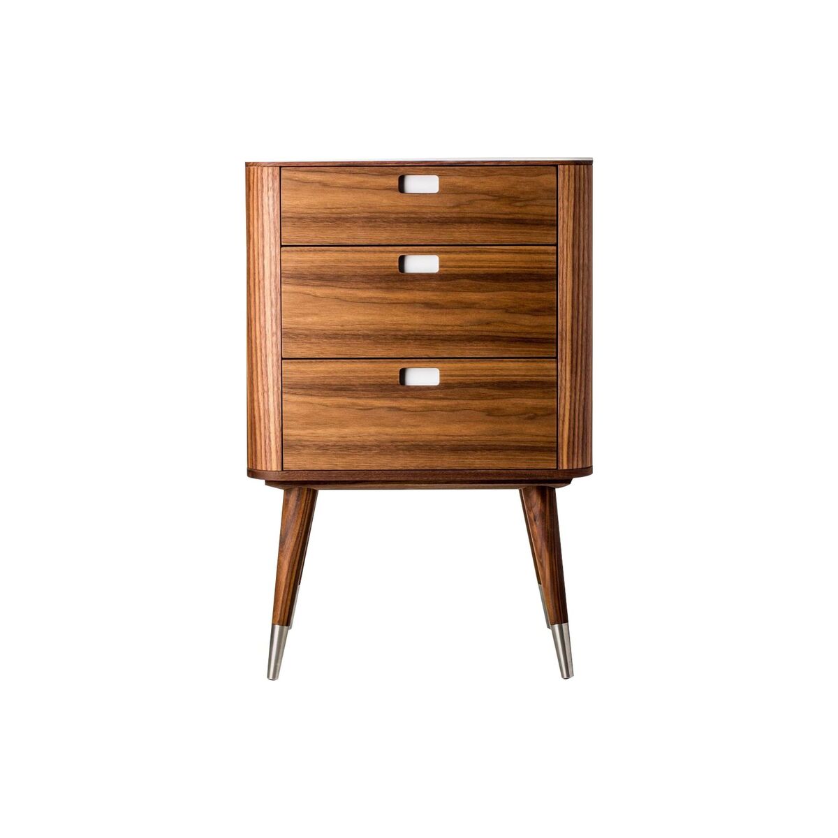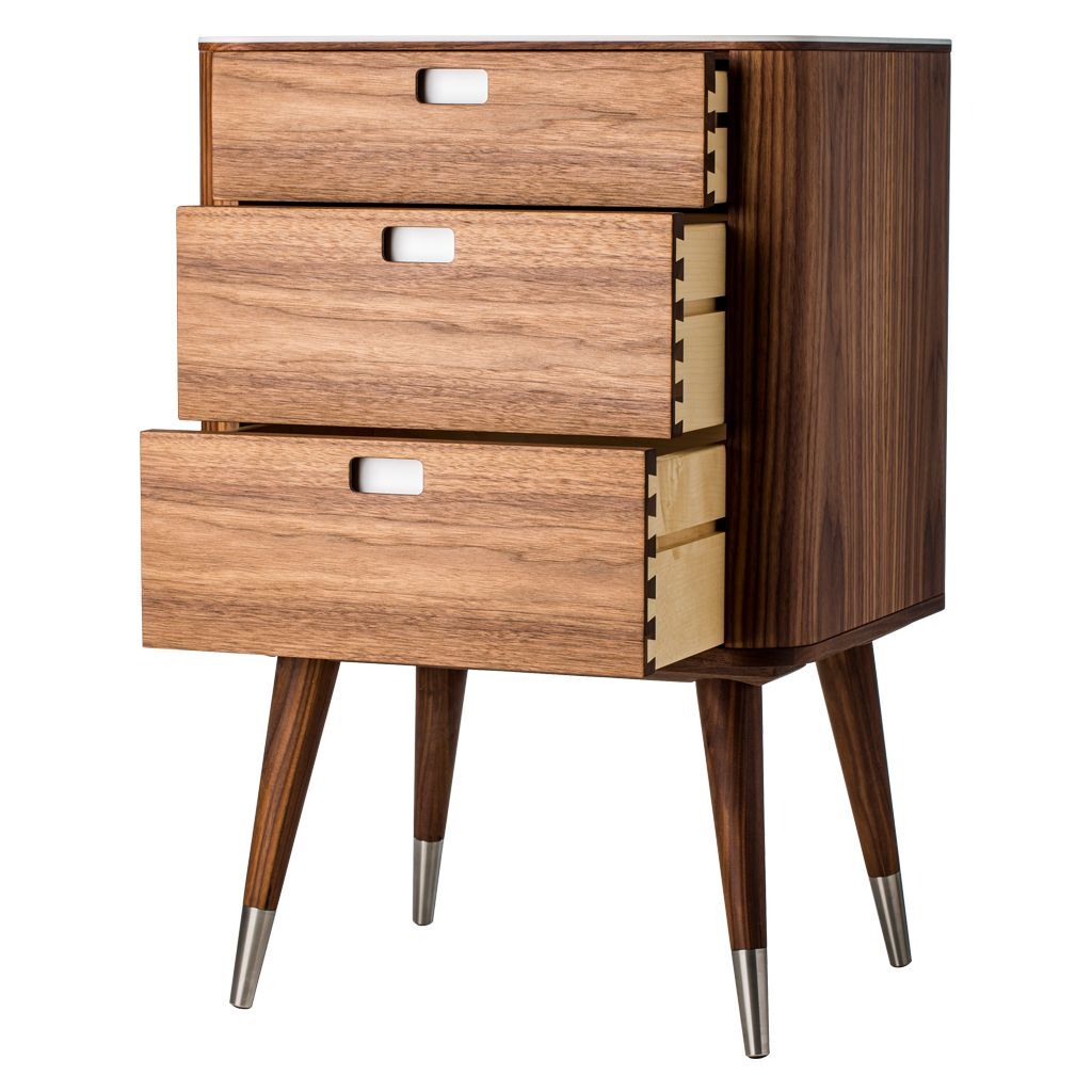 Designed by Soren Nissen and Ebbe Gehl for Naver Collection, the sophisticated walnut AK 2410 Bedside Table is crafted with functionality in mind, featuring three drawers and a striking white corian surface. Crafted in Denmark from solid walnut wood, the Bedside Table's corian insert handles on each of its three drawers offers a refined finish for the ultimate bedroom furniture. Featuring a contrasting distinctive glacier white corian top, the bedside table provides a surface that is strong, resistant to scratches and staining and easily wipes clean. Beautifully references mid-century Scandinavian style, the steel-capped tapered legs alongside the uniquely grained wood create a sense of effortless style and practical design that makes for an inspiring bedroom space.