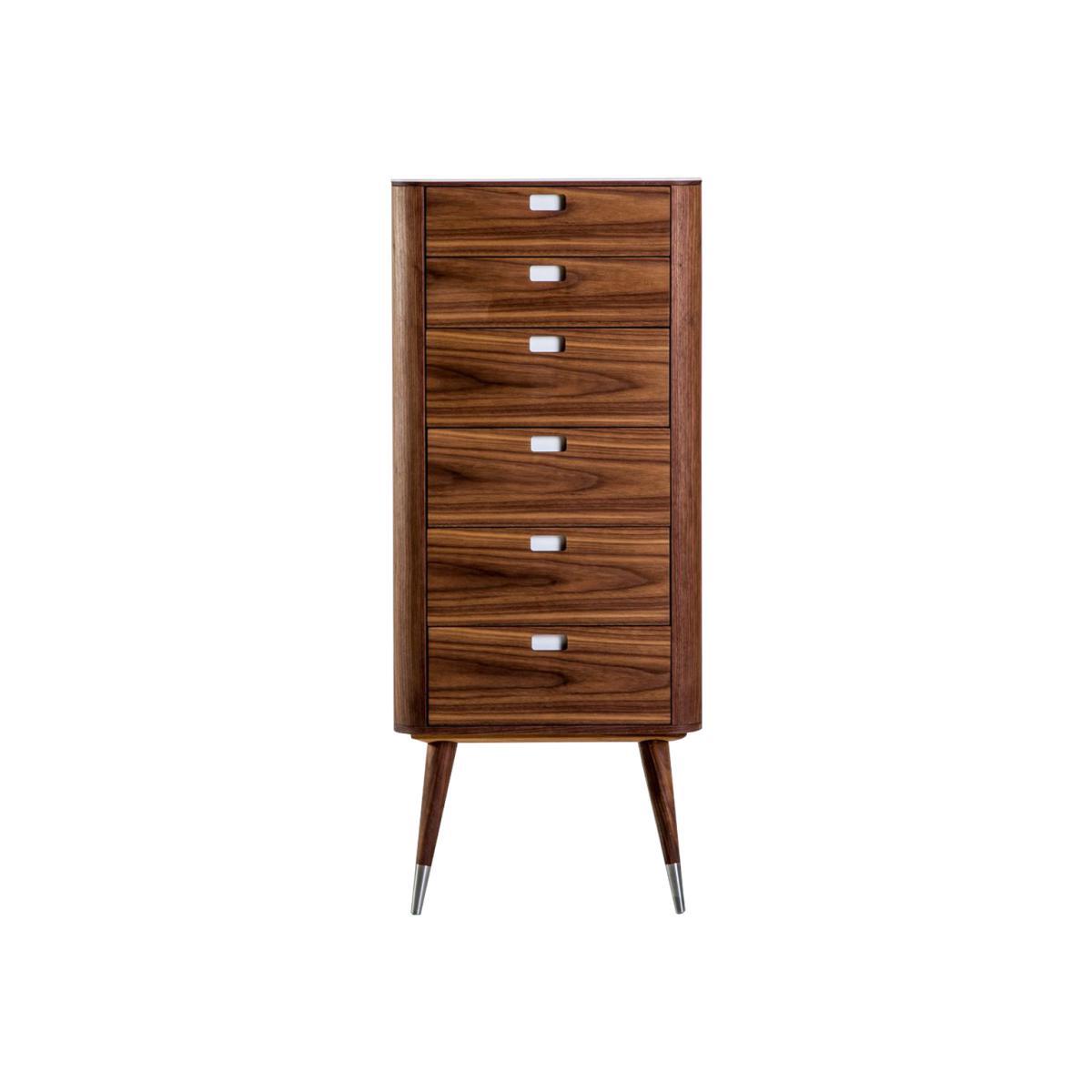 Designed by Soren Nissen and Ebbe Gehl for Naver Collection, the sophisticated walnut AK 2420 Tallboy chest of drawers is crafted with functionality in mind, featuring six drawers and a striking white corian surface, a perfect storage solution for stylish decors. Crafted in Denmark using solid walnut, the chest of drawers beautifully references mid-century Scandinavian style, with steel-capped tapered legs and a corian insert handle on each pull-out drawer, with finger-joint joinery for an impeccable finish. Featuring a contrasting distinctive glacier white corian top, the Tallboy chest of drawers provides a surface that is strong, resistant to scratches and staining and easily wipes clean. The unit's retro-inspired slender legs alongside the uniquely grained wood create a sense of effortless style and practical design that makes for an inspiring bedroom space.