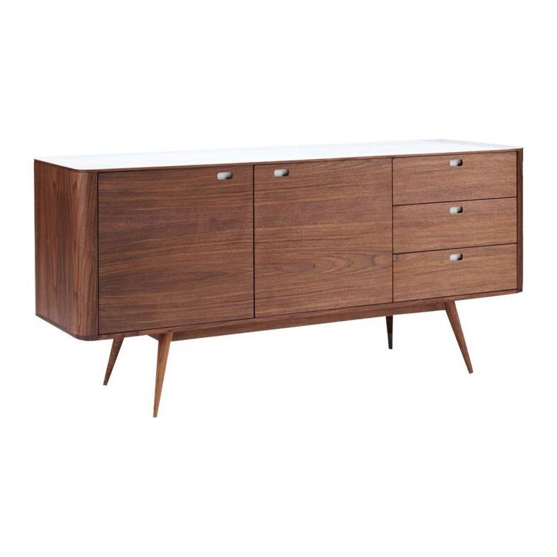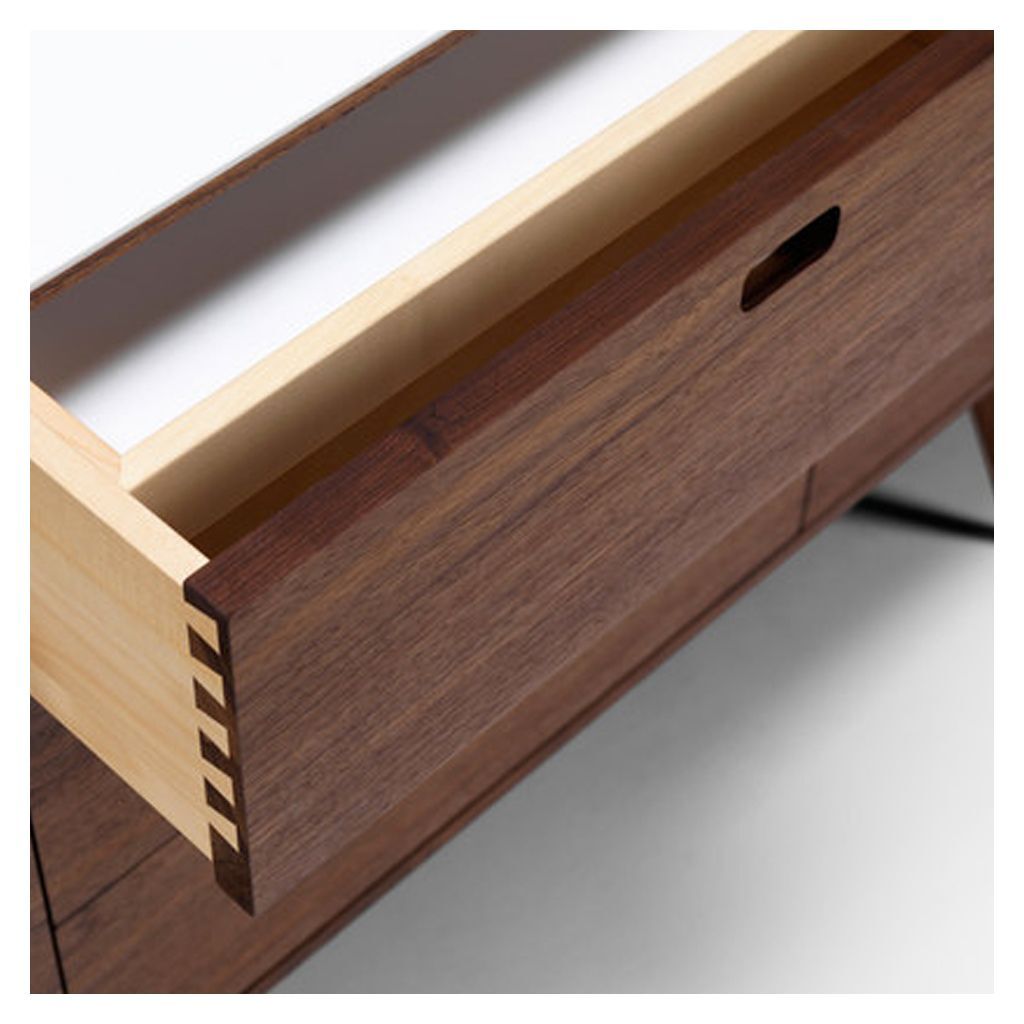 Designed by Soren Nissen and Ebbe Gehl for Naver Collection, this sophisticated AK 2630 Sideboard was crafted in Denmark from solid American walnut; the natural deep hue of the wood gives it a classic feel, beautifully referencing mid-century Scandinavian style. The unique grain of the timber creates a striking contrast between the distinctive glacier white corian top, which provides a display surface that is strong, resistant to scratches and staining and easily wipes clean. The sideboard has integrated drawers made for storing tableware and glassware, the removable maple tray is perfect for serving food and drinks directly when entertaining, without having to worry about spills. The sideboard's retro-inspired slender legs and the uniquely grained wood create a sense of effortless style and practical design that makes for an inspiring bedroom space. Complete the look with the coordinating dining table. Please note: The character of the solid walnut wood will change and develop over time, and would benefit from regular oil treatments.