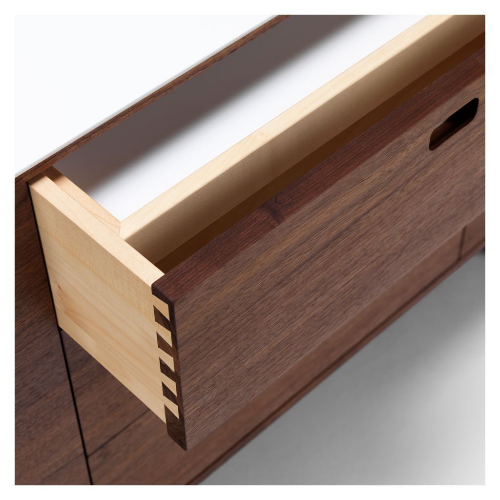 Designed by Soren Nissen and Ebbe Gehl for Naver Collection, this sophisticated AK 2660 Large Sideboard was crafted in Denmark from solid American walnut; the natural deep hue of the wood gives it a classic feel, beautifully referencing mid-century Scandinavian style. The unique grain of the timber creates a striking contrast between the distinctive glacier white corian top, which provides a display surface that is strong, resistant to scratches and staining and easily wipes clean. The large walnut sideboard has integrated drawers made for storing tableware and glassware and the removable maple tray is perfect for serving food and drinks directly when entertaining, without having to worry about spills. Finished with steel-capped feet, the sideboard's retro-inspired slender legs fuse perfectly with the uniquely grained wood to create a sense of effortless style and practical design that makes for an inspiring space. Please note: The character of the solid walnut wood will change and develop over time, and would benefit from regular oil treatments.