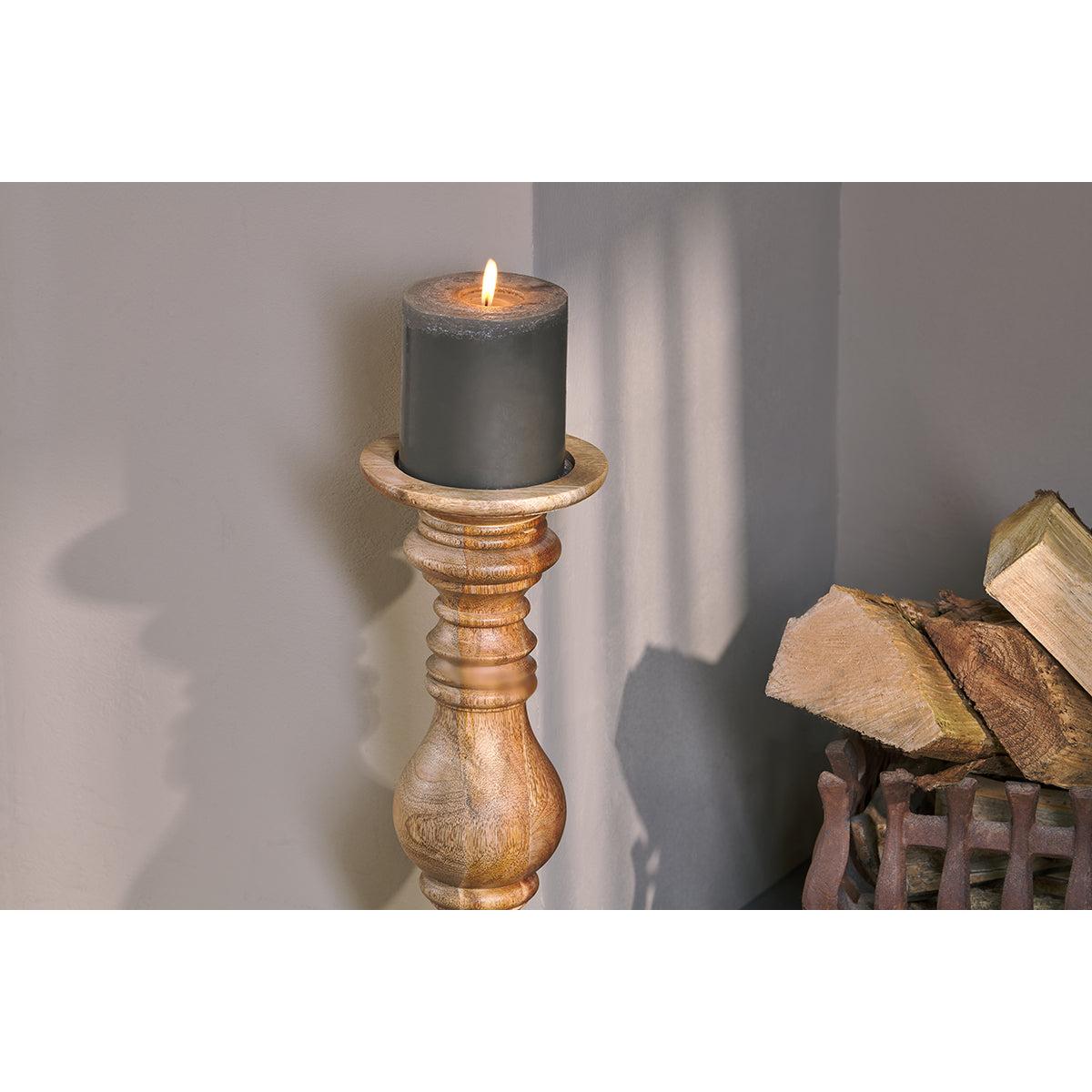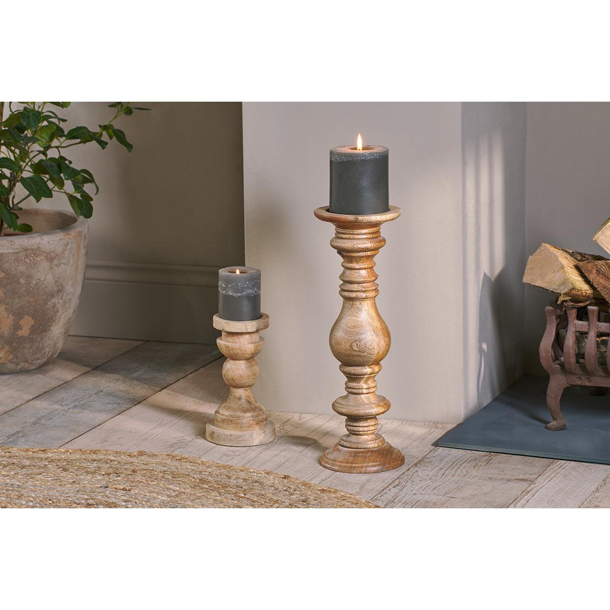 Dress your fireplace with these tall wooden candlestick holders. Each chunky wooden candle stick is hand turned by skilled artisans from sustainable mango wood. They look beautiful with a church candle on top.