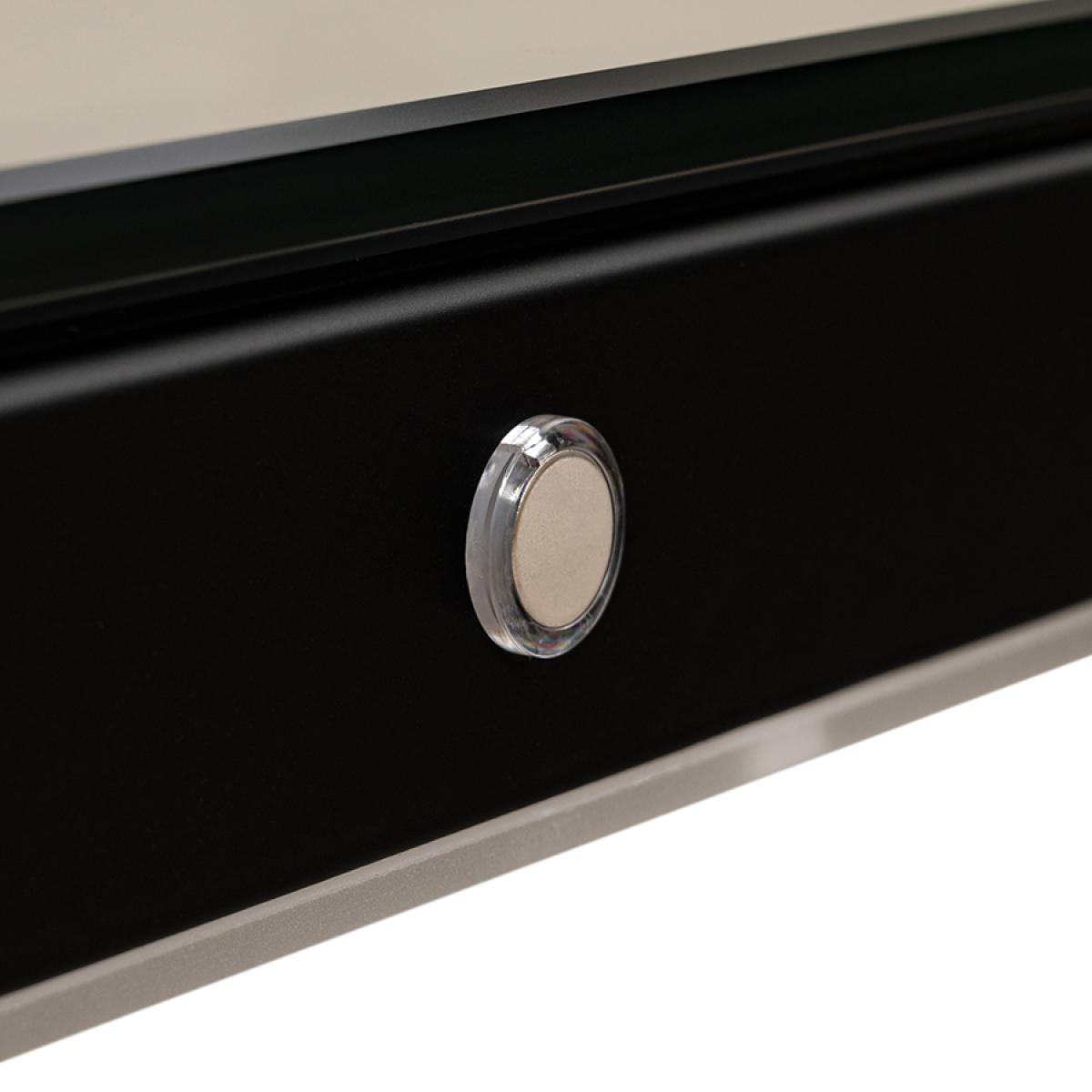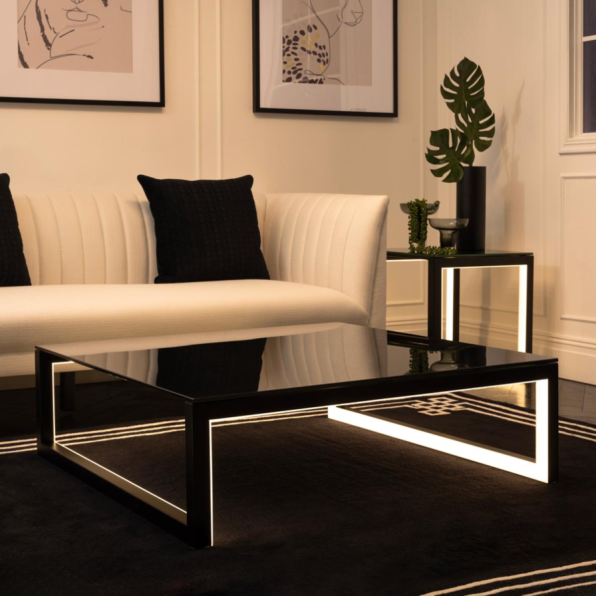 A sleek, unique and eye-catching coffee table with built-in lighting. Chunky toughened black glass surface. Black powder coated steel base with internal LED light source and frosted acrylic diffusers. On/off/dimmer touch switch operation. Warm, neutral and cool colour temperature settings. Rechargeable via detachable USB cable ( supplied). Will provide continuous illumination for up to 48 hours when fully charged.